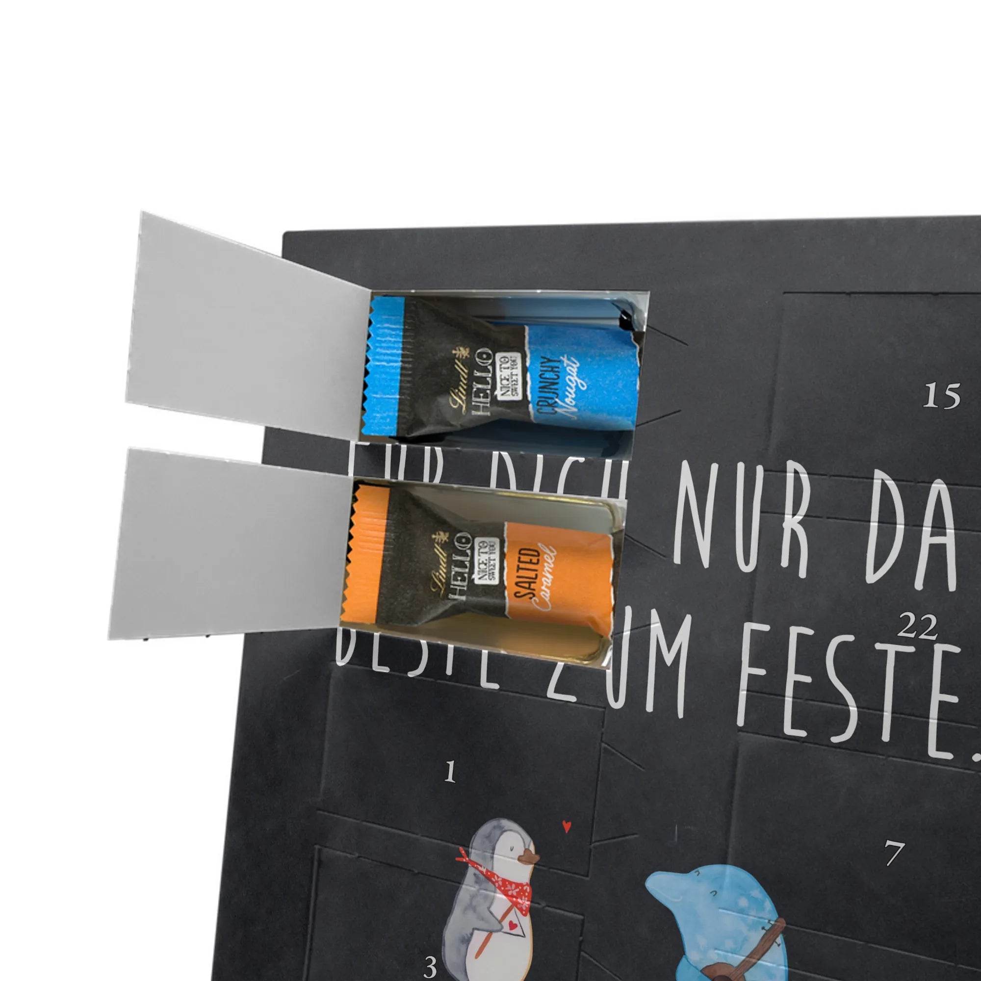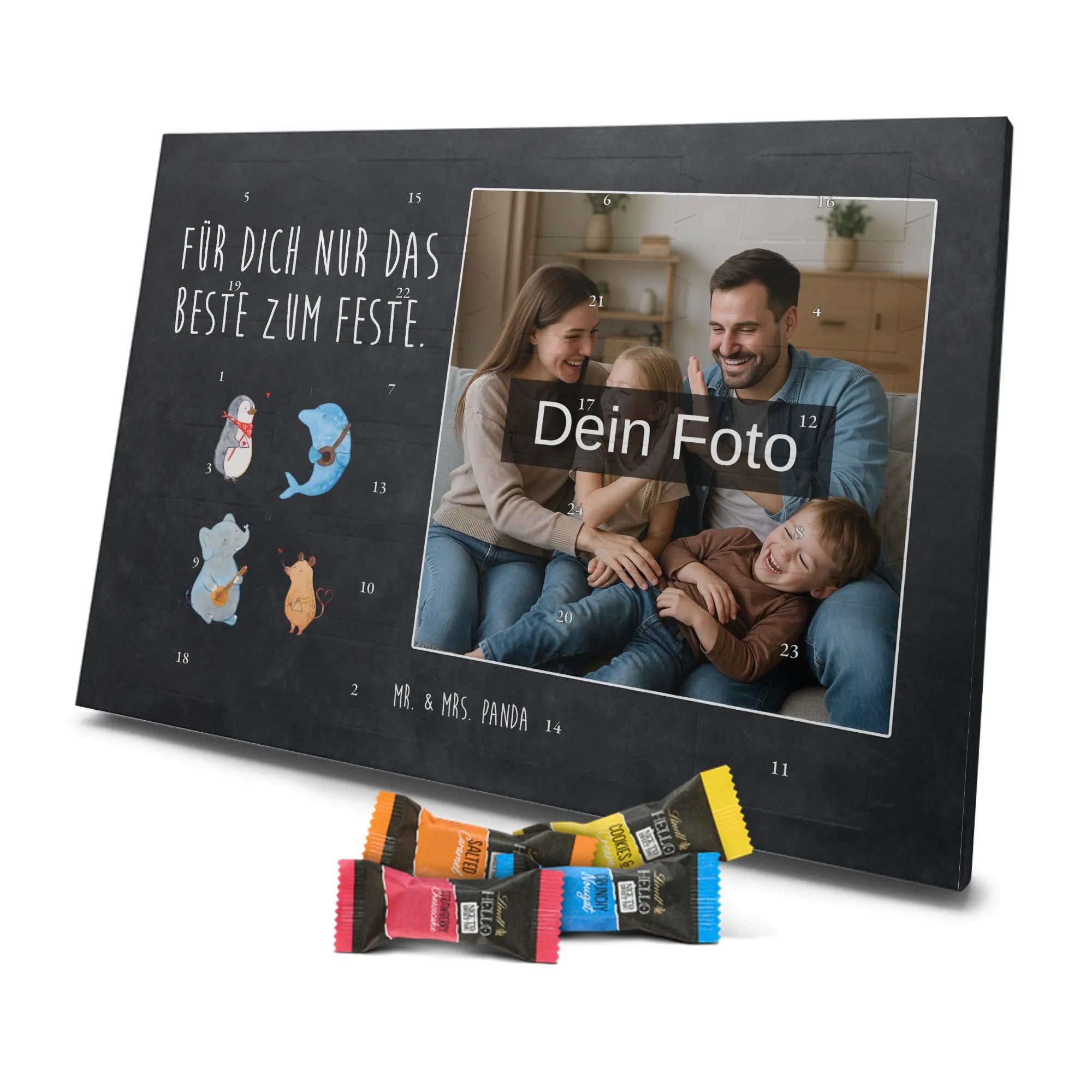 Mach die Adventszeit persönlich mit unserem Personalisiertes Schoko Foto-Adventskalender von Mr. & Mrs. Panda. Dieser Kalender kombiniert dein Lieblingsfoto mit unseren fröhlichen Illustrationen und liebevollen Sprüchen – perfekt als Geschenk für Partner, Familie oder Freunde. Für ein optimales Druckergebnis bitte ein hochauflösendes Bild verwenden und den Bildausschnitt so wählen, dass wichtige Details nicht verloren gehen. Beachte, dass wir Fotos nicht nachbearbeiten oder zuschneiden; lade nur Bilder hoch, für die du die Rechte besitzt. Die hochwertige Verarbeitung beinhaltet eine seidenmatte Oberflächenveredelung und bedruckte Seitenflächen, außerdem ist der Kalender robust und kann aufgehängt oder aufgestellt werden. Maße: 233 mm x 178 mm x 24 mm. Gefüllt mit Lindt Lindor Markenschokolade: 24 einzeln verpackte Kugeln in den Sorten Vollmilch, Feinherb und Weiße Schokolade. Inhaltsstoffe und Allergene sind angegeben; es kann Haselnüsse und Mandeln enthalten. Hinweis: Personalisierte Foto-Artikel sind vom Umtausch ausgeschlossen. Ein süßer, persönlicher Adventsgruß von Mr. & Mrs. Panda.