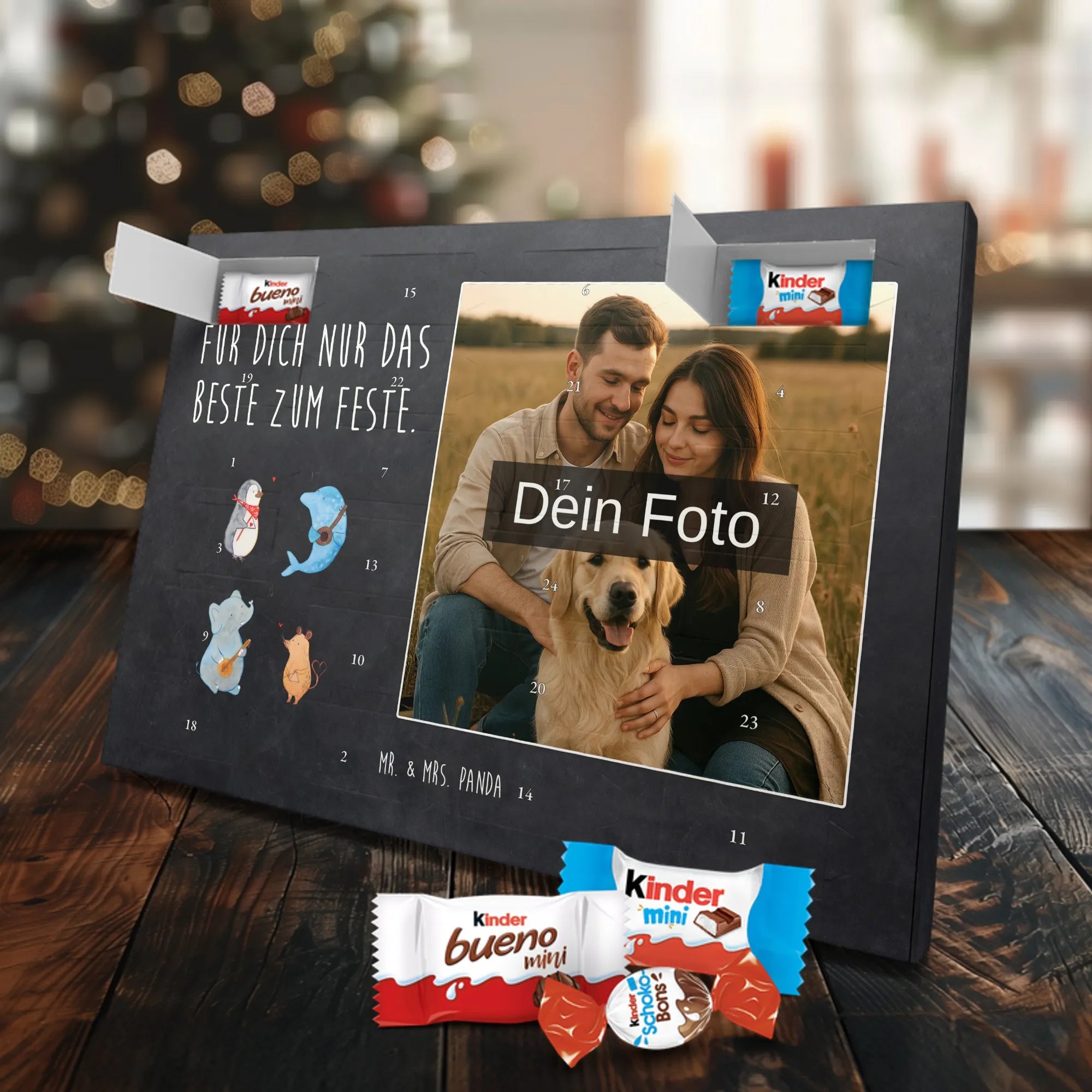🐼 Personalisierter Schoko-Foto-Adventskalender mit deinem Bild, Mr. & Mrs. Panda Motiven und gefüllt mit kinder® Schokolade.