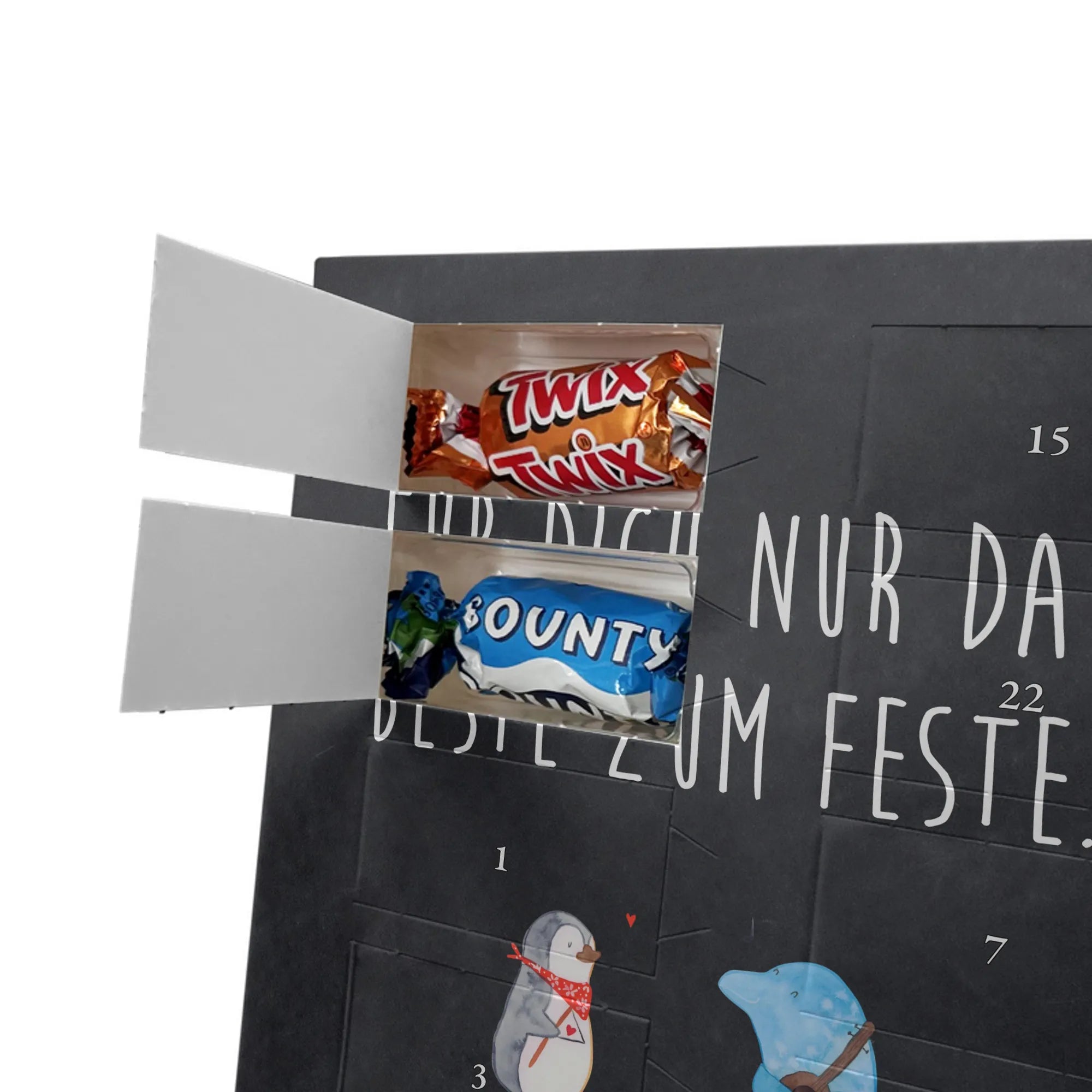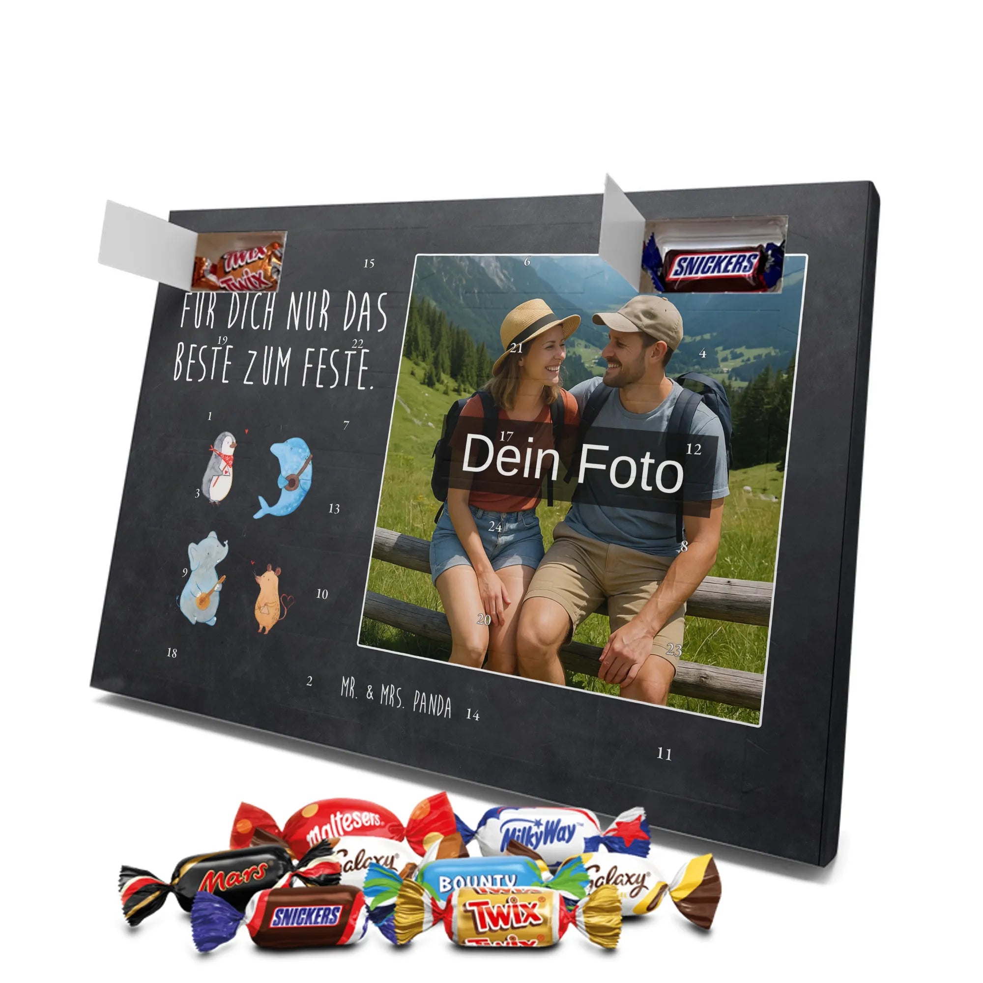 Lustiger Personalisierter Schoko Foto-Adventskalender – das Must-have für eine persönliche Adventszeit von Mr. & Mrs. Panda. Jeder Kalender wird mit unseren charmanten Illustrationen und liebevollen Sprüchen bedruckt, während dein Foto die Vorderseite einzigartig macht. Achte bitte darauf, ein Foto mit guter Qualität und ausreichend hoher Auflösung hochzuladen, damit der Druck gestochen scharf wirkt. Überprüfe den Bildausschnitt, damit wichtige Bereiche nicht verloren gehen. Denk daran, nur Bilder zu verwenden, bei denen du die nötigen Rechte besitzt. Die Verarbeitung ist hochwertig: brillante Druckqualität mit seidenmatter Oberflächenveredelung und bedruckten Seitenflächen. Maße: 325 mm x 225 mm x 27 mm. Du kannst den Kalender aufhängen oder aufstellen – sehr praktisch. Hinweis: Die hochgeladenen Fotos werden nicht nachbearbeitet oder zugeschnitten; Rücknahme bei personalisierten Foto-Artikeln ist ausgeschlossen. Gefüllt ist der Kalender mit Celebrations Schokolade – 24 Stück in 8 verschiedenen Sorten (Maltesers, Mars, Snickers, Twix, Milky Way, Bounty, Galaxy, Galaxy Caramel). Verschenke ein Stück persönlich gestaltete Vorfreude und mache jeden Dezembertag zu etwas Besonderem.