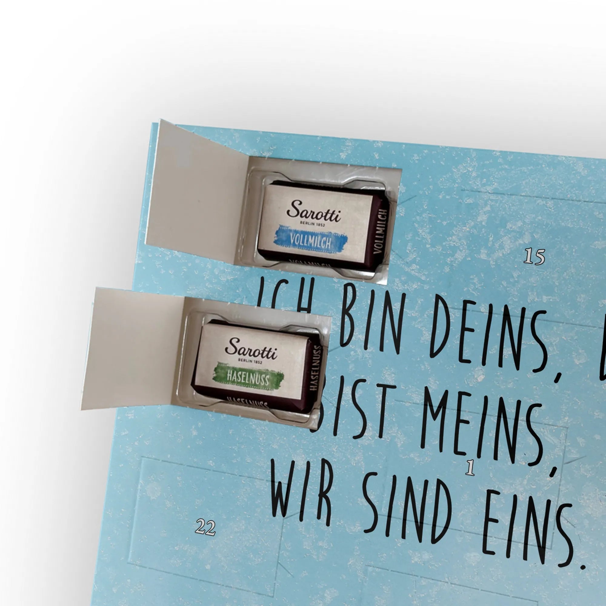 Schoko Foto Adventskalender personalisiert – ein zauberhaftes Geschenk, das Erinnerungen und Geschmack vereint. Mr. & Mrs. Panda haben liebevolle Motive und Sprüche gestaltet, die den Kalender umrahmen; dein Foto setzt die persönliche Note. Für ein optimales Druckbild lade bitte ein Foto mit hoher Auflösung hoch und achte auf einen passenden Bildausschnitt, damit wichtige Details nicht abgeschnitten werden. Bitte nur Bilder verwenden, für die du die Rechte besitzt. Die seidenmatte Oberflächenveredelung sorgt für edle Haptik und die bedruckten Seitenflächen für ein rundum gelungenes Design. Maße: 355 mm x 245 mm x 11 mm – kann aufgehängt oder aufgestellt werden. Wichtiger Hinweis: Wir bearbeiten oder schneiden die Fotos nicht nach; eine Rücknahme personalisierter Foto Artikel ist ausgeschlossen. Gefüllt mit 24 einzeln verpackten Schokoladentäfelchen in den Geschmacksrichtungen Vollmilch, Nougat, Zartbitter und Haselnuss von Sarotti® und Confiserie Heidel®. Insgesamt enthält der Kalender 107 g Markenschokolade. Ideal als Geschenk für Partner, Familie oder Freunde – persönlich, süß und liebevoll verpackt von Mr. & Mrs. Panda.