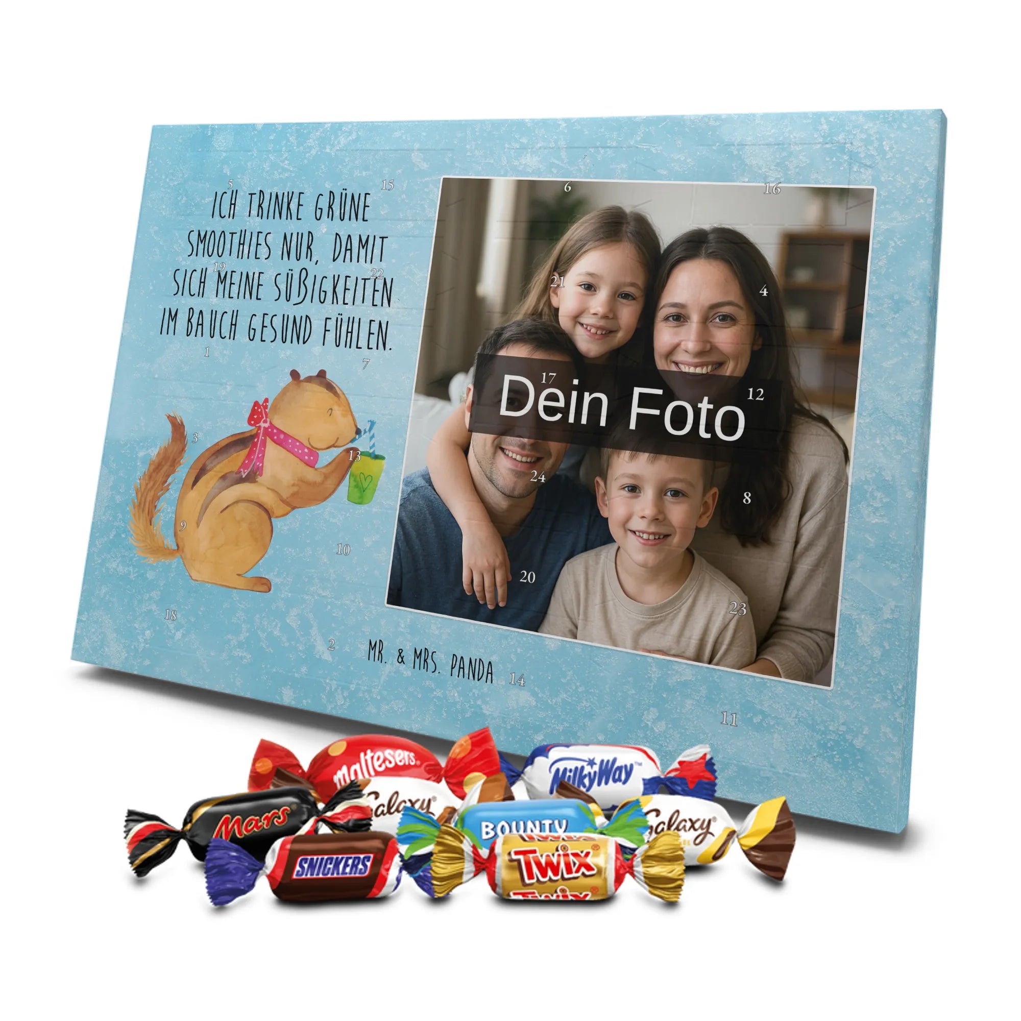 Liebevoll gestalteter Personalisierter Foto-Adventskalender von Mr. & Mrs. Panda – perfektes Geschenk für alle, die Weihnachten mit einer persönlichen Note mögen. Du erhältst einen Adventskalender, bedruckt mit unseren typischen Mr. & Mrs. Panda Motiven & Sprüchen, und kannst ein eigenes Foto einfügen. Bitte lade ein Foto in hoher Auflösung hoch und achte auf den Bildausschnitt, damit wichtige Gesichter und Details nicht verloren gehen. Verwende nur Bilder, für die du die Rechte besitzt oder eine Erlaubnis hast. Der Kalender überzeugt durch brillante Druckqualität, eine seidenmatte Oberflächenveredelung und bedruckte Seitenflächen. Maße: 233 mm x 178 mm x 24 mm. Besonderheit: Der Kalender kann aufgehängt oder aufgestellt werden. Hinweis: Die Fotos werden weder aufbereitet noch zugeschnitten; Rücknahme bei personalisierten Foto-Artikeln ist ausgeschlossen. Gefüllt mit MARKENNAMEN Schokolade und leckeren Schokoladenkugeln. Kann Spuren von Haselnüssen, Mandeln, Gluten und Soja enthalten. Kühl und trocken lagern. Ein emotionales, süßes Geschenk, das an jedem Adventstag Freude und Erinnerungen schenkt.