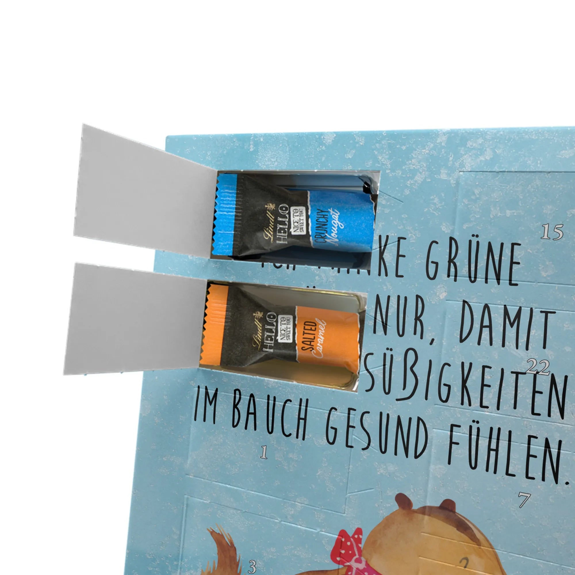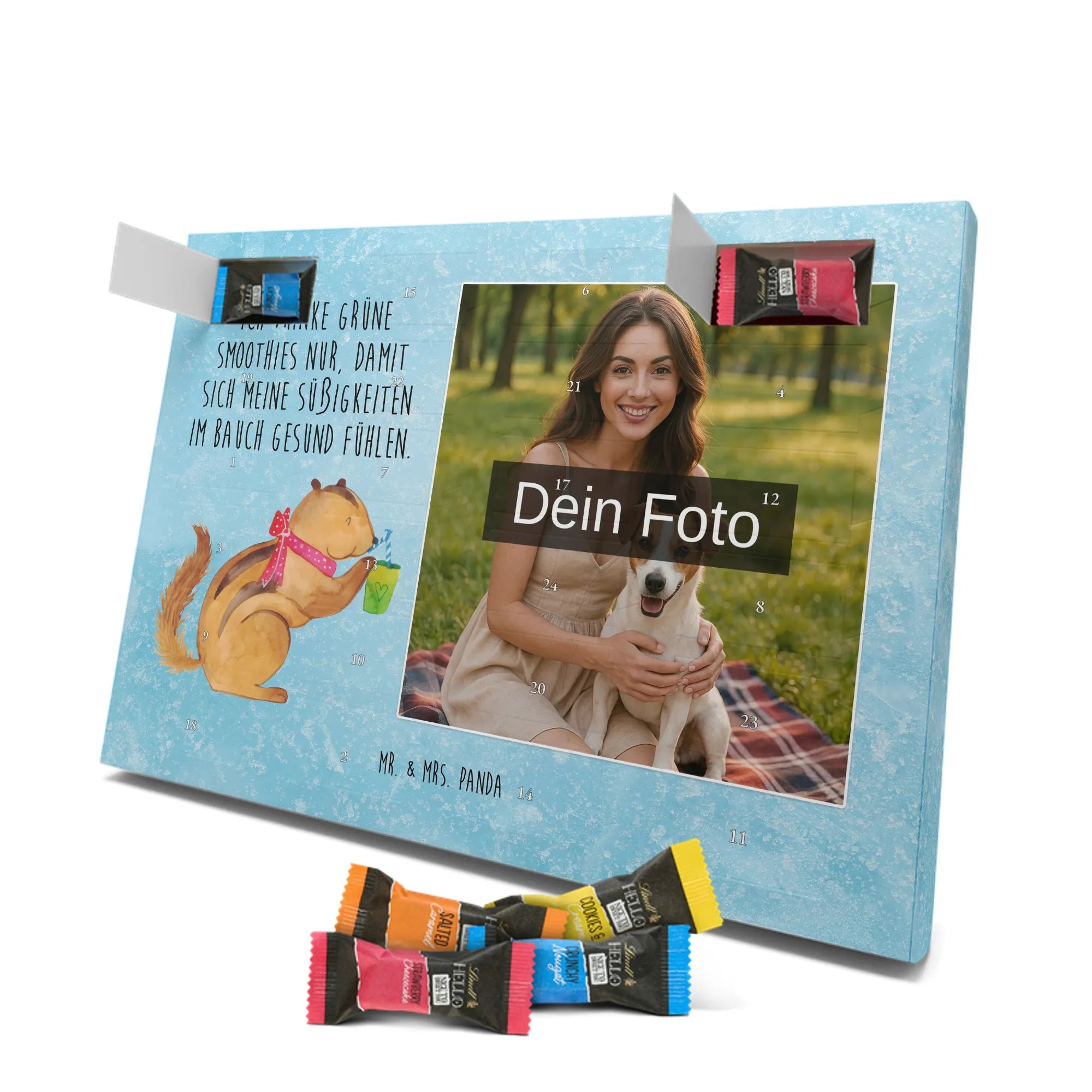 Verschenke Vorfreude: Unser individueller Foto-Adventskalender mit Schokolade von Mr. & Mrs. Panda macht jeden Dezembertag zum kleinen Fest. Der Kalender kombiniert bezaubernde Illustrationen und Sprüche von Mr. & Mrs. Panda mit deinem eigenen Foto – so entsteht ein ganz persönliches Geschenk. Achte auf Bildqualität und Bildausschnitt, damit das Foto optimal zur Geltung kommt, und nutze nur Bilder, für die du die Rechte besitzt. Die hochwertige seidenmatte Oberfläche mit bedruckten Seitenflächen veredelt das Design. Maße: 325 mm x 225 mm x 27 mm. Gefüllt mit Lindt Hello Schokolade: 24 einzeln verpackte Mini Sticks in den Sorten Karamell-Schokoladenkuchen, Kekse, Knuspriger Nougat und Erdbeer-Cheesecake. Zutaten und Allergene findest du auf der Verpackung; enthalten sind z. B. Milcheiweiß, Milchzucker, Soja, Weizen und Haselnüsse. Besonderheit: Du kannst den Kalender aufstellen oder an der Wand aufhängen. Bitte beachten: Die Fotos werden weder aufbereitet noch zugeschnitten – personalisierte Foto-Artikel sind vom Rückgaberecht ausgeschlossen. Hol dir ein Stück Adventszauber mit deinem persönlichen Foto-Adventskalender!