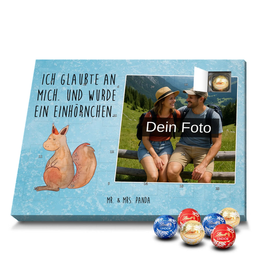 Mach die Adventszeit persönlich mit unserem Personalisiertes Schoko Foto-Adventskalender von Mr. & Mrs. Panda. Dieser Kalender kombiniert dein Lieblingsfoto mit unseren fröhlichen Illustrationen und liebevollen Sprüchen – perfekt als Geschenk für Partner, Familie oder Freunde. Für ein optimales Druckergebnis bitte ein hochauflösendes Bild verwenden und den Bildausschnitt so wählen, dass wichtige Details nicht verloren gehen. Beachte, dass wir Fotos nicht nachbearbeiten oder zuschneiden; lade nur Bilder hoch, für die du die Rechte besitzt. Die hochwertige Verarbeitung beinhaltet eine seidenmatte Oberflächenveredelung und bedruckte Seitenflächen, außerdem ist der Kalender robust und kann aufgehängt oder aufgestellt werden. Maße: 233 mm x 178 mm x 24 mm. Gefüllt mit Lindt Lindor Markenschokolade: 24 einzeln verpackte Kugeln in den Sorten Vollmilch, Feinherb und Weiße Schokolade. Inhaltsstoffe und Allergene sind angegeben; es kann Haselnüsse und Mandeln enthalten. Hinweis: Personalisierte Foto-Artikel sind vom Umtausch ausgeschlossen. Ein süßer, persönlicher Adventsgruß von Mr. & Mrs. Panda.