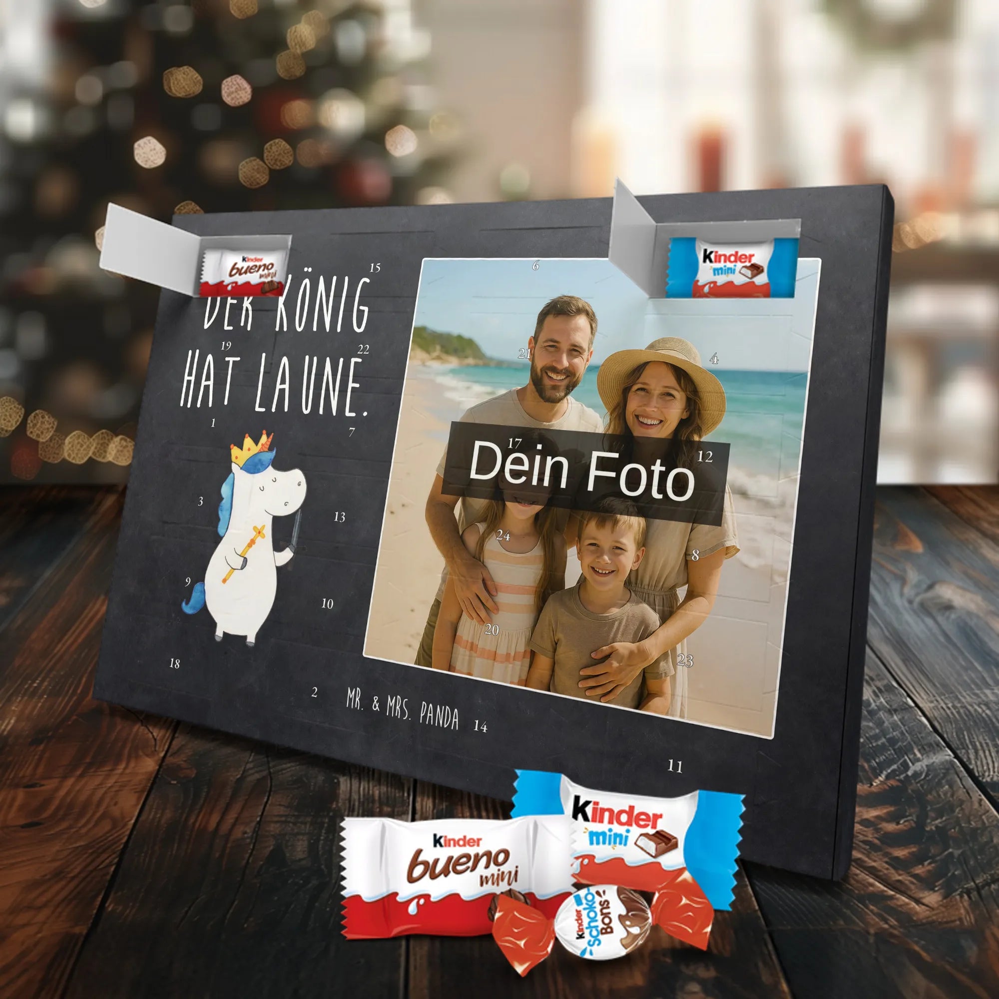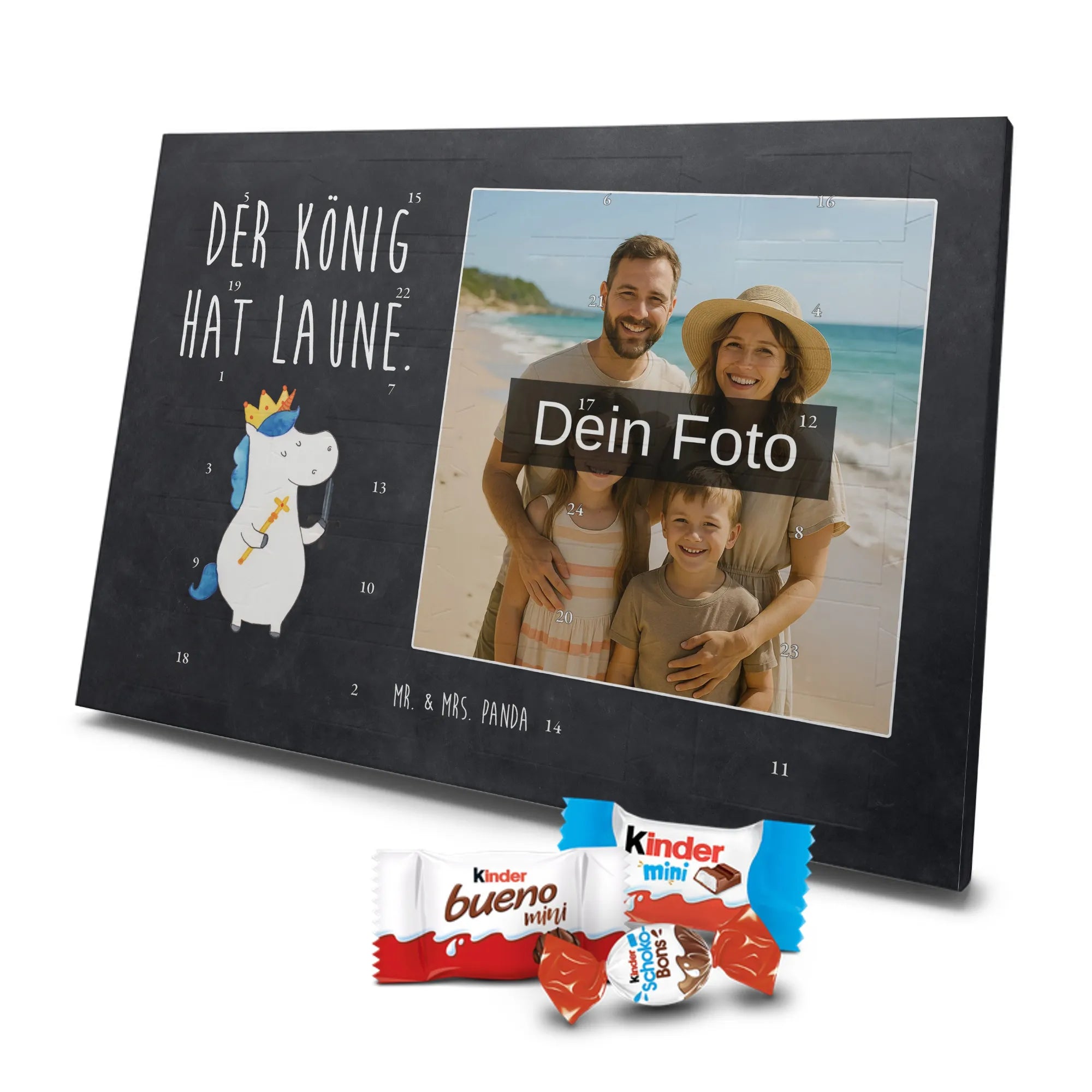 🐼 Personalisierter Schoko-Foto-Adventskalender mit deinem Bild, Mr. & Mrs. Panda Motiven und gefüllt mit kinder® Schokolade.