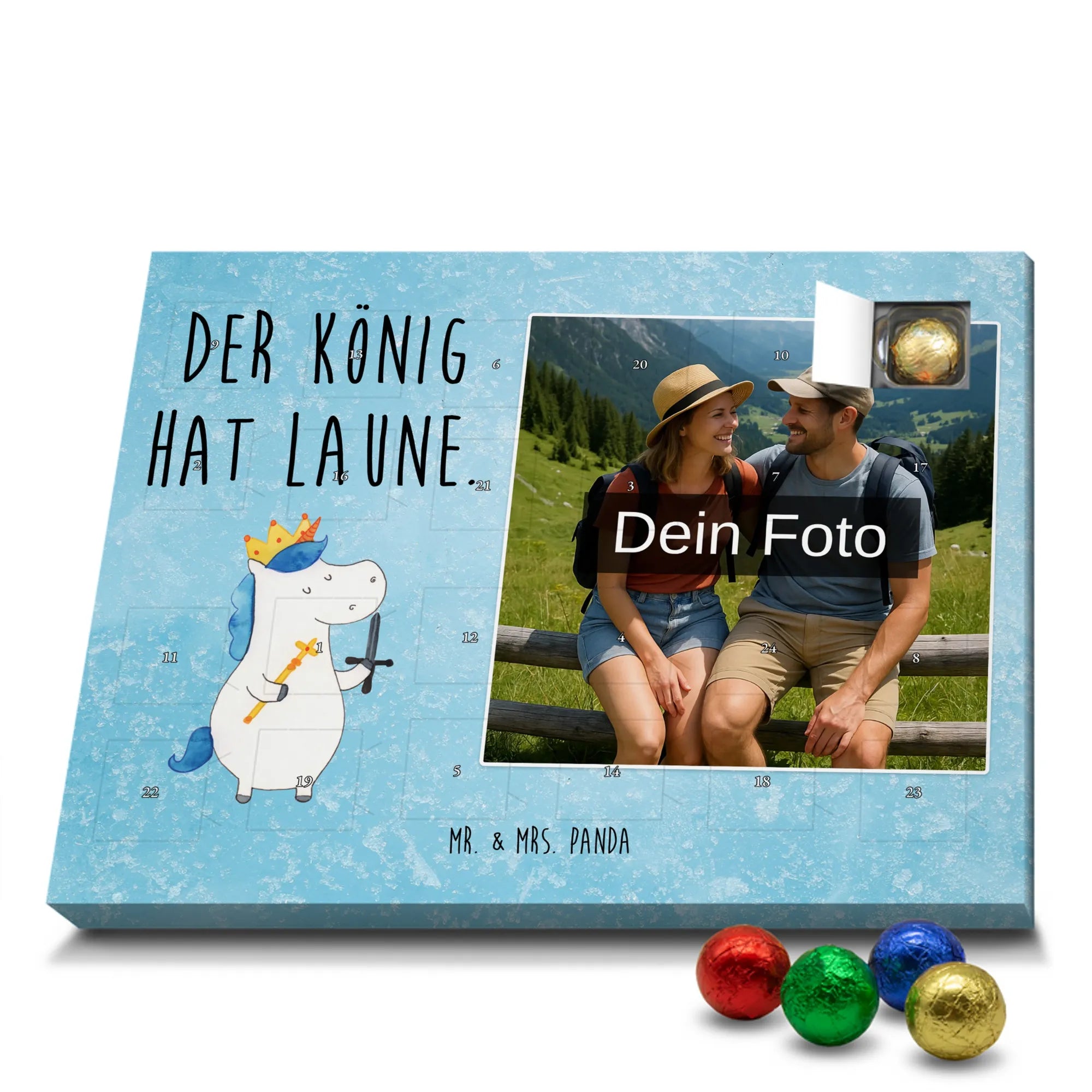Liebevoller Foto Adventskalender personalisiert von Mr. & Mrs. Panda – der perfekte Begleiter durch die Adventszeit. Bedruckt mit unseren beliebten Motiven & Sprüchen, kannst du den Kalender mit einem persönlichen Foto versehen. Achte auf hohe Auflösung und einen passenden Bildausschnitt, damit das Motiv optimal zur Geltung kommt. Verwende nur Bilder, für die du die Rechte besitzt, um rechtliche Probleme zu vermeiden. Der Kalender bietet brillante Druckqualität, eine seidenmatte Oberflächenveredelung und bedruckte Seitenflächen. Maße: 233 mm x 178 mm x 24 mm. Besonderheit: Er lässt sich sowohl aufstellen als auch aufhängen. Bitte beachte: Die Fotos werden weder aufbereitet noch zugeschnitten, daher ist eine Rücknahme bei personalisierten Foto-Artikeln ausgeschlossen. Gefüllt mit MARKENNAMEN Schokolade und leckeren Schokoladenkugeln. Hinweis: Kann Spuren von Haselnüssen, Mandeln, Gluten und Soja enthalten. Kühl und trocken lagern. Schenke persönliche Vorfreude – jeden Tag ein kleines Highlight mit Schokolade und Erinnerungen.
