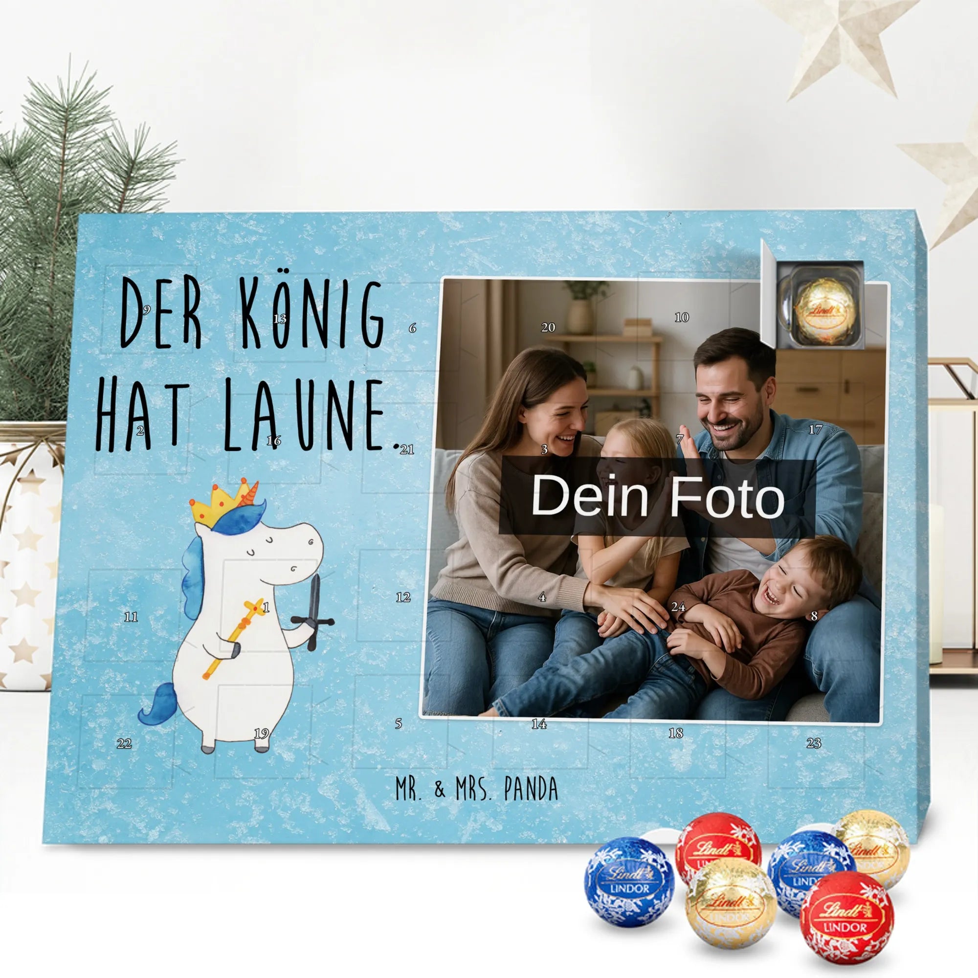 Wunderschöner Personalisierter Schoko Foto Adventskalender von Mr. & Mrs. Panda – perfekt zum Verschenken oder zum Verwöhnen. Dieser Adventskalender verbindet liebevolle Mr. & Mrs. Panda-Motive und Sprüche mit deinem persönlichen Foto auf der Vorderseite. Die hochwertige Verarbeitung mit seidenmatter Oberflächenveredelung sorgt für brillante Farben und eine edle Haptik, die man gerne anfasst. Bedruckte Seitenflächen und die stabile Ausführung machen den Kalender zum echten Hingucker in der Adventszeit. Bitte achte auf eine hohe Auflösung deines Fotos, damit das Druckergebnis klar und scharf wird, und wähle einen passenden Bildausschnitt, damit keine wichtigen Details abgeschnitten werden. Lade nur Bilder hoch, bei denen du die Rechte besitzt oder die Erlaubnis hast, besonders bei Fotos mit Personen. Wichtig: Die Fotos werden weder aufbereitet noch zugeschnitten – eine Rücknahme bei personalisierten Foto-Artikeln ist ausgeschlossen. Der Kalender kann aufgehängt oder aufgestellt werden, so wie es dir gefällt. Maße: 233 mm x 178 mm x 24 mm. Gefüllt mit Lindt Lindor Markenschokolade: 24 einzeln verpackte Markenschokoladen Kugeln in drei Sorten (Vollmilch, Feinherb, Weiße Schokolade). Zutatenhinweis: Kann Haselnüsse und Mandeln enthalten. Ein liebevoller, personalisierter Adventsmoment von Mr. & Mrs. Panda.