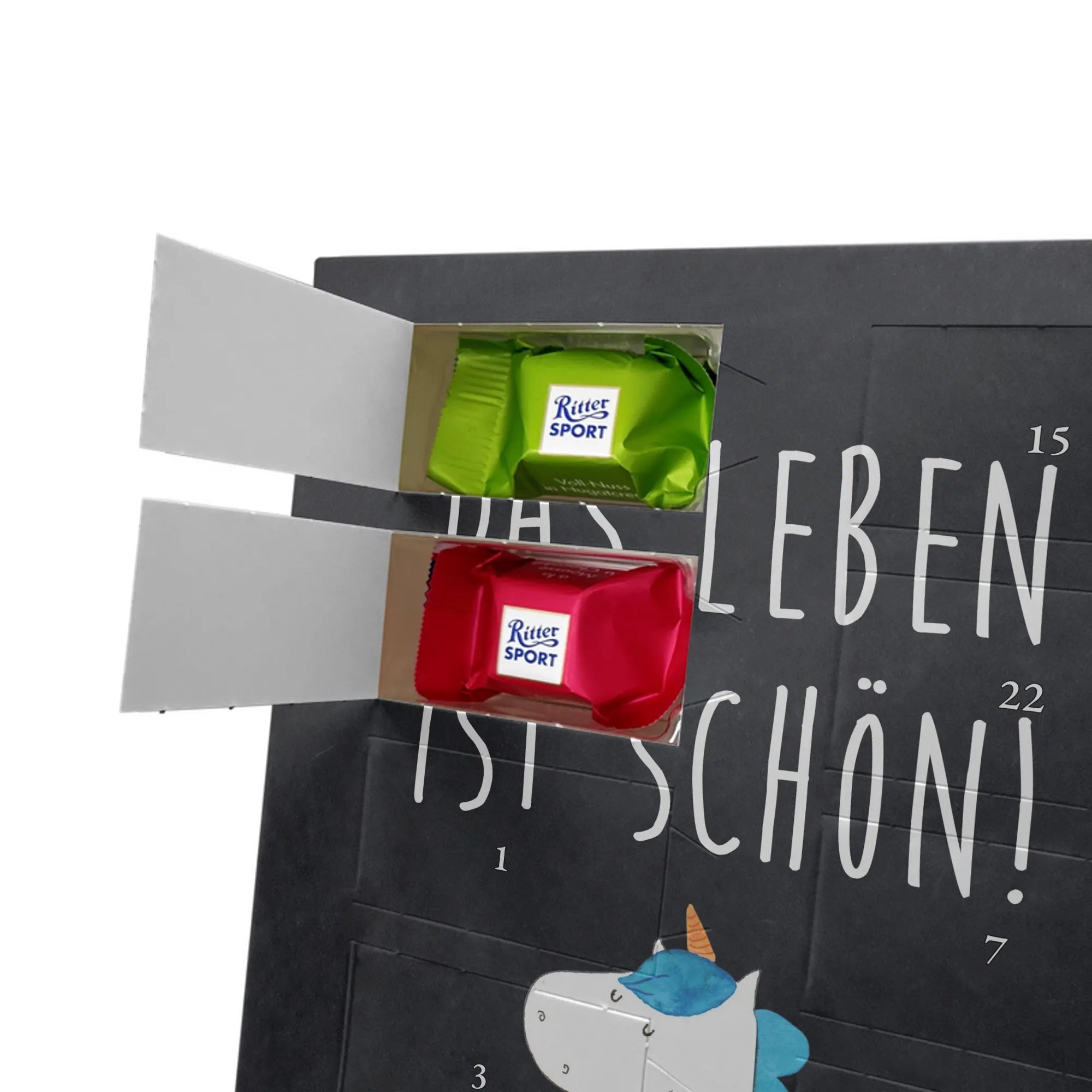 Der Kalender ist gefüllt mit köstlichen Ritter Sport Schokowürfeln in verschiedenen Geschmacksrichtungen: Mousse au Chocolat, Schoko Crisp, Voll-Nuss in Nougatcreme, Karamell Duo, Joghurt und Erdbeer-Joghurt. Ein perfekter Schoko Adventskalender für alle Einhorn-Fans und Naschkatzen.