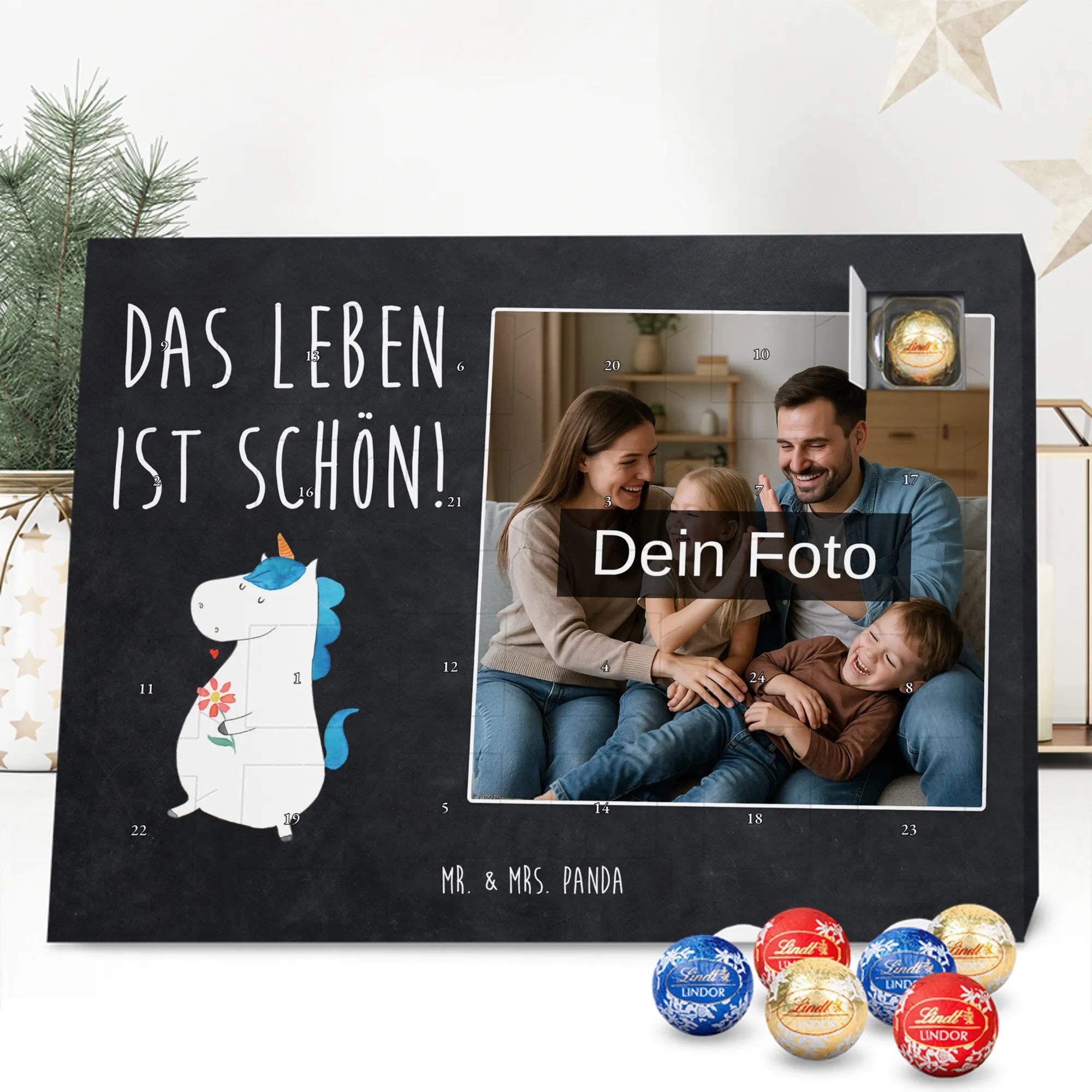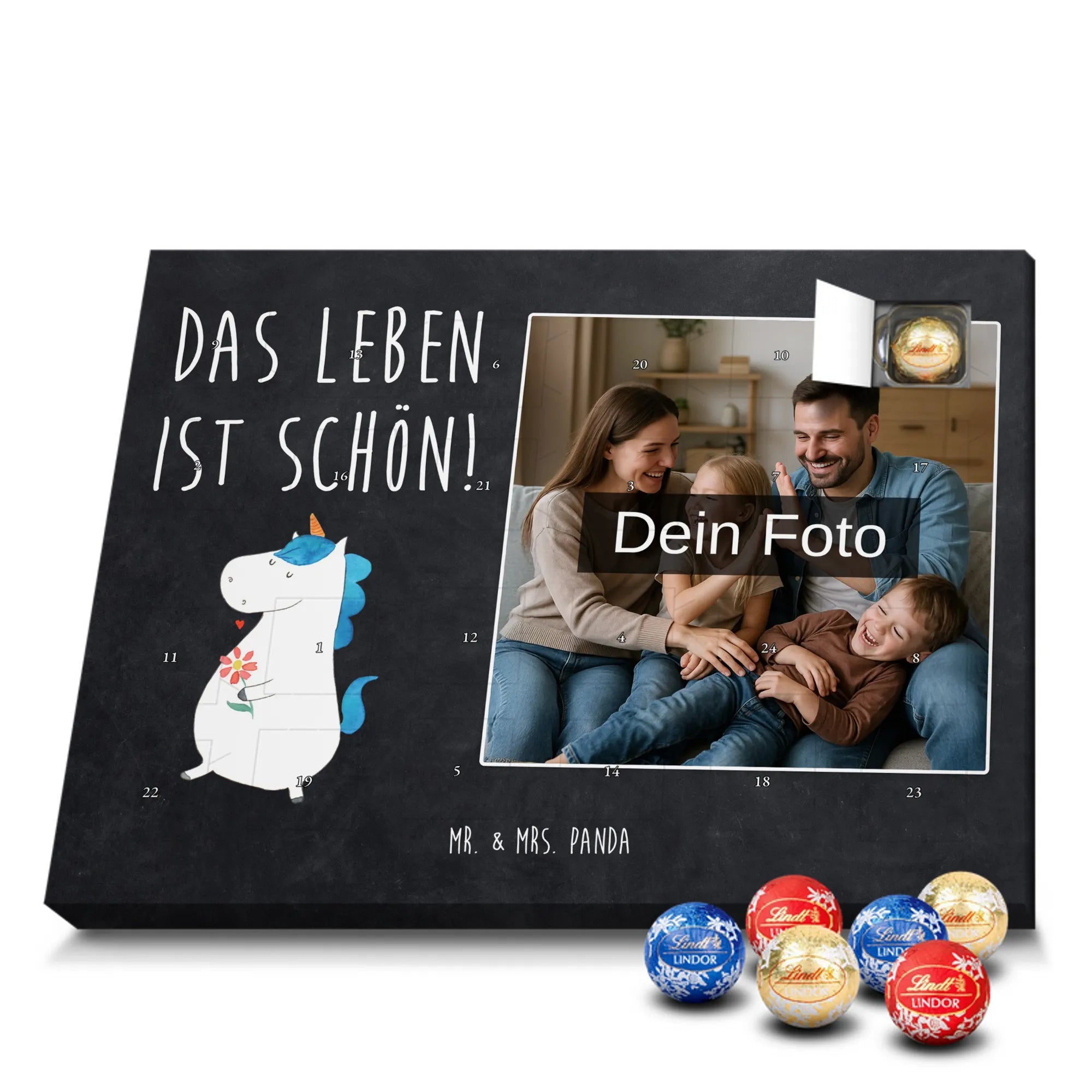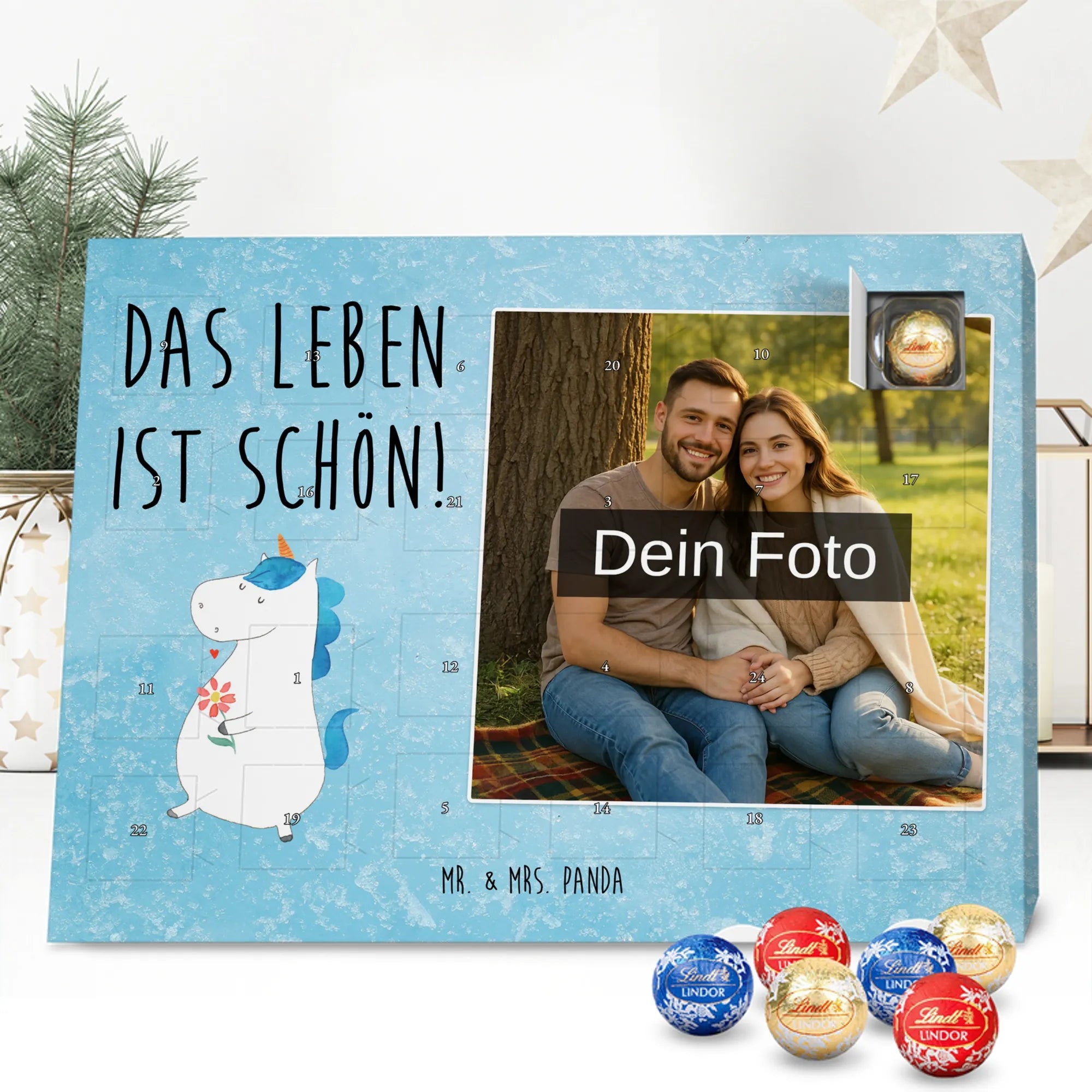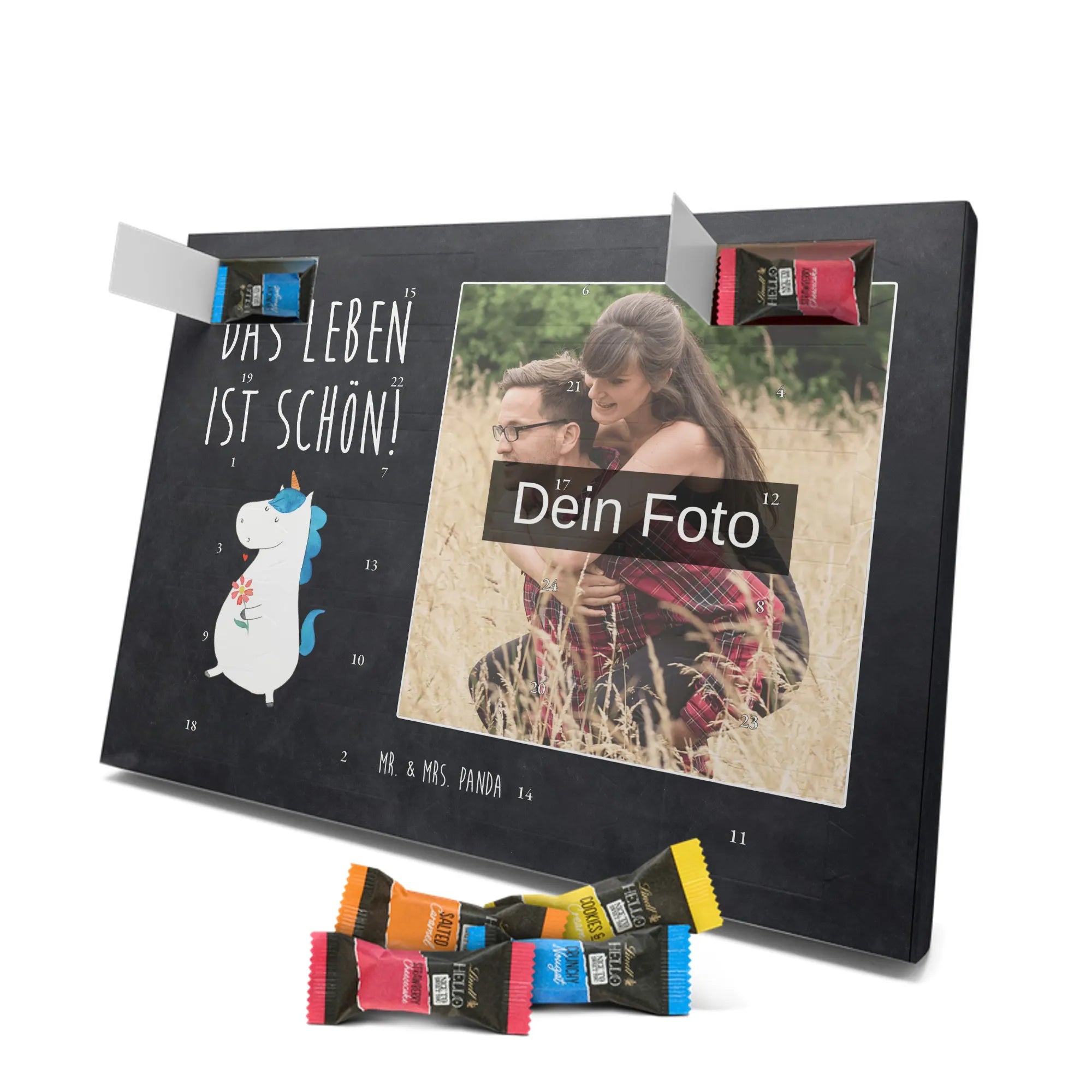 Mach die Adventszeit persönlich mit unserem Personalisiertes Schoko Foto-Adventskalender von Mr. & Mrs. Panda. Dieser Kalender kombiniert dein Lieblingsfoto mit unseren fröhlichen Illustrationen und liebevollen Sprüchen – perfekt als Geschenk für Partner, Familie oder Freunde. Für ein optimales Druckergebnis bitte ein hochauflösendes Bild verwenden und den Bildausschnitt so wählen, dass wichtige Details nicht verloren gehen. Beachte, dass wir Fotos nicht nachbearbeiten oder zuschneiden; lade nur Bilder hoch, für die du die Rechte besitzt. Die hochwertige Verarbeitung beinhaltet eine seidenmatte Oberflächenveredelung und bedruckte Seitenflächen, außerdem ist der Kalender robust und kann aufgehängt oder aufgestellt werden. Maße: 233 mm x 178 mm x 24 mm. Gefüllt mit Lindt Lindor Markenschokolade: 24 einzeln verpackte Kugeln in den Sorten Vollmilch, Feinherb und Weiße Schokolade. Inhaltsstoffe und Allergene sind angegeben; es kann Haselnüsse und Mandeln enthalten. Hinweis: Personalisierte Foto-Artikel sind vom Umtausch ausgeschlossen. Ein süßer, persönlicher Adventsgruß von Mr. & Mrs. Panda.