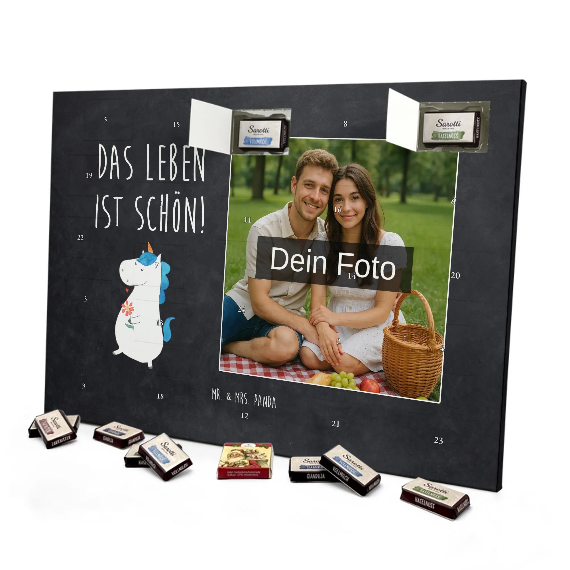 Schoko Foto Adventskalender personalisiert – ein zauberhaftes Geschenk, das Erinnerungen und Geschmack vereint. Mr. & Mrs. Panda haben liebevolle Motive und Sprüche gestaltet, die den Kalender umrahmen; dein Foto setzt die persönliche Note. Für ein optimales Druckbild lade bitte ein Foto mit hoher Auflösung hoch und achte auf einen passenden Bildausschnitt, damit wichtige Details nicht abgeschnitten werden. Bitte nur Bilder verwenden, für die du die Rechte besitzt. Die seidenmatte Oberflächenveredelung sorgt für edle Haptik und die bedruckten Seitenflächen für ein rundum gelungenes Design. Maße: 355 mm x 245 mm x 11 mm – kann aufgehängt oder aufgestellt werden. Wichtiger Hinweis: Wir bearbeiten oder schneiden die Fotos nicht nach; eine Rücknahme personalisierter Foto Artikel ist ausgeschlossen. Gefüllt mit 24 einzeln verpackten Schokoladentäfelchen in den Geschmacksrichtungen Vollmilch, Nougat, Zartbitter und Haselnuss von Sarotti® und Confiserie Heidel®. Insgesamt enthält der Kalender 107 g Markenschokolade. Ideal als Geschenk für Partner, Familie oder Freunde – persönlich, süß und liebevoll verpackt von Mr. & Mrs. Panda.
