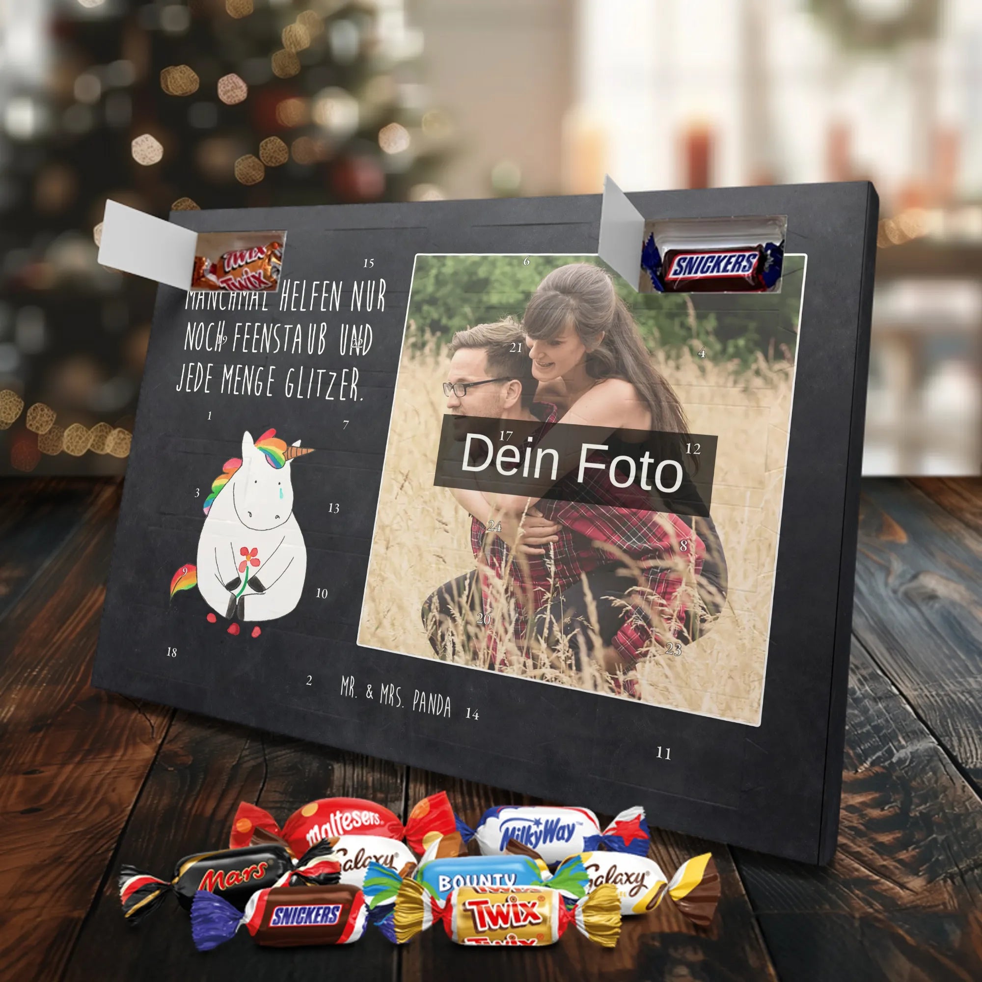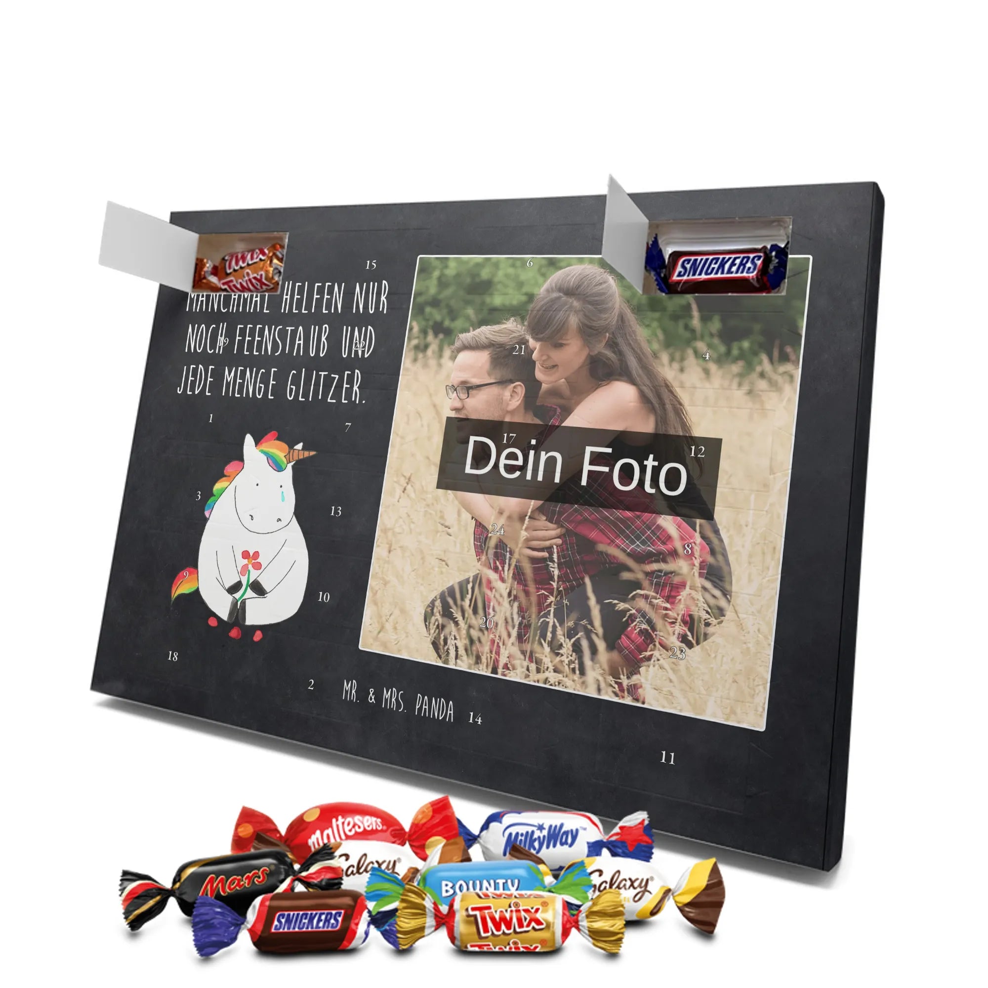 Lustiger Personalisierter Schoko Foto-Adventskalender – das Must-have für eine persönliche Adventszeit von Mr. & Mrs. Panda. Jeder Kalender wird mit unseren charmanten Illustrationen und liebevollen Sprüchen bedruckt, während dein Foto die Vorderseite einzigartig macht. Achte bitte darauf, ein Foto mit guter Qualität und ausreichend hoher Auflösung hochzuladen, damit der Druck gestochen scharf wirkt. Überprüfe den Bildausschnitt, damit wichtige Bereiche nicht verloren gehen. Denk daran, nur Bilder zu verwenden, bei denen du die nötigen Rechte besitzt. Die Verarbeitung ist hochwertig: brillante Druckqualität mit seidenmatter Oberflächenveredelung und bedruckten Seitenflächen. Maße: 325 mm x 225 mm x 27 mm. Du kannst den Kalender aufhängen oder aufstellen – sehr praktisch. Hinweis: Die hochgeladenen Fotos werden nicht nachbearbeitet oder zugeschnitten; Rücknahme bei personalisierten Foto-Artikeln ist ausgeschlossen. Gefüllt ist der Kalender mit Celebrations Schokolade – 24 Stück in 8 verschiedenen Sorten (Maltesers, Mars, Snickers, Twix, Milky Way, Bounty, Galaxy, Galaxy Caramel). Verschenke ein Stück persönlich gestaltete Vorfreude und mache jeden Dezembertag zu etwas Besonderem.