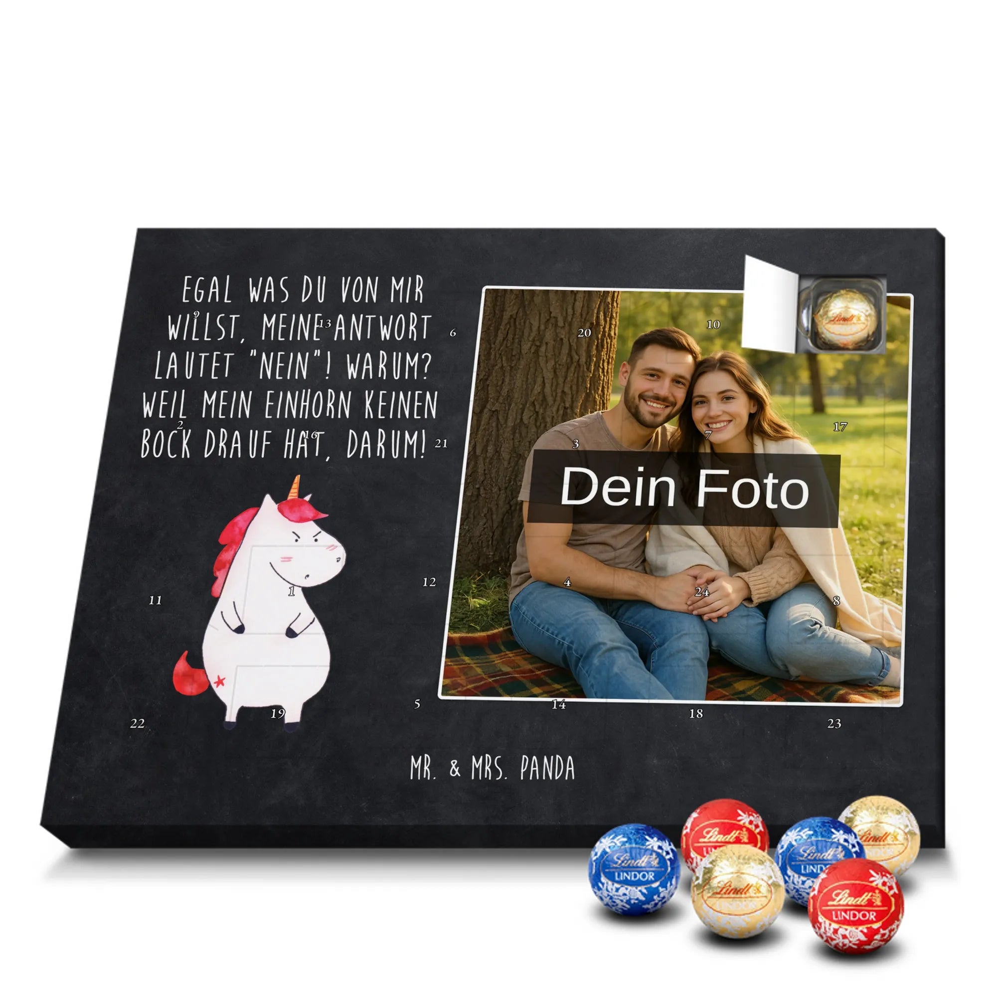 Entdecke unseren charmanten Personalisierter Schoko-Foto Adventskalender von Mr. & Mrs. Panda – ein liebevolles Geschenk für Freunde, Familie oder dich selbst. Aufdrucke mit süßen Motiven und herzlichen Sprüchen begleiten dein persönliches Foto, das du individuell hochlädst. Achte bitte auf eine ausreichende Auflösung des Bildes und einen passenden Bildausschnitt, damit das Druckbild klar bleibt. Wir weisen darauf hin, dass Fotos nicht nachbearbeitet oder zugeschnitten werden; achte daher auf Bildrechte und Zustimmung der abgebildeten Personen. Die Verarbeitung überzeugt durch eine seidenmatte Oberflächenveredelung und bedruckte Seitenflächen; dadurch wirkt der Kalender sehr hochwertig. Der Kalender ist vielseitig: Du kannst ihn sowohl aufstellen als auch aufhängen. Maße: 233 mm x 178 mm x 24 mm. Gefüllt mit Lindt Lindor Markenschokolade – 24 einzeln verpackte Markenschokoladen Kugeln in den Geschmacksrichtungen Vollmilch, Feinherb und Weiße Schokolade. Zutaten und Allergene sind auf der Verpackung angegeben; es kann Spuren von Haselnüssen und Mandeln geben. Hinweis: Personalisierte Foto-Artikel sind vom Umtausch ausgeschlossen.