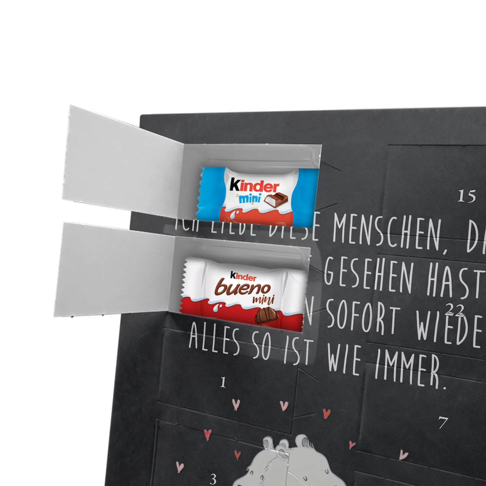 Unser personalisierten Schoko Foto Adventskalender ist ein echtes Highlight in der Adventszeit – handlich, individuell und voller süßer Überraschungen. Du personalisierst die Vorderseite mit deinem liebsten Foto und wir kombinieren es mit liebevollen Motiven und Sprüchen von Mr. & Mrs. Panda. Bitte achte auf eine ausreichende Bildauflösung und einen passenden Bildausschnitt, damit das Druckergebnis gestochen scharf ist. Lade nur Bilder hoch, deren Rechte du besitzt oder bei denen du die Erlaubnis hast, besonders wenn Personen darauf zu sehen sind. Wichtig: Fotos werden nicht retuschiert oder zugeschnitten; personalisierte Foto-Artikel sind vom Widerruf ausgeschlossen. Der Kalender besticht durch brillante Druckqualität und eine seidenmatte Oberflächenveredelung sowie bedruckte Seitenflächen. Maße: 355 mm x 245 mm x 11 mm. Du kannst ihn entweder aufstellen oder an die Wand hängen. Gefüllt ist der Adventskalender mit kinder® Schokolade, inklusive kinder® Schoko-Bons, kinder® Bueno mini und kinder® Schokolade mini. Ein liebevolles, persönliches Geschenk für Kinder, Freunde oder die bessere Hälfte – individuell, süß und mit dem typischen Mr. & Mrs. Panda Charme.