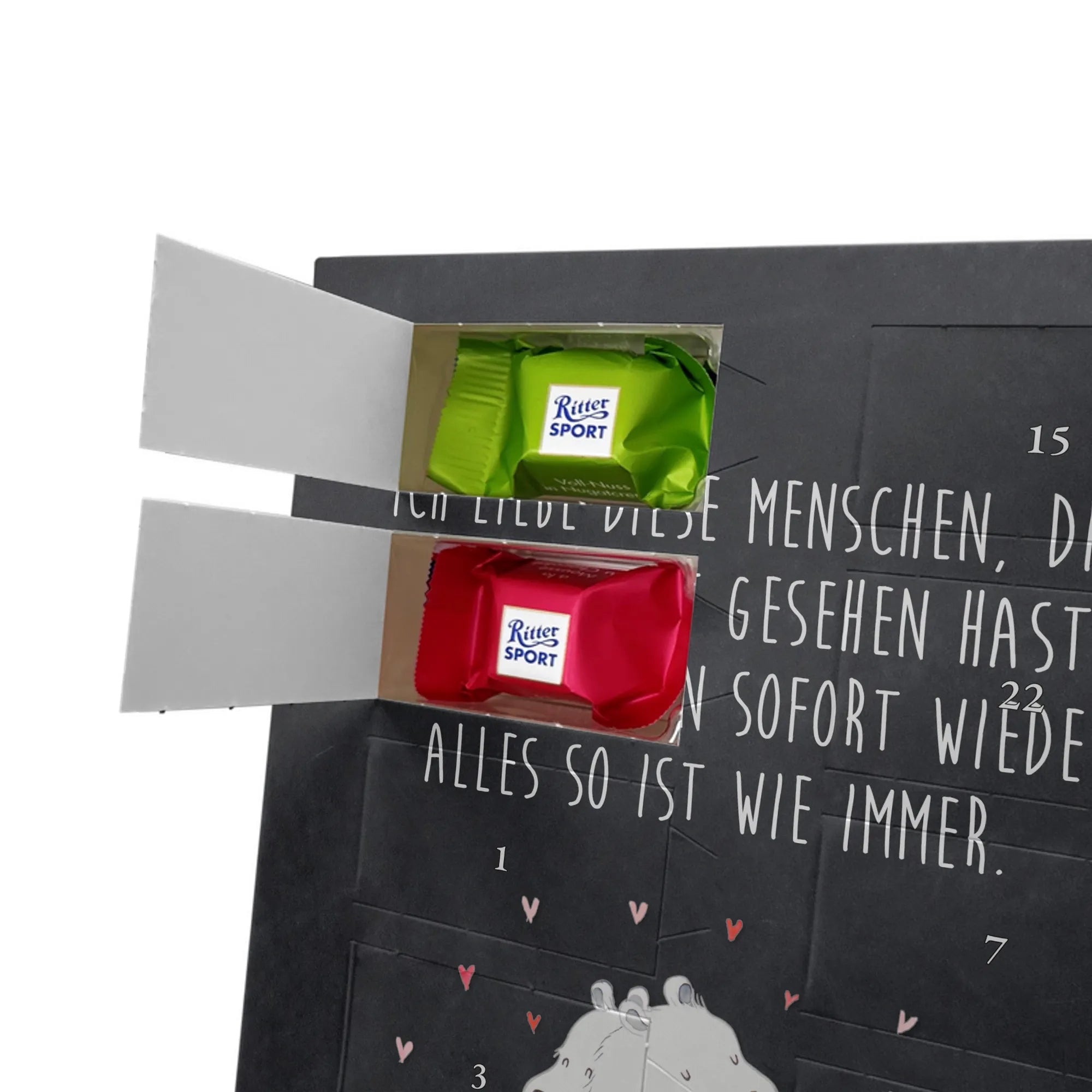 Personalisiertes Schoko-Foto Adventskalender von Mr. & Mrs. Panda – zaubere ein Lächeln in die Adventszeit mit einem persönlichen Foto und unseren liebevollen Motiven & Sprüchen. Der Kalender ist hochwertig bedruckt, verfügt über seidenmatte Oberflächenveredelung und bedruckte Seitenflächen für ein besonders schönes Erscheinungsbild. Bitte lade ein Foto in hoher Auflösung hoch und achte auf den richtigen Bildausschnitt, damit wichtige Details nicht verloren gehen. Verwende nur Bilder, bei denen du die Rechte besitzt; Fotos werden weder aufbereitet noch zugeschnitten und personalisierte Foto Artikel sind vom Umtausch ausgeschlossen. Maße: 325 mm x 225 mm x 27 mm. Besonderheit: Der Adventskalender kann aufgehängt oder aufgestellt werden – ganz flexibel. Gefüllt ist er mit Ritter Sport Schokowürfeln in köstlichen Geschmacksrichtungen wie Mousse au Chocolat, Schoko Crisp, Voll-Nuss in Nougatcreme, Karamell Duo, Joghurt und Erdbeer-Joghurt. Ein persönliches, süßes Geschenk, das hochwertige Optik mit täglichem Genuss verbindet und die Vorfreude auf Weihnachten jeden Tag steigert.