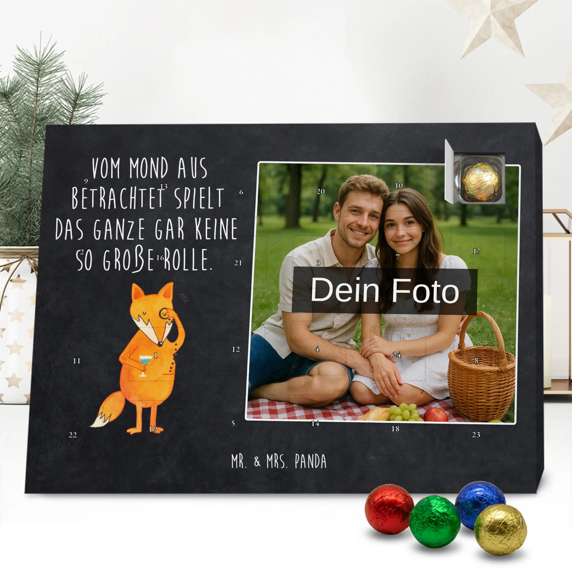 Liebevoll gestalteter Personalisierter Foto-Adventskalender von Mr. & Mrs. Panda – perfektes Geschenk für alle, die Weihnachten mit einer persönlichen Note mögen. Du erhältst einen Adventskalender, bedruckt mit unseren typischen Mr. & Mrs. Panda Motiven & Sprüchen, und kannst ein eigenes Foto einfügen. Bitte lade ein Foto in hoher Auflösung hoch und achte auf den Bildausschnitt, damit wichtige Gesichter und Details nicht verloren gehen. Verwende nur Bilder, für die du die Rechte besitzt oder eine Erlaubnis hast. Der Kalender überzeugt durch brillante Druckqualität, eine seidenmatte Oberflächenveredelung und bedruckte Seitenflächen. Maße: 233 mm x 178 mm x 24 mm. Besonderheit: Der Kalender kann aufgehängt oder aufgestellt werden. Hinweis: Die Fotos werden weder aufbereitet noch zugeschnitten; Rücknahme bei personalisierten Foto-Artikeln ist ausgeschlossen. Gefüllt mit MARKENNAMEN Schokolade und leckeren Schokoladenkugeln. Kann Spuren von Haselnüssen, Mandeln, Gluten und Soja enthalten. Kühl und trocken lagern. Ein emotionales, süßes Geschenk, das an jedem Adventstag Freude und Erinnerungen schenkt.