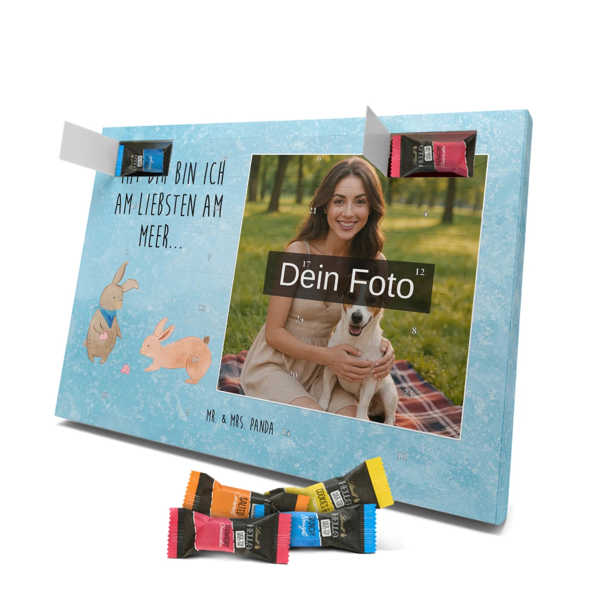 Verschenke Vorfreude: Unser individueller Foto-Adventskalender mit Schokolade von Mr. & Mrs. Panda macht jeden Dezembertag zum kleinen Fest. Der Kalender kombiniert bezaubernde Illustrationen und Sprüche von Mr. & Mrs. Panda mit deinem eigenen Foto – so entsteht ein ganz persönliches Geschenk. Achte auf Bildqualität und Bildausschnitt, damit das Foto optimal zur Geltung kommt, und nutze nur Bilder, für die du die Rechte besitzt. Die hochwertige seidenmatte Oberfläche mit bedruckten Seitenflächen veredelt das Design. Maße: 325 mm x 225 mm x 27 mm. Gefüllt mit Lindt Hello Schokolade: 24 einzeln verpackte Mini Sticks in den Sorten Karamell-Schokoladenkuchen, Kekse, Knuspriger Nougat und Erdbeer-Cheesecake. Zutaten und Allergene findest du auf der Verpackung; enthalten sind z. B. Milcheiweiß, Milchzucker, Soja, Weizen und Haselnüsse. Besonderheit: Du kannst den Kalender aufstellen oder an der Wand aufhängen. Bitte beachten: Die Fotos werden weder aufbereitet noch zugeschnitten – personalisierte Foto-Artikel sind vom Rückgaberecht ausgeschlossen. Hol dir ein Stück Adventszauber mit deinem persönlichen Foto-Adventskalender!