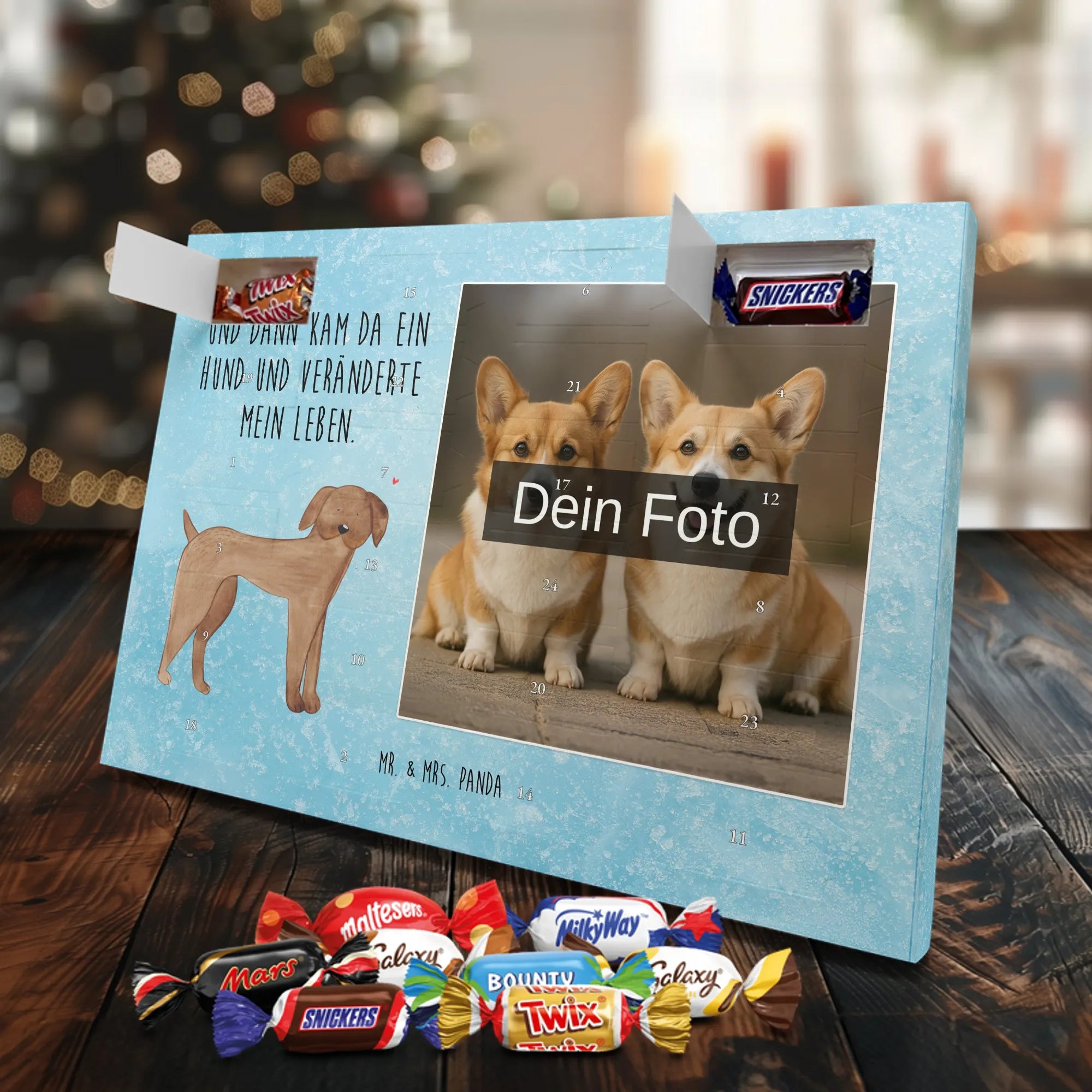 Herziger Personalisierter Foto Adventskalender mit Schokolade von Mr. & Mrs. Panda – perfekt, um schöne Erinnerungen sichtbar zu machen und jeden Dezembertag zu versüßen. Die Vorderseite ziert dein persönliches Foto, der Rest des Kalenders ist mit warmen Motiven und liebevollen Sprüchen von Mr. & Mrs. Panda gestaltet. Bitte lade ein Bild in hoher Auflösung hoch und prüfe den Bildausschnitt, damit nichts Wichtiges abgeschnitten wird. Verwende nur Fotos, bei denen du die Rechte besitzt oder die Zustimmung der abgebildeten Personen vorliegt. Unsere Drucke bestechen durch brillante Qualität und eine seidenmatte Oberflächenveredelung; auch die Seitenflächen sind bedruckt. Maße: 325 mm x 225 mm x 27 mm. Der Adventskalender lässt sich aufhängen oder aufstellen – ganz flexibel. Wichtiger Hinweis: Fotos werden nicht nachbearbeitet oder zugeschnitten; personalisierte Foto-Artikel sind vom Widerruf ausgeschlossen. Gefüllt ist der Kalender mit Celebrations Schokolade – 24 hochwertige Füllungen in 8 leckeren Sorten (Maltesers, Mars, Snickers, Twix, Milky Way, Bounty, Galaxy, Galaxy Caramel). Schenke ein persönliches Unikat, das Freude und Süße verbindet.