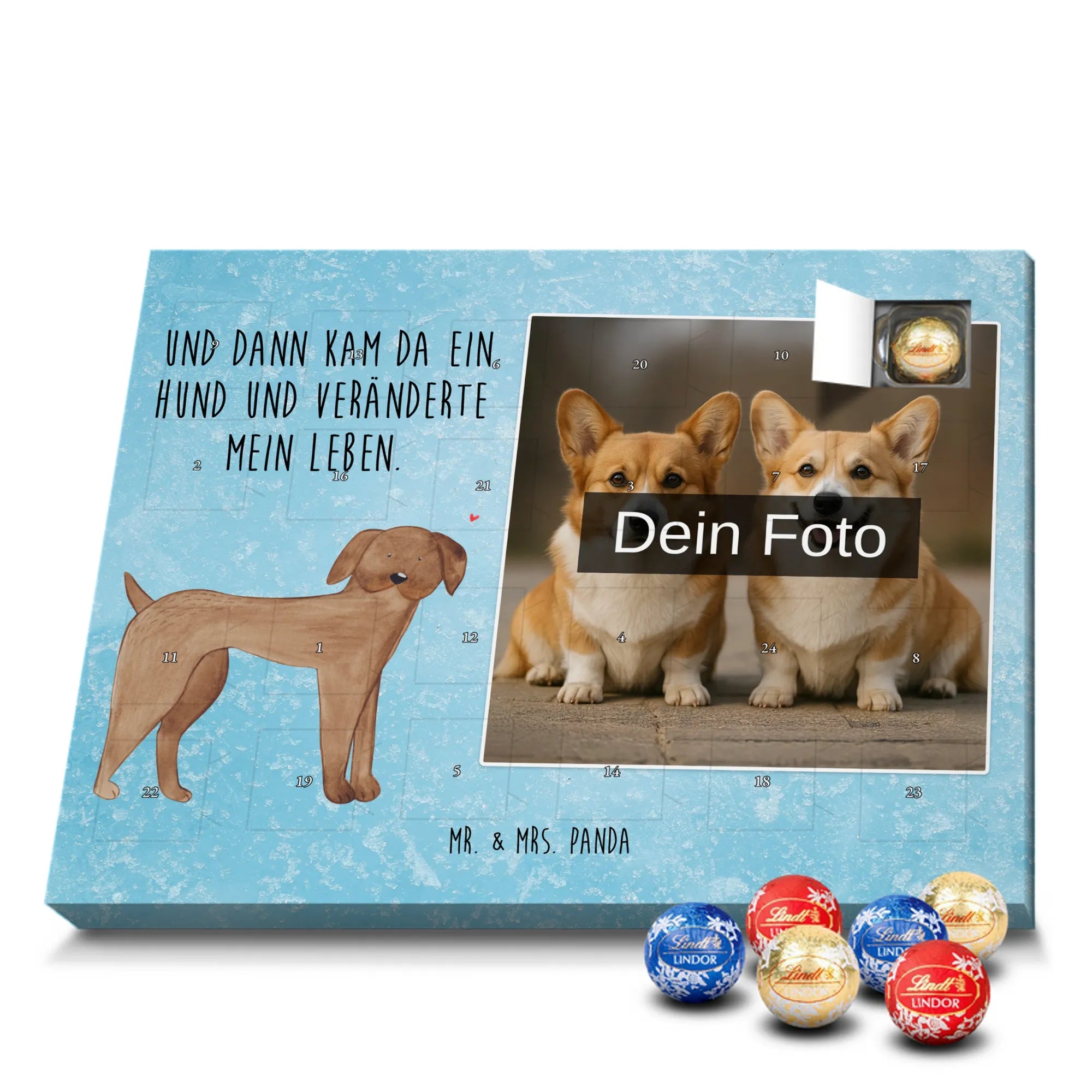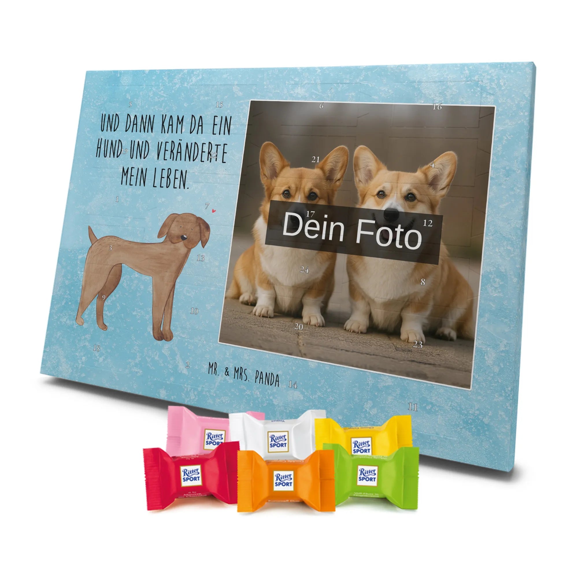 Foto-Adventskalender mit Schokolade von Mr. & Mrs. Panda – personalisiere den Advent mit deinem Lieblingsfoto und unseren liebevollen Motiven & Sprüchen. Dieser Kalender ist ideal, wenn du etwas Persönliches schenken willst: Einfach Foto hochladen, auf hohe Auflösung achten und den passenden Bildausschnitt wählen. Denk daran, nur Bilder zu verwenden, bei denen du die Bildrechte besitzt. Fotos werden nicht nachbearbeitet oder zugeschnitten; Rücknahme bei personalisierten Foto Artikeln ist ausgeschlossen. Die Druckqualität ist brillant, mit seidenmatter Oberflächenveredelung und bedruckten Seitenflächen für ein hochwertiges Erscheinungsbild. Maße: 325 mm x 225 mm x 27 mm. Besonderheit: Du kannst den Kalender sowohl aufhängen als auch aufstellen. Gefüllt ist er mit Ritter Sport Schokowürfeln – köstliche Sorten wie Mousse au Chocolat, Schoko Crisp, Voll-Nuss in Nougatcreme, Karamell Duo, Joghurt und Erdbeer-Joghurt warten hinter den Türchen. Ein liebevoll gestaltetes Geschenk, das Erinnerungen und Genuss verbindet und die Vorfreude auf Weihnachten jeden Tag versüßt.