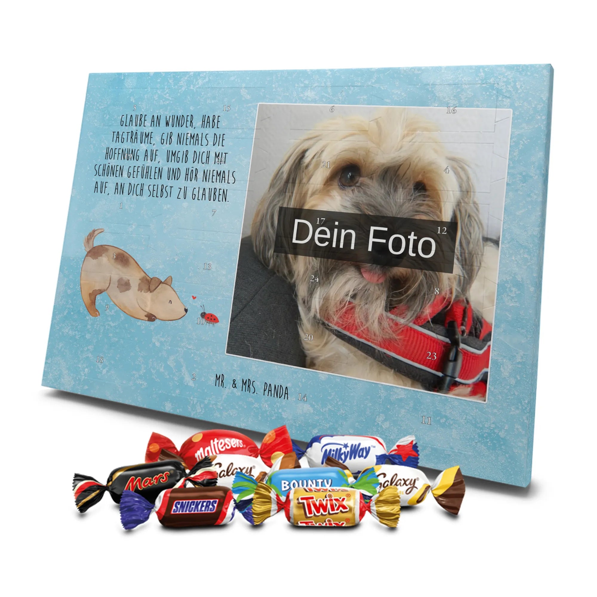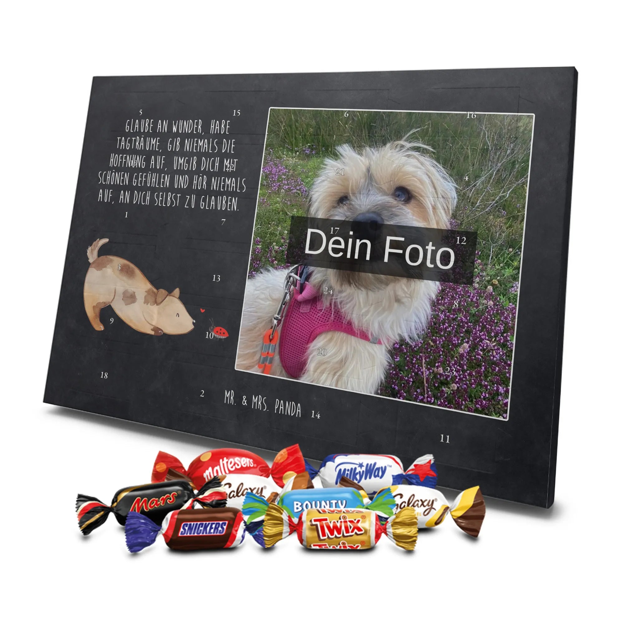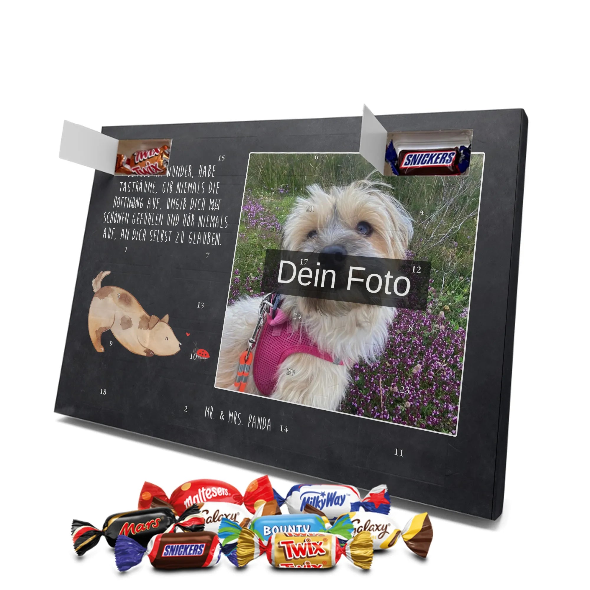 Lustiger Personalisierter Schoko Foto-Adventskalender – das Must-have für eine persönliche Adventszeit von Mr. & Mrs. Panda. Jeder Kalender wird mit unseren charmanten Illustrationen und liebevollen Sprüchen bedruckt, während dein Foto die Vorderseite einzigartig macht. Achte bitte darauf, ein Foto mit guter Qualität und ausreichend hoher Auflösung hochzuladen, damit der Druck gestochen scharf wirkt. Überprüfe den Bildausschnitt, damit wichtige Bereiche nicht verloren gehen. Denk daran, nur Bilder zu verwenden, bei denen du die nötigen Rechte besitzt. Die Verarbeitung ist hochwertig: brillante Druckqualität mit seidenmatter Oberflächenveredelung und bedruckten Seitenflächen. Maße: 325 mm x 225 mm x 27 mm. Du kannst den Kalender aufhängen oder aufstellen – sehr praktisch. Hinweis: Die hochgeladenen Fotos werden nicht nachbearbeitet oder zugeschnitten; Rücknahme bei personalisierten Foto-Artikeln ist ausgeschlossen. Gefüllt ist der Kalender mit Celebrations Schokolade – 24 Stück in 8 verschiedenen Sorten (Maltesers, Mars, Snickers, Twix, Milky Way, Bounty, Galaxy, Galaxy Caramel). Verschenke ein Stück persönlich gestaltete Vorfreude und mache jeden Dezembertag zu etwas Besonderem.