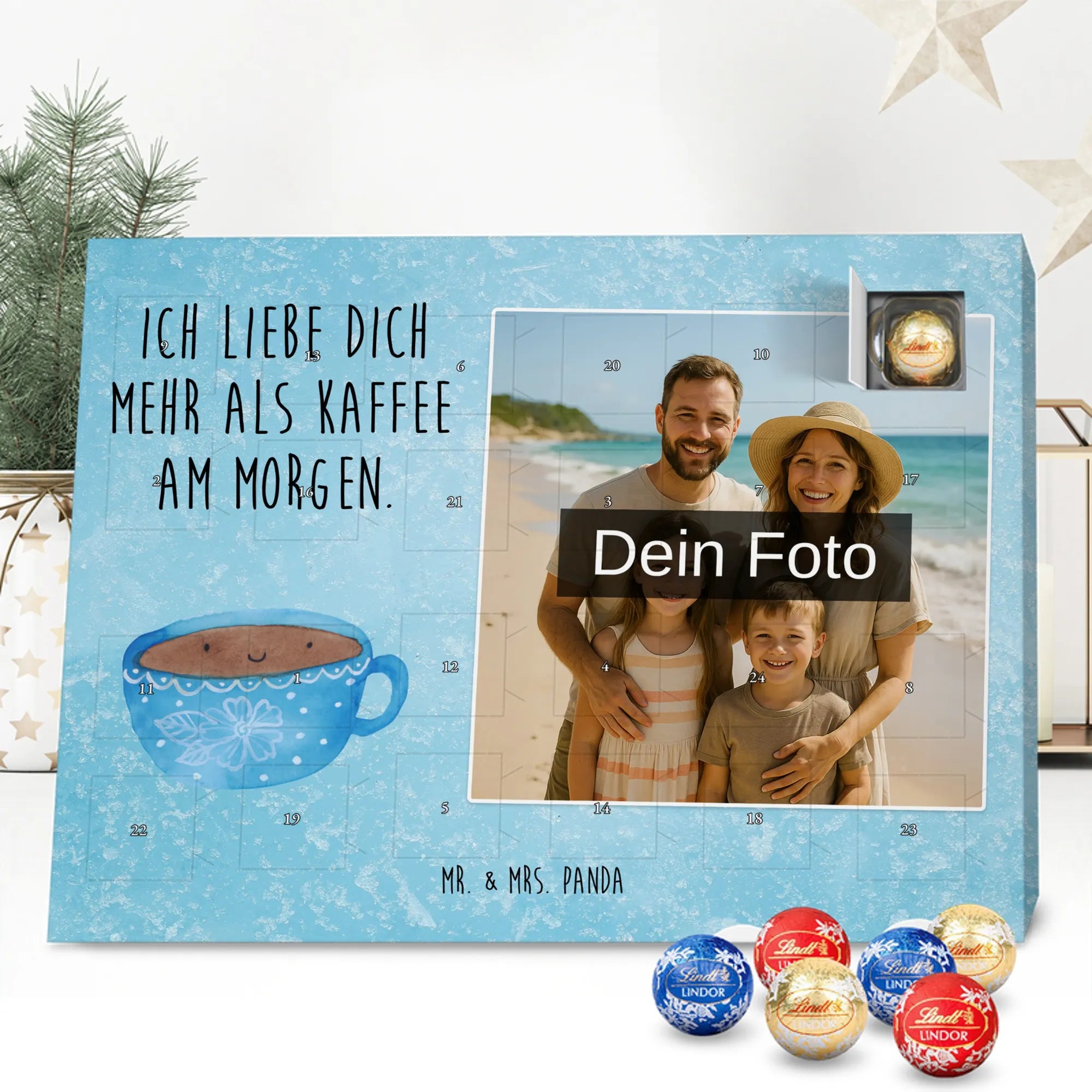 Entdecke unseren charmanten Personalisierter Schoko-Foto Adventskalender von Mr. & Mrs. Panda – ein liebevolles Geschenk für Freunde, Familie oder dich selbst. Aufdrucke mit süßen Motiven und herzlichen Sprüchen begleiten dein persönliches Foto, das du individuell hochlädst. Achte bitte auf eine ausreichende Auflösung des Bildes und einen passenden Bildausschnitt, damit das Druckbild klar bleibt. Wir weisen darauf hin, dass Fotos nicht nachbearbeitet oder zugeschnitten werden; achte daher auf Bildrechte und Zustimmung der abgebildeten Personen. Die Verarbeitung überzeugt durch eine seidenmatte Oberflächenveredelung und bedruckte Seitenflächen; dadurch wirkt der Kalender sehr hochwertig. Der Kalender ist vielseitig: Du kannst ihn sowohl aufstellen als auch aufhängen. Maße: 233 mm x 178 mm x 24 mm. Gefüllt mit Lindt Lindor Markenschokolade – 24 einzeln verpackte Markenschokoladen Kugeln in den Geschmacksrichtungen Vollmilch, Feinherb und Weiße Schokolade. Zutaten und Allergene sind auf der Verpackung angegeben; es kann Spuren von Haselnüssen und Mandeln geben. Hinweis: Personalisierte Foto-Artikel sind vom Umtausch ausgeschlossen.