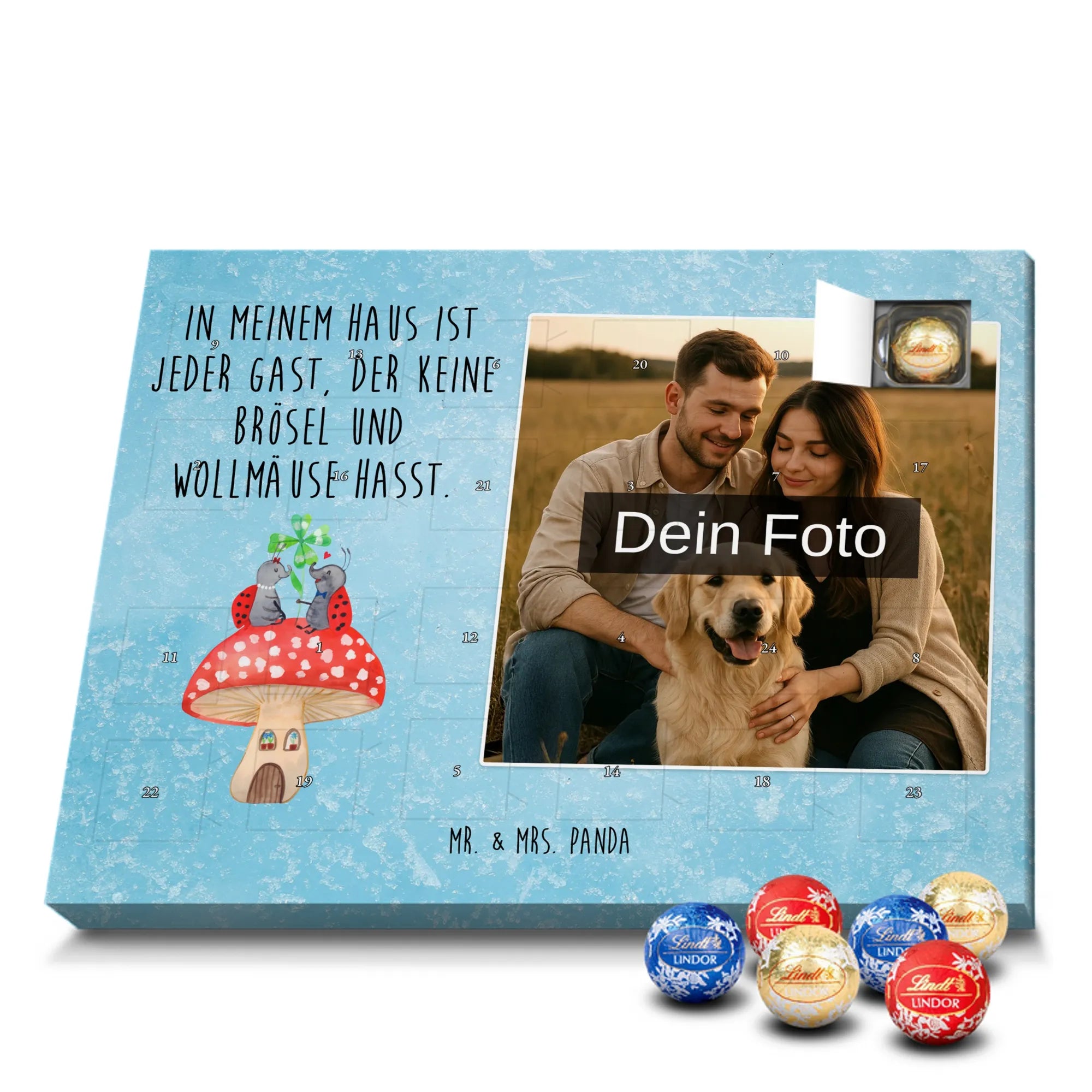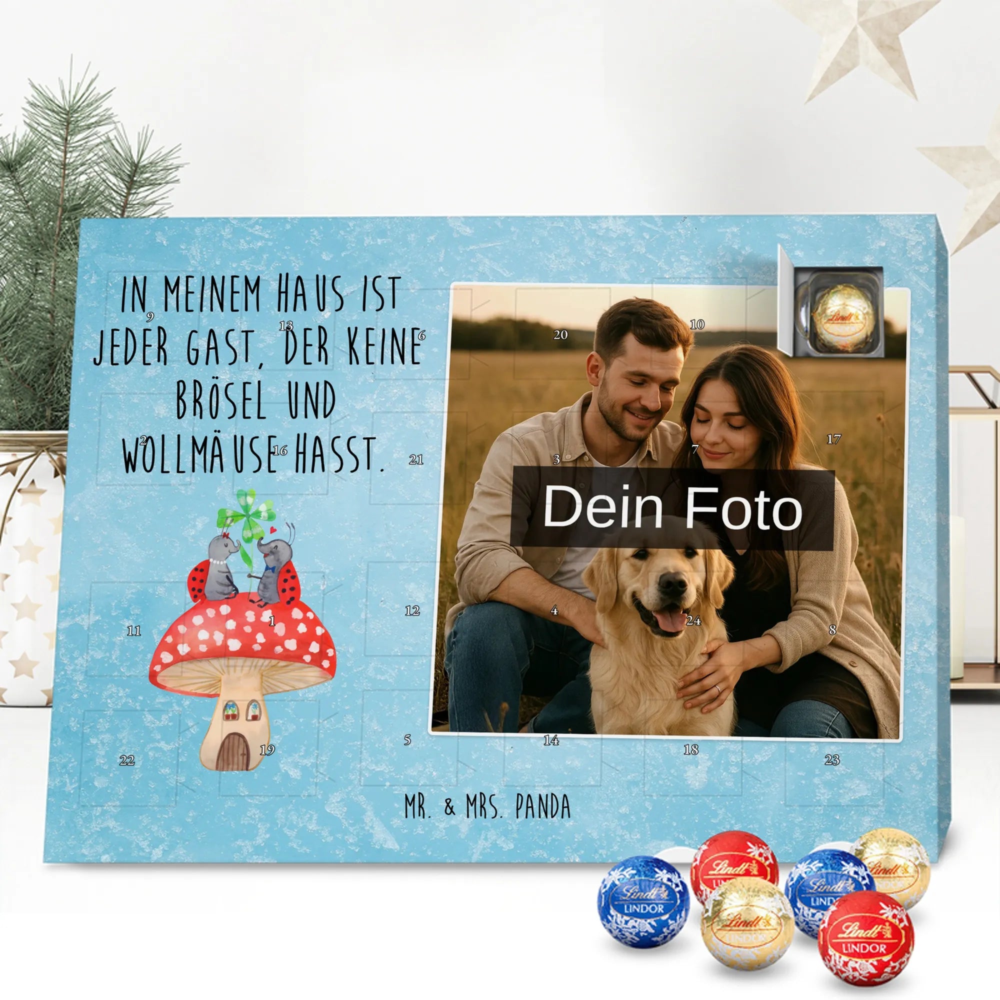 Mach die Adventszeit persönlich mit unserem Personalisiertes Schoko Foto-Adventskalender von Mr. & Mrs. Panda. Dieser Kalender kombiniert dein Lieblingsfoto mit unseren fröhlichen Illustrationen und liebevollen Sprüchen – perfekt als Geschenk für Partner, Familie oder Freunde. Für ein optimales Druckergebnis bitte ein hochauflösendes Bild verwenden und den Bildausschnitt so wählen, dass wichtige Details nicht verloren gehen. Beachte, dass wir Fotos nicht nachbearbeiten oder zuschneiden; lade nur Bilder hoch, für die du die Rechte besitzt. Die hochwertige Verarbeitung beinhaltet eine seidenmatte Oberflächenveredelung und bedruckte Seitenflächen, außerdem ist der Kalender robust und kann aufgehängt oder aufgestellt werden. Maße: 233 mm x 178 mm x 24 mm. Gefüllt mit Lindt Lindor Markenschokolade: 24 einzeln verpackte Kugeln in den Sorten Vollmilch, Feinherb und Weiße Schokolade. Inhaltsstoffe und Allergene sind angegeben; es kann Haselnüsse und Mandeln enthalten. Hinweis: Personalisierte Foto-Artikel sind vom Umtausch ausgeschlossen. Ein süßer, persönlicher Adventsgruß von Mr. & Mrs. Panda.