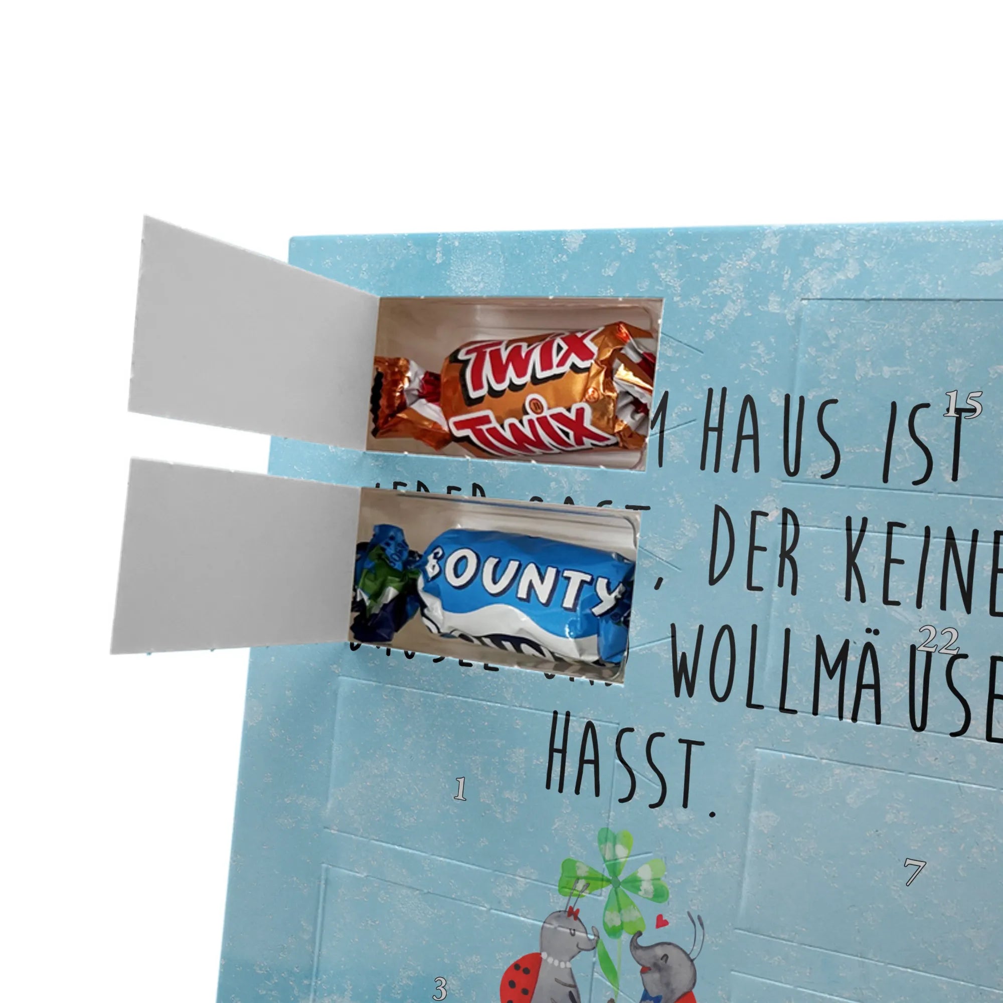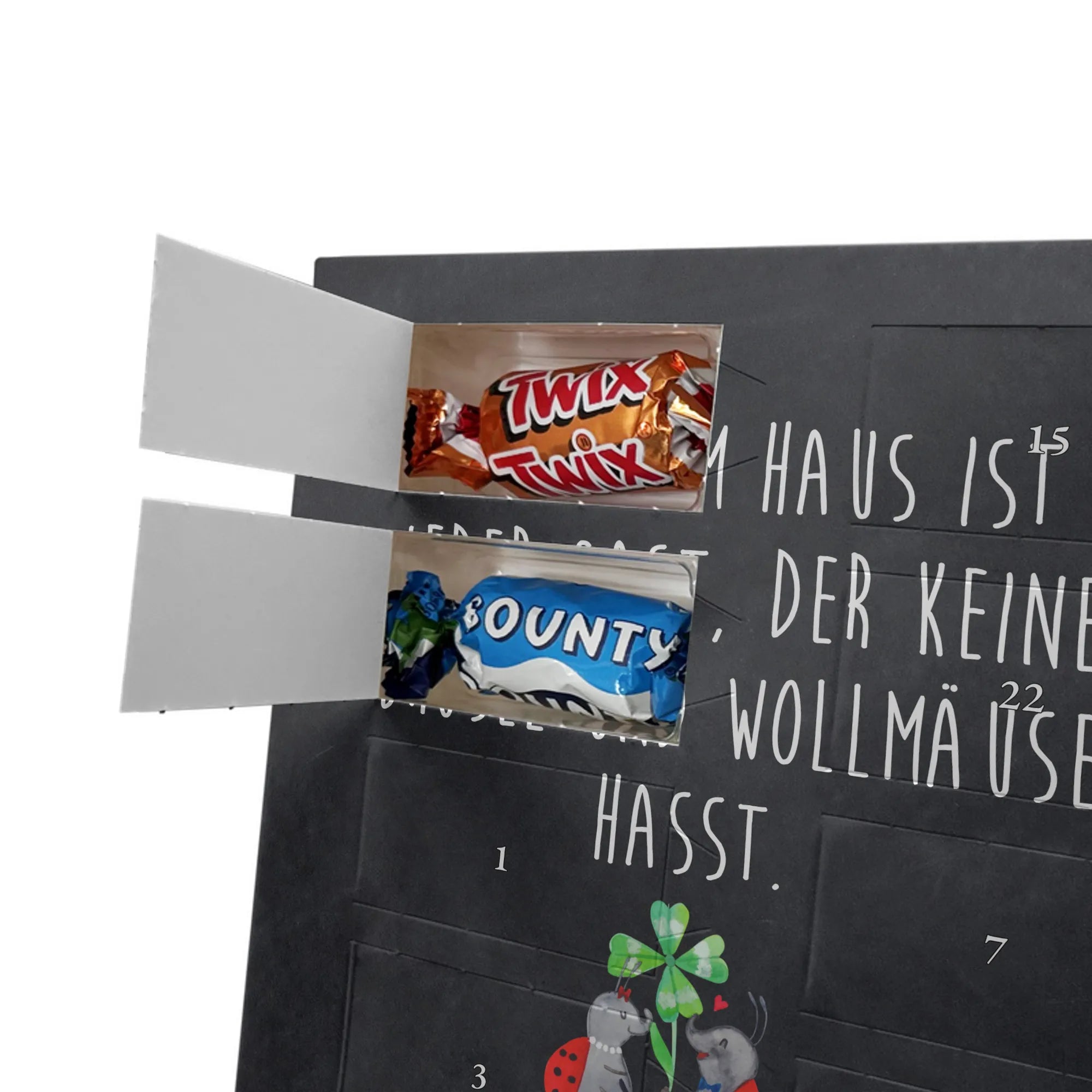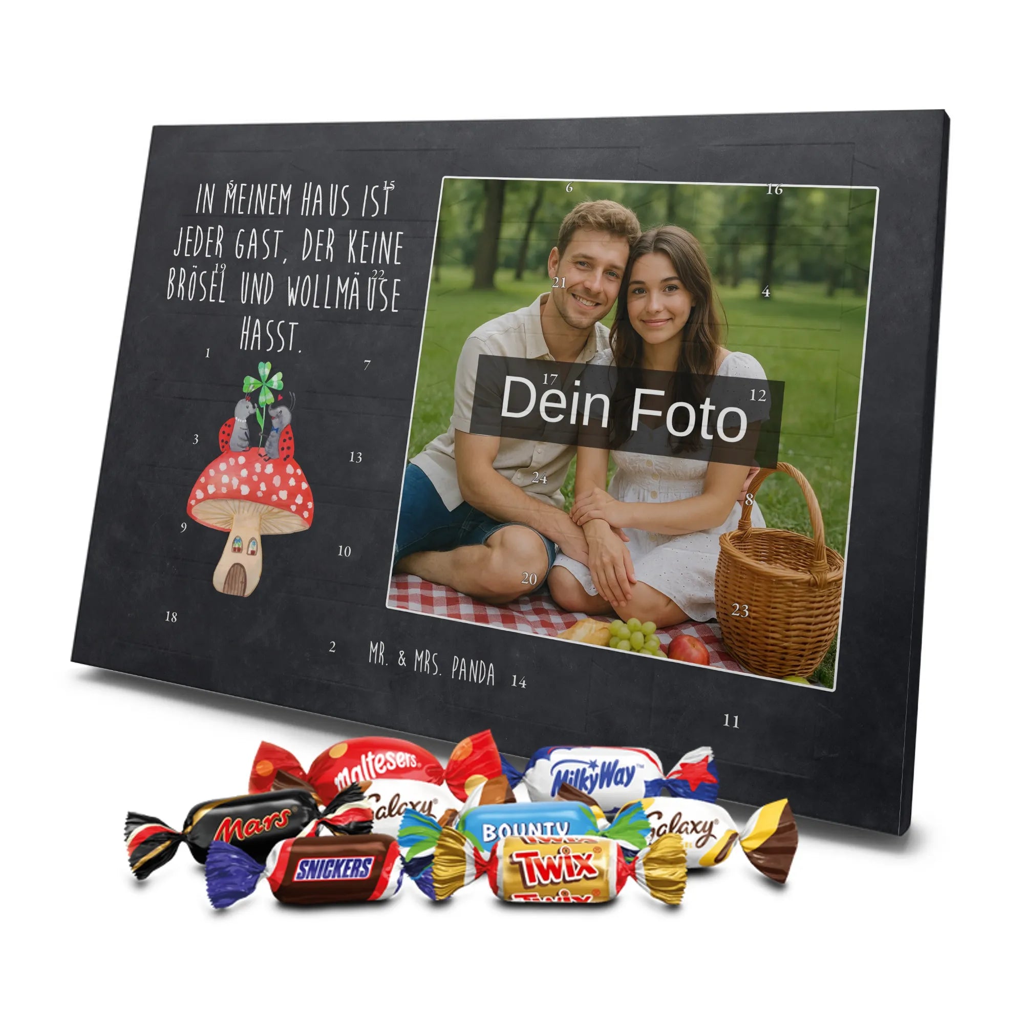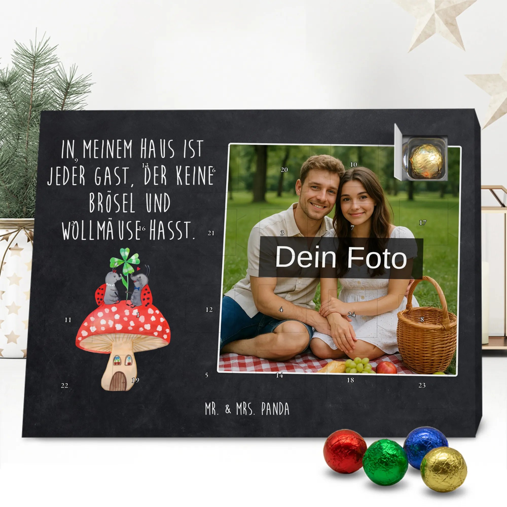 Liebevoller Foto Adventskalender personalisiert von Mr. & Mrs. Panda – der perfekte Begleiter durch die Adventszeit. Bedruckt mit unseren beliebten Motiven & Sprüchen, kannst du den Kalender mit einem persönlichen Foto versehen. Achte auf hohe Auflösung und einen passenden Bildausschnitt, damit das Motiv optimal zur Geltung kommt. Verwende nur Bilder, für die du die Rechte besitzt, um rechtliche Probleme zu vermeiden. Der Kalender bietet brillante Druckqualität, eine seidenmatte Oberflächenveredelung und bedruckte Seitenflächen. Maße: 233 mm x 178 mm x 24 mm. Besonderheit: Er lässt sich sowohl aufstellen als auch aufhängen. Bitte beachte: Die Fotos werden weder aufbereitet noch zugeschnitten, daher ist eine Rücknahme bei personalisierten Foto-Artikeln ausgeschlossen. Gefüllt mit MARKENNAMEN Schokolade und leckeren Schokoladenkugeln. Hinweis: Kann Spuren von Haselnüssen, Mandeln, Gluten und Soja enthalten. Kühl und trocken lagern. Schenke persönliche Vorfreude – jeden Tag ein kleines Highlight mit Schokolade und Erinnerungen.