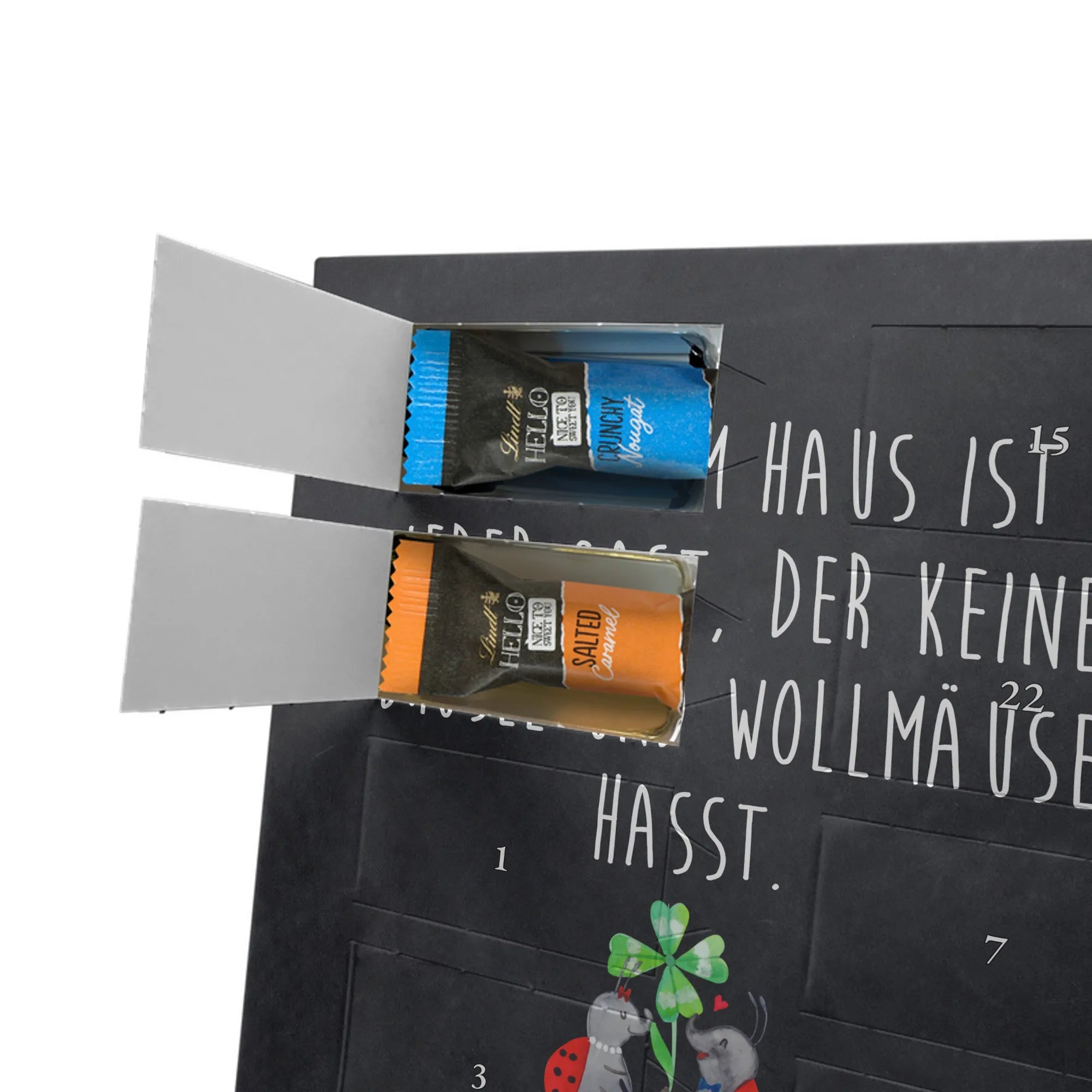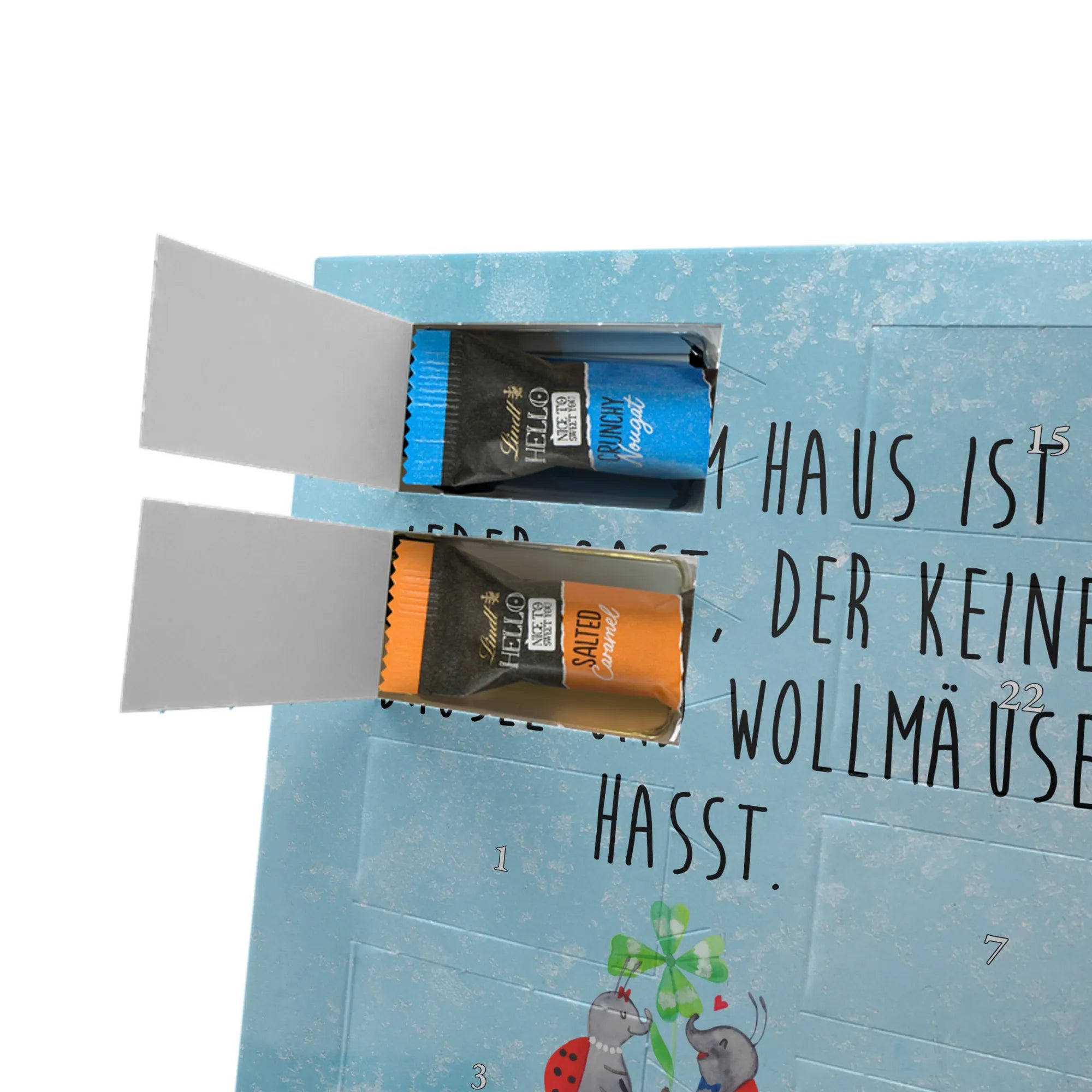 Wunderschöner Personalisierter Schoko Foto Adventskalender von Mr. & Mrs. Panda – perfekt, um dir oder deinen Liebsten die Vorweihnachtszeit zu versüßen. Dieser Adventskalender ist mit liebevollen Motiven und herzlichen Sprüchen von Mr. & Mrs. Panda bedruckt und du kannst ihn ganz einfach mit einem persönlichen Foto individualisieren. Achte bitte darauf, dass dein Foto eine hohe Auflösung hat und der Bildausschnitt passt, damit das Druckergebnis klar und strahlend wird. Lade nur Bilder hoch, an denen du die Bildrechte besitzt oder für die du die Erlaubnis hast. Die brillante Druckqualität mit seidenmatter Oberflächenveredelung sorgt für einen edlen Look, die Seitenflächen sind ebenfalls bedruckt. Maße: 325 mm x 225 mm x 27 mm. Der Kalender enthält 24 einzeln verpackte Schokoladen Mini Sticks in vier verschiedenen Sorten: Karamell-Schokoladenkuchen, Kekse, Knuspriger Nougat und Erdbeer-Cheesecake. Gefüllt mit Lindt Hello Schokolade. Allergene: Milcheiweiß, Milchzucker, Soja, Weizen, Haselnüsse. Kann Mandeln und andere Schalenfrüchte enthalten. Besonderheiten: Der Kalender kann aufgehängt oder aufgestellt werden. Bitte beachte: Die Fotos werden weder aufbereitet noch zugeschnitten – Rücknahme bei personalisierten Foto-Artikeln ist ausgeschlossen. Wir von Mr. & Mrs. Panda wünschen dir eine zuckersüße Adventszeit mit deinem ganz persönlichen Foto-Adventskalender!