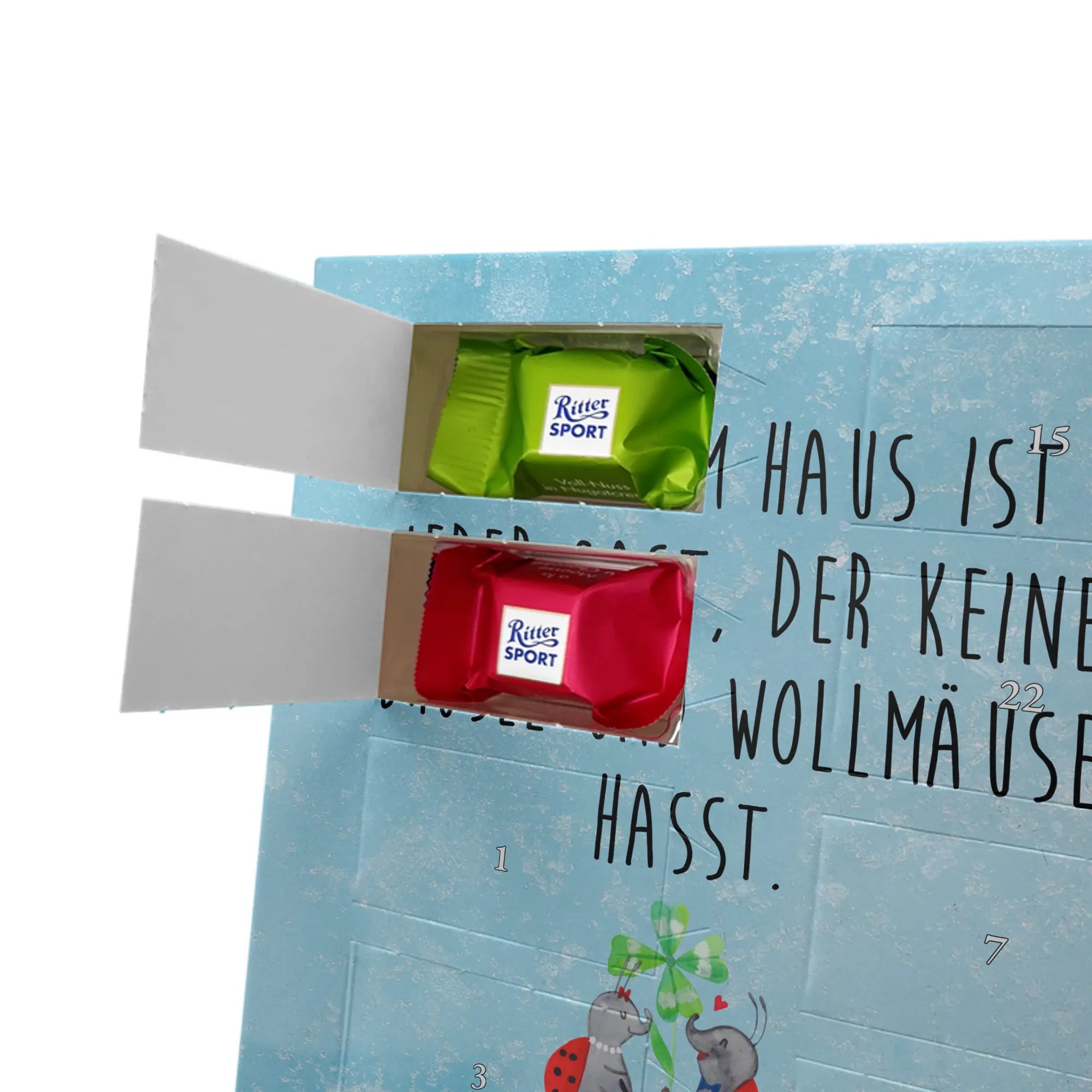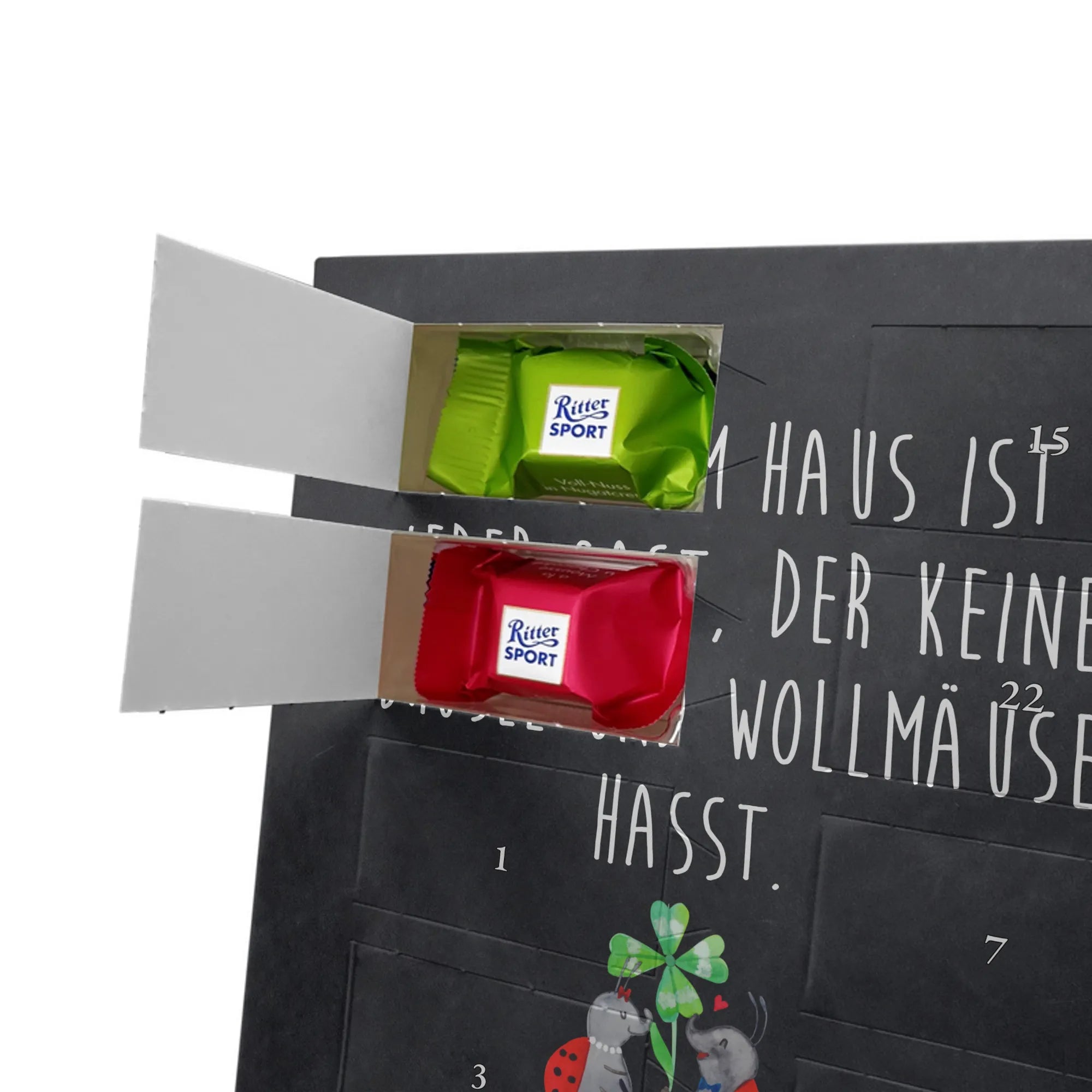 Personalisiertes Schoko-Foto Adventskalender von Mr. & Mrs. Panda – zaubere ein Lächeln in die Adventszeit mit einem persönlichen Foto und unseren liebevollen Motiven & Sprüchen. Der Kalender ist hochwertig bedruckt, verfügt über seidenmatte Oberflächenveredelung und bedruckte Seitenflächen für ein besonders schönes Erscheinungsbild. Bitte lade ein Foto in hoher Auflösung hoch und achte auf den richtigen Bildausschnitt, damit wichtige Details nicht verloren gehen. Verwende nur Bilder, bei denen du die Rechte besitzt; Fotos werden weder aufbereitet noch zugeschnitten und personalisierte Foto Artikel sind vom Umtausch ausgeschlossen. Maße: 325 mm x 225 mm x 27 mm. Besonderheit: Der Adventskalender kann aufgehängt oder aufgestellt werden – ganz flexibel. Gefüllt ist er mit Ritter Sport Schokowürfeln in köstlichen Geschmacksrichtungen wie Mousse au Chocolat, Schoko Crisp, Voll-Nuss in Nougatcreme, Karamell Duo, Joghurt und Erdbeer-Joghurt. Ein persönliches, süßes Geschenk, das hochwertige Optik mit täglichem Genuss verbindet und die Vorfreude auf Weihnachten jeden Tag steigert.