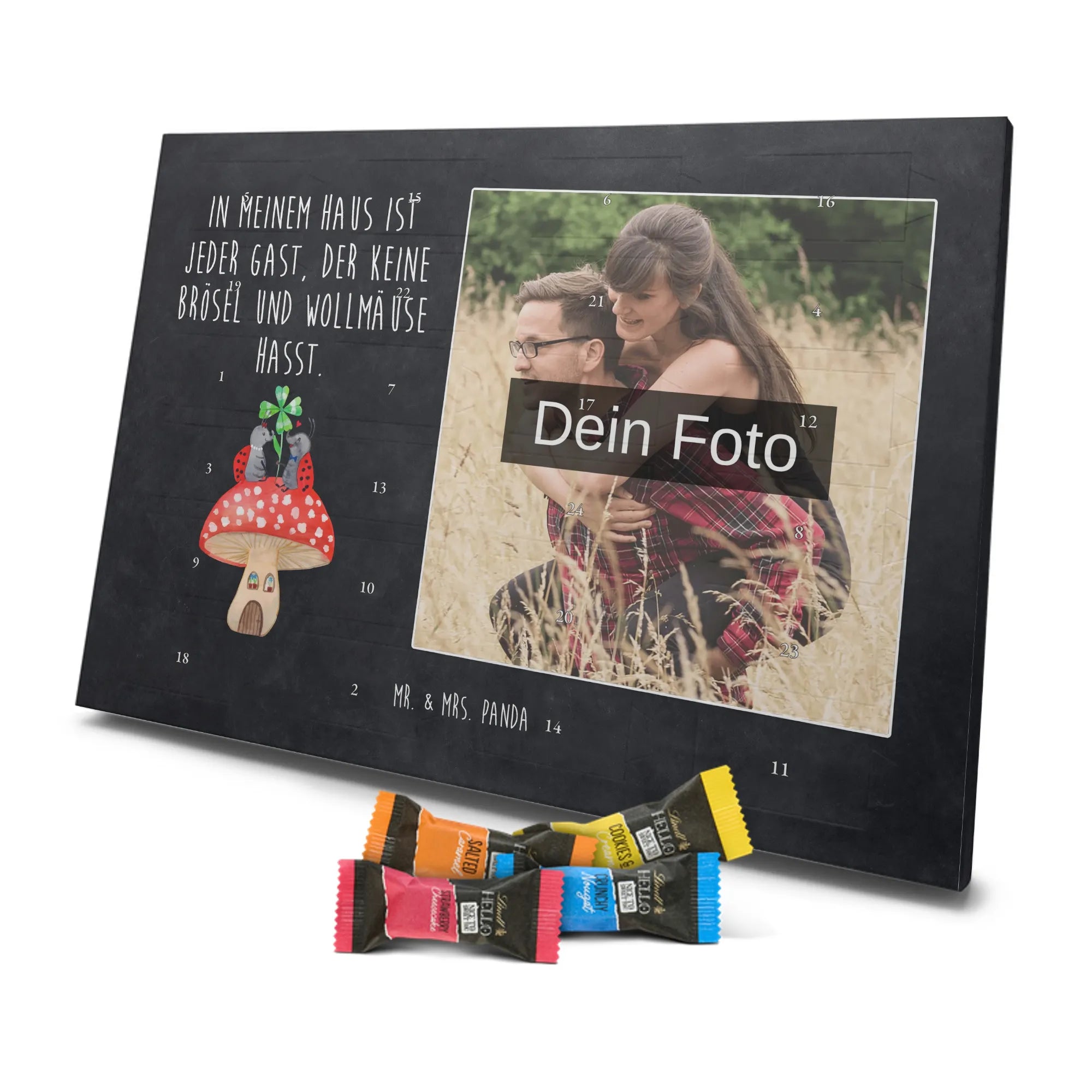 Unser bezaubernder Personalisierter Schokoladen Foto Adventskalender von Mr. & Mrs. Panda bringt persönliche Freude in die Vorweihnachtszeit. Du lädst ein Foto hoch, wir drucken es zusammen mit unseren liebevollen Illustrationen und Sprüchen – so entsteht ein ganz persönliches Geschenk. Achte auf hohe Bildqualität und darauf, dass der Bildausschnitt passt, denn wir nehmen keine Anpassungen am Foto vor. Die Verarbeitung ist hochwertig: seidenmatte Oberflächenveredelung, bedruckte Seitenflächen und eine stabile Konstruktion. Der Kalender kann sowohl aufgehängt als auch aufgestellt werden – flexibel und hübsch. Maße: 233 mm x 178 mm x 24 mm. Gefüllt mit Lindt Lindor Markenschokolade: 24 einzeln verpackte Markenschokoladen Kugeln, Sorten: Vollmilch, Feinherb und Weiße Schokolade. Zutatenhinweis: Zucker, pflanzliches Fett, Kakaobutter u.v.m.; kann Spuren von Haselnüssen und Mandeln enthalten. Wichtig: Lade nur Fotos hoch, für die du Nutzungsrechte hast; personalisierte Foto-Artikel sind vom Umtausch ausgeschlossen. Verschenke einen Advent mit Herz von Mr. & Mrs. Panda.
