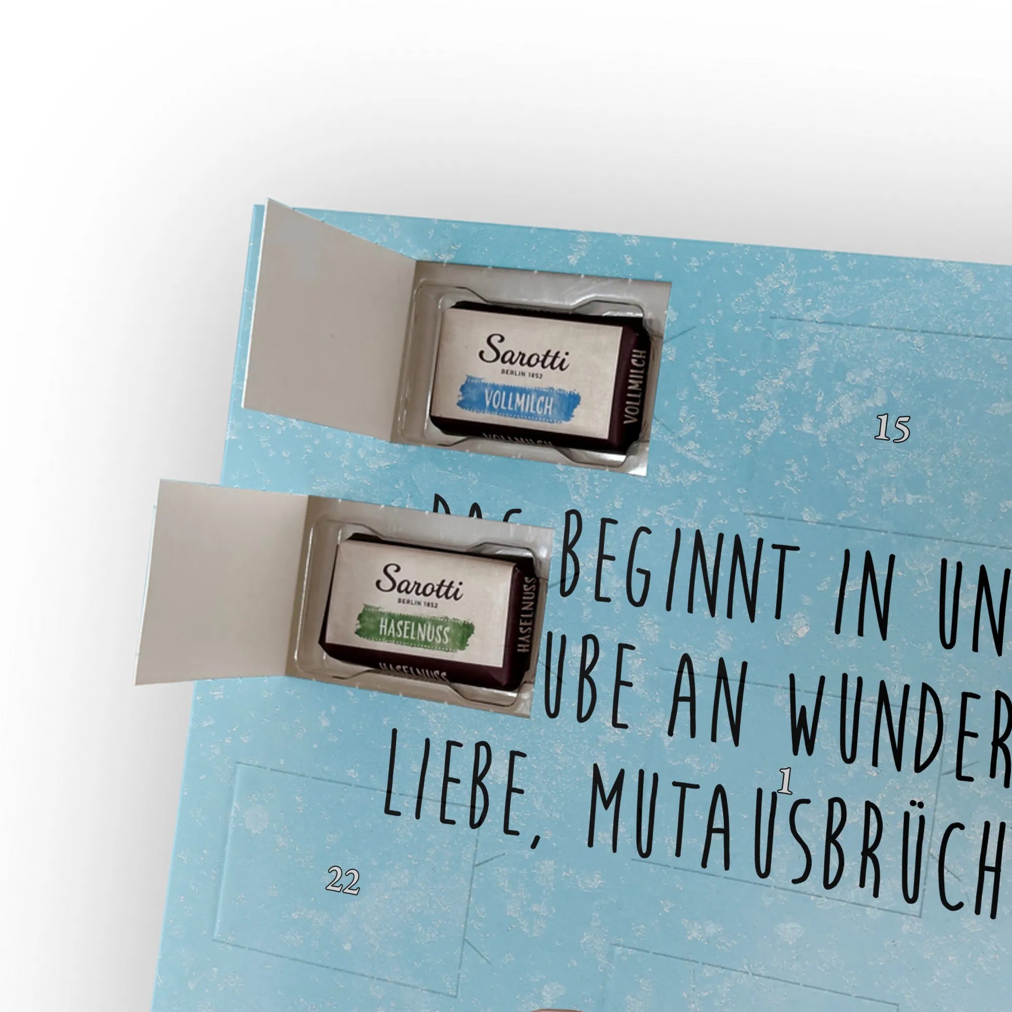 Personalisierter Foto Adventskalender mit Schokolade – die perfekte Überraschung in der Adventszeit von Mr. & Mrs. Panda! Dieser Kalender kombiniert unsere charmanten Motive und Sprüche mit deinem eigenen Foto und wird auf seidenmattes Material gedruckt, das wunderbar wirkt. Achte bei der Personalisierung auf eine hohe Auflösung deines Fotos und einen passenden Bildausschnitt, damit Gesichter und wichtige Details nicht verloren gehen. Verwende nur Bilder, für die du die Bildrechte besitzt. Bedruckte Seitenflächen und brillante Druckqualität machen den Kalender zu einem echten Hingucker. Maße: 355 mm x 245 mm x 11 mm; praktisch zum Aufhängen oder Aufstellen. Besonderheit: Fotos werden nicht nachbearbeitet oder zugeschnitten – Rücknahme bei personalisierten Foto Artikeln ist ausgeschlossen. Gefüllt ist der Kalender mit einer hochwertigen Auswahl an 24 einzeln verpackten Schokoladentäfelchen von Sarotti® und Confiserie Heidel® in vier leckeren Geschmacksrichtungen. Insgesamt enthält der Kalender 107 g Markenschokolade in den Sorten Vollmilch, Nougat, Zartbitter und Haselnuss. Verschenke Freude, Persönlichkeit und süßen Genuss in einem – mit viel Liebe von Mr. & Mrs. Panda.