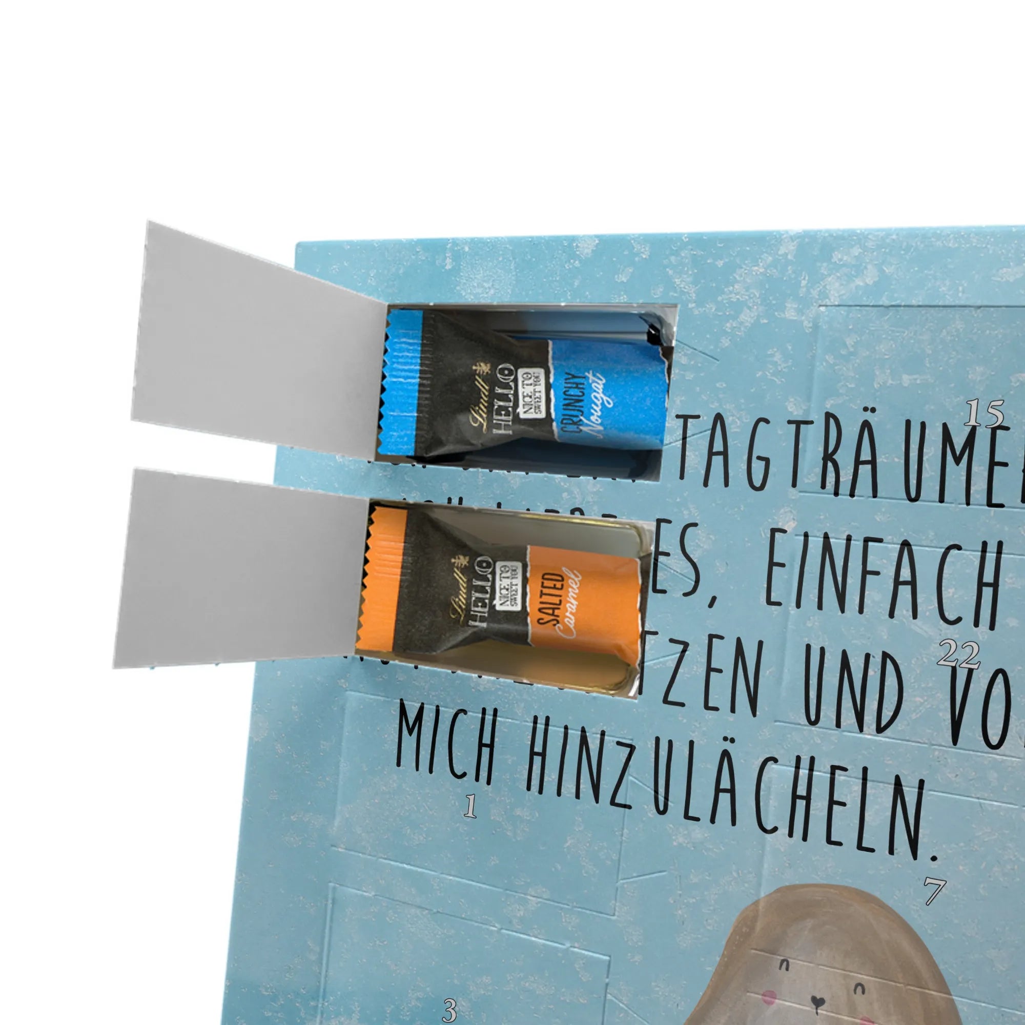 Wunderschöner Personalisierter Schoko Foto Adventskalender von Mr. & Mrs. Panda – perfekt, um dir oder deinen Liebsten die Vorweihnachtszeit zu versüßen. Dieser Adventskalender ist mit liebevollen Motiven und herzlichen Sprüchen von Mr. & Mrs. Panda bedruckt und du kannst ihn ganz einfach mit einem persönlichen Foto individualisieren. Achte bitte darauf, dass dein Foto eine hohe Auflösung hat und der Bildausschnitt passt, damit das Druckergebnis klar und strahlend wird. Lade nur Bilder hoch, an denen du die Bildrechte besitzt oder für die du die Erlaubnis hast. Die brillante Druckqualität mit seidenmatter Oberflächenveredelung sorgt für einen edlen Look, die Seitenflächen sind ebenfalls bedruckt. Maße: 325 mm x 225 mm x 27 mm. Der Kalender enthält 24 einzeln verpackte Schokoladen Mini Sticks in vier verschiedenen Sorten: Karamell-Schokoladenkuchen, Kekse, Knuspriger Nougat und Erdbeer-Cheesecake. Gefüllt mit Lindt Hello Schokolade. Allergene: Milcheiweiß, Milchzucker, Soja, Weizen, Haselnüsse. Kann Mandeln und andere Schalenfrüchte enthalten. Besonderheiten: Der Kalender kann aufgehängt oder aufgestellt werden. Bitte beachte: Die Fotos werden weder aufbereitet noch zugeschnitten – Rücknahme bei personalisierten Foto-Artikeln ist ausgeschlossen. Wir von Mr. & Mrs. Panda wünschen dir eine zuckersüße Adventszeit mit deinem ganz persönlichen Foto-Adventskalender!