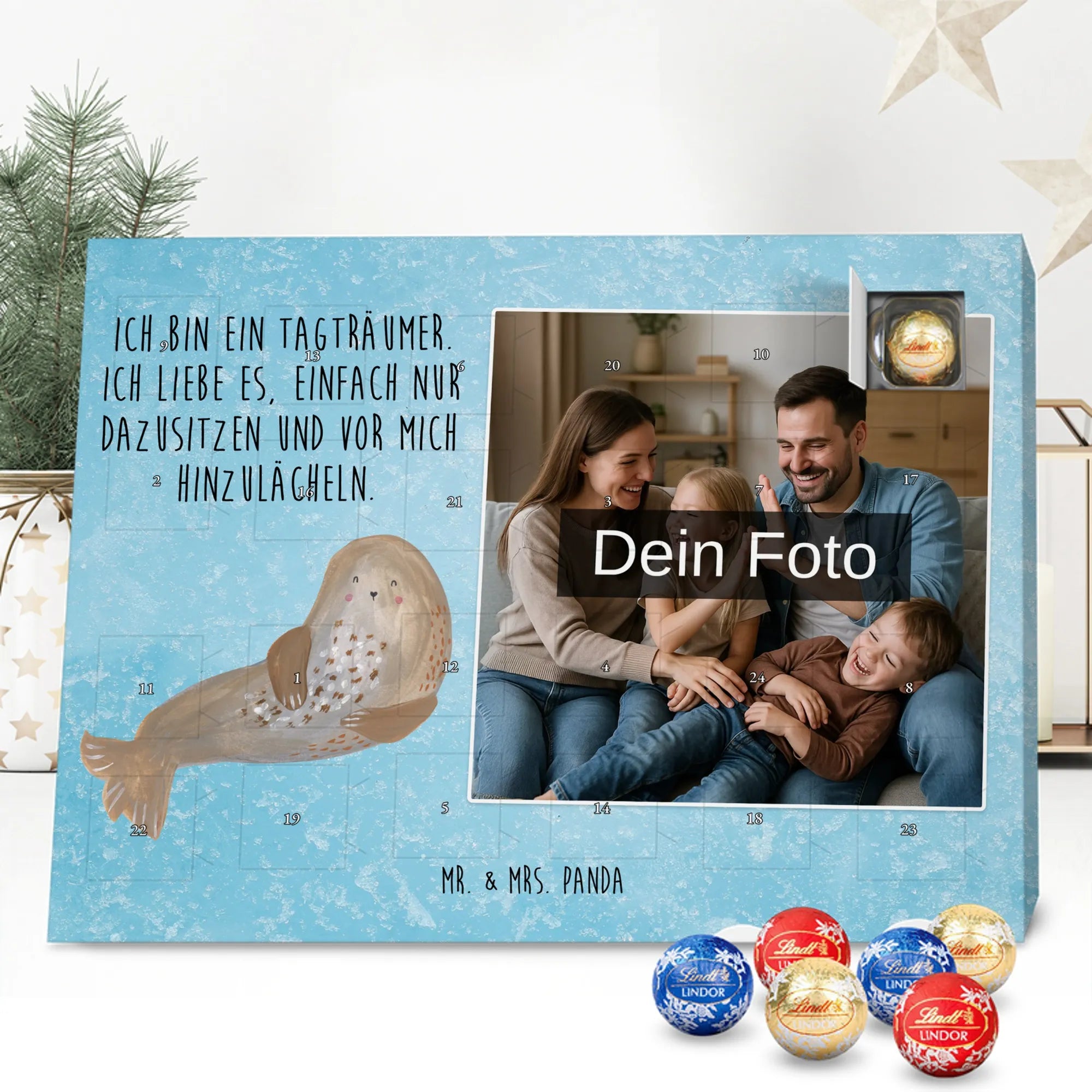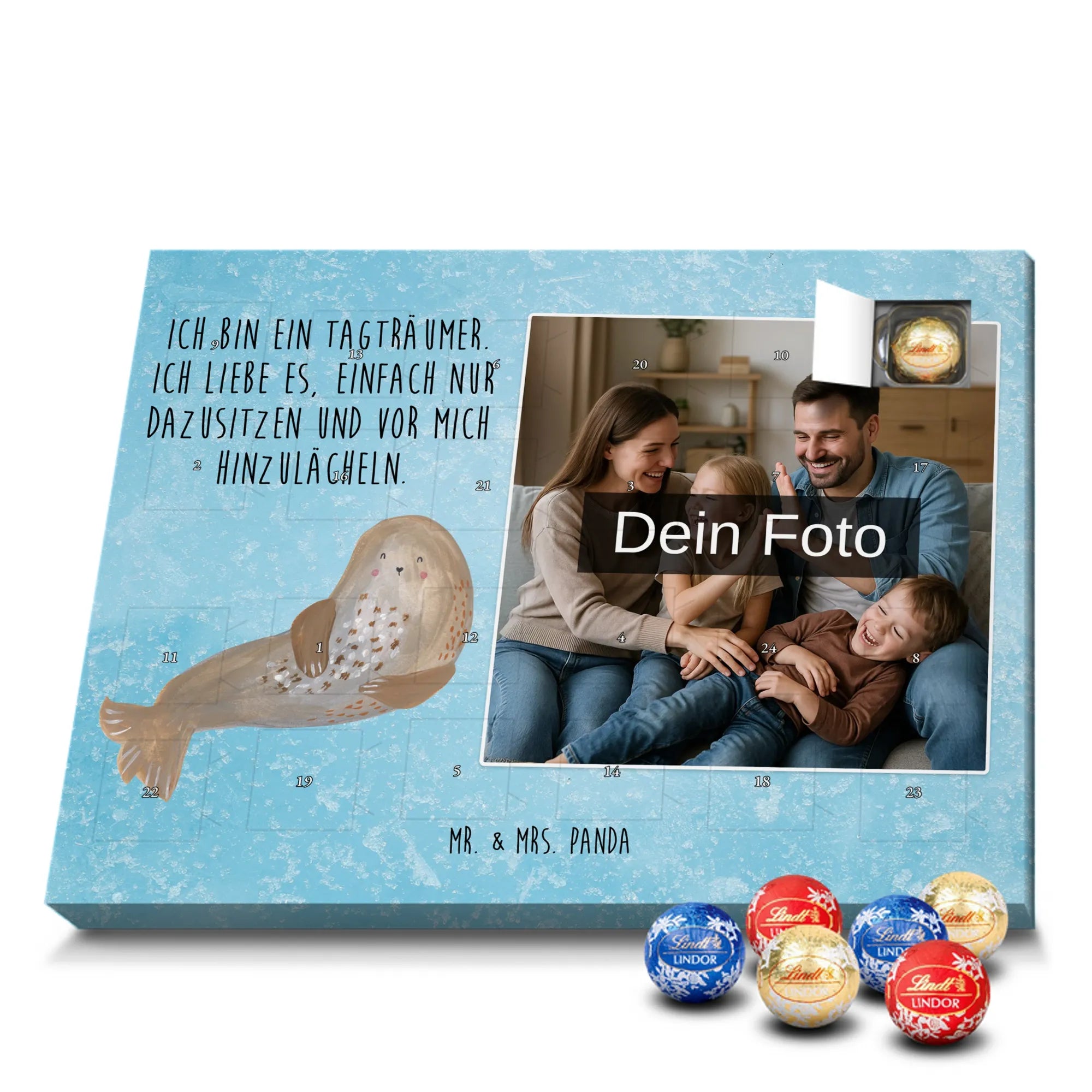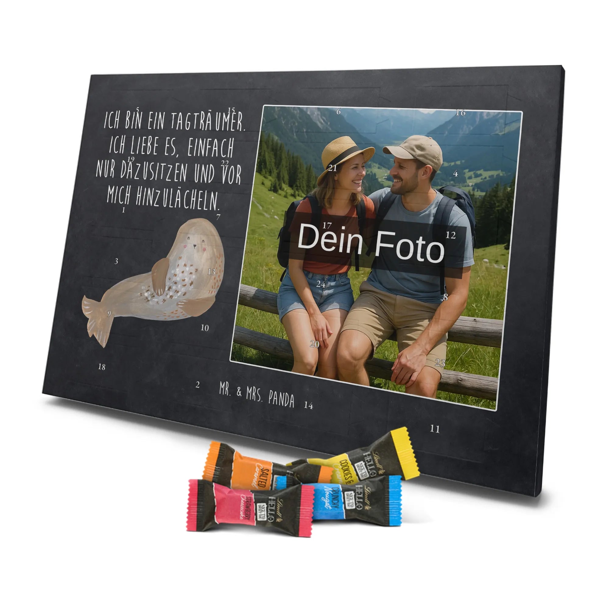 Wunderschöner Personalisierter Schoko Foto Adventskalender von Mr. & Mrs. Panda – perfekt zum Verschenken oder zum Verwöhnen. Dieser Adventskalender verbindet liebevolle Mr. & Mrs. Panda-Motive und Sprüche mit deinem persönlichen Foto auf der Vorderseite. Die hochwertige Verarbeitung mit seidenmatter Oberflächenveredelung sorgt für brillante Farben und eine edle Haptik, die man gerne anfasst. Bedruckte Seitenflächen und die stabile Ausführung machen den Kalender zum echten Hingucker in der Adventszeit. Bitte achte auf eine hohe Auflösung deines Fotos, damit das Druckergebnis klar und scharf wird, und wähle einen passenden Bildausschnitt, damit keine wichtigen Details abgeschnitten werden. Lade nur Bilder hoch, bei denen du die Rechte besitzt oder die Erlaubnis hast, besonders bei Fotos mit Personen. Wichtig: Die Fotos werden weder aufbereitet noch zugeschnitten – eine Rücknahme bei personalisierten Foto-Artikeln ist ausgeschlossen. Der Kalender kann aufgehängt oder aufgestellt werden, so wie es dir gefällt. Maße: 233 mm x 178 mm x 24 mm. Gefüllt mit Lindt Lindor Markenschokolade: 24 einzeln verpackte Markenschokoladen Kugeln in drei Sorten (Vollmilch, Feinherb, Weiße Schokolade). Zutatenhinweis: Kann Haselnüsse und Mandeln enthalten. Ein liebevoller, personalisierter Adventsmoment von Mr. & Mrs. Panda.