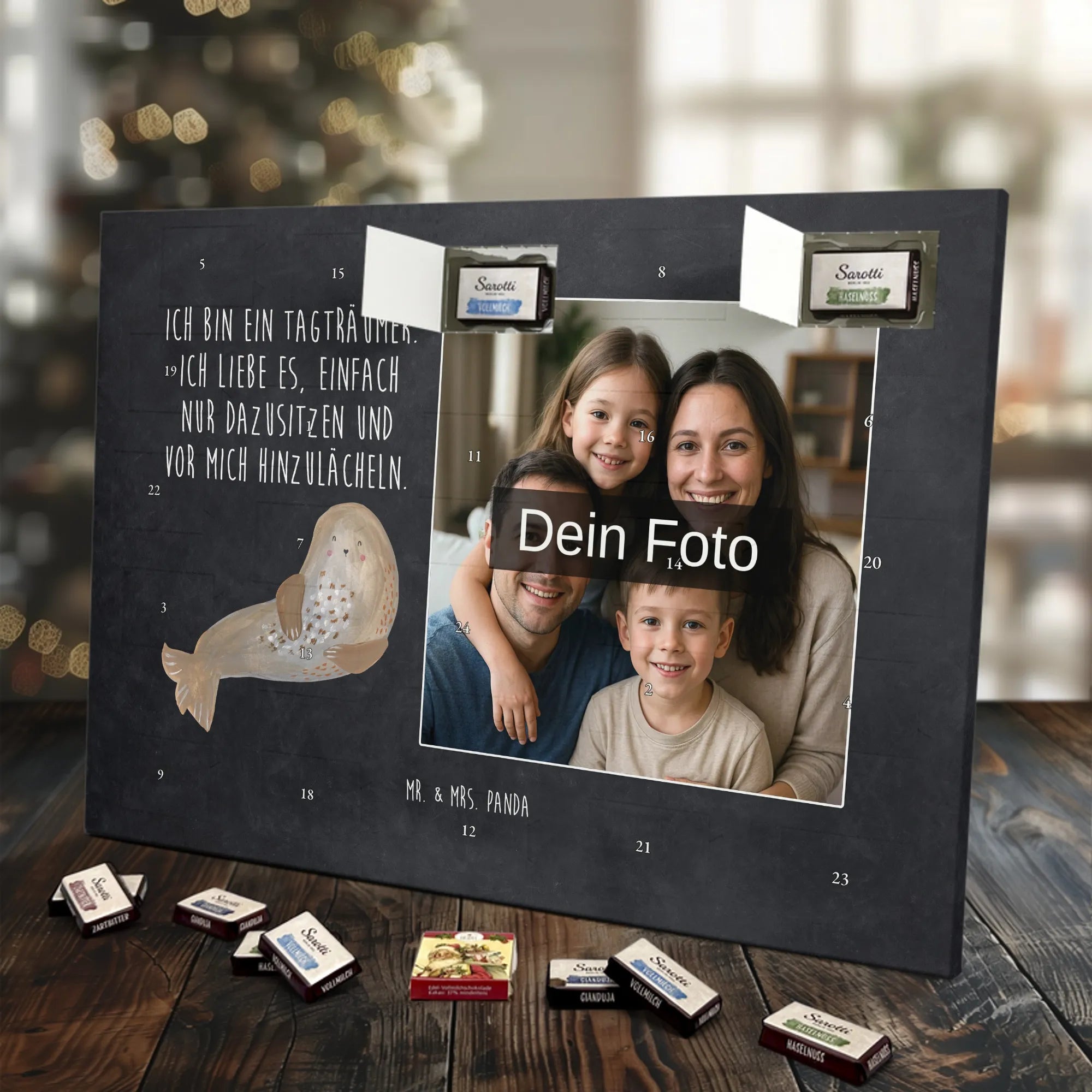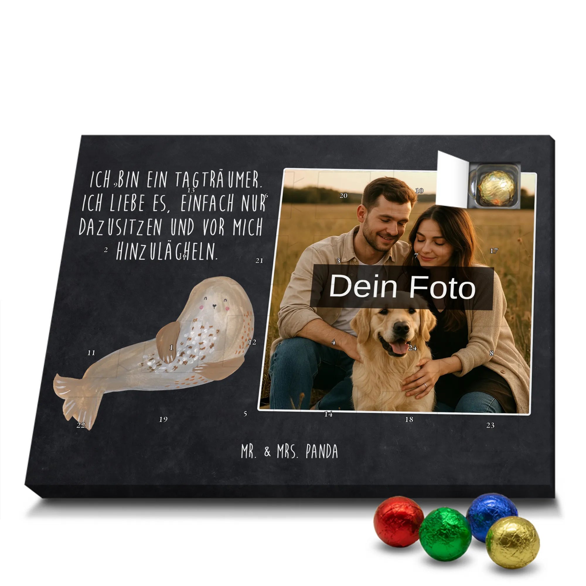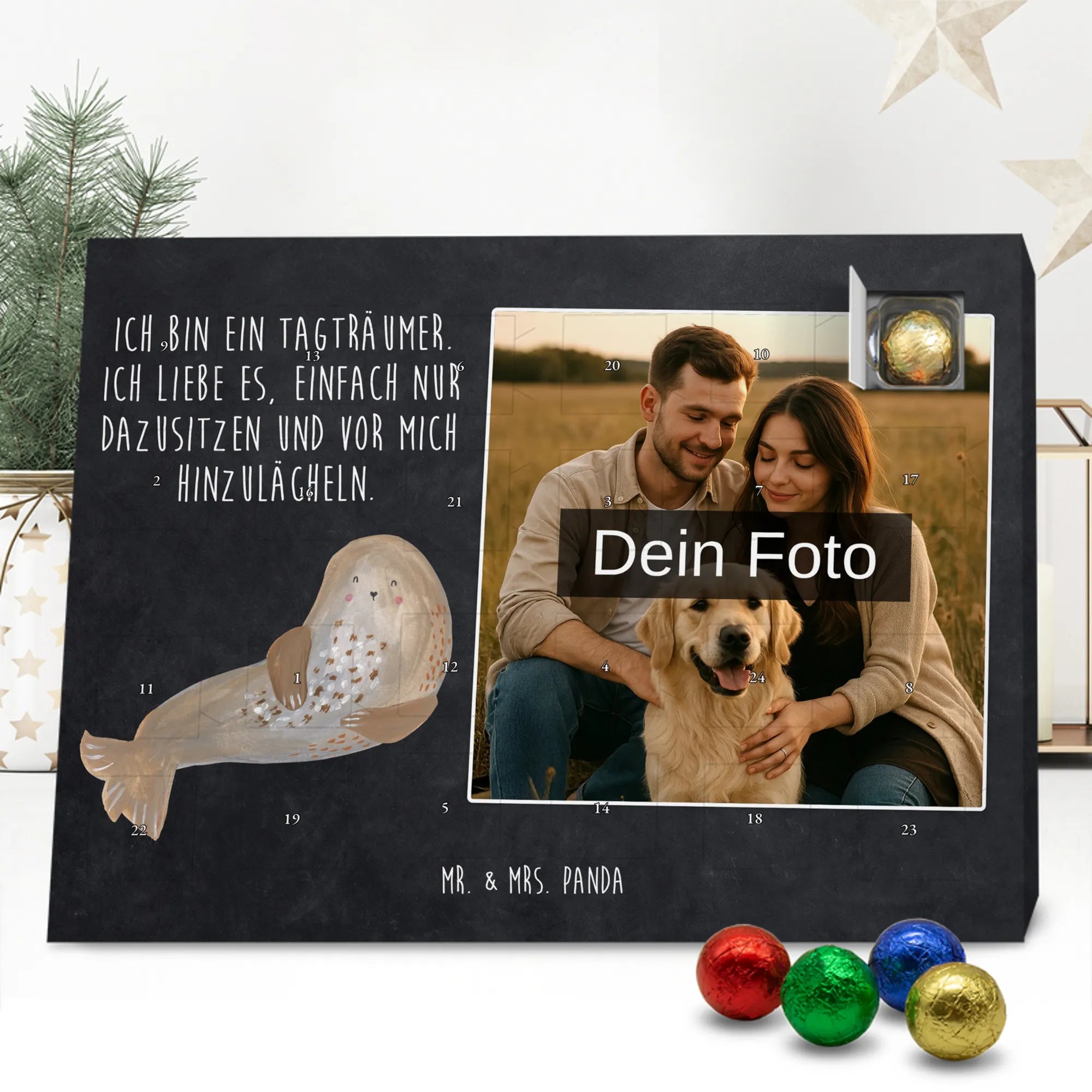 Liebevoller Foto Adventskalender personalisiert von Mr. & Mrs. Panda – der perfekte Begleiter durch die Adventszeit. Bedruckt mit unseren beliebten Motiven & Sprüchen, kannst du den Kalender mit einem persönlichen Foto versehen. Achte auf hohe Auflösung und einen passenden Bildausschnitt, damit das Motiv optimal zur Geltung kommt. Verwende nur Bilder, für die du die Rechte besitzt, um rechtliche Probleme zu vermeiden. Der Kalender bietet brillante Druckqualität, eine seidenmatte Oberflächenveredelung und bedruckte Seitenflächen. Maße: 233 mm x 178 mm x 24 mm. Besonderheit: Er lässt sich sowohl aufstellen als auch aufhängen. Bitte beachte: Die Fotos werden weder aufbereitet noch zugeschnitten, daher ist eine Rücknahme bei personalisierten Foto-Artikeln ausgeschlossen. Gefüllt mit MARKENNAMEN Schokolade und leckeren Schokoladenkugeln. Hinweis: Kann Spuren von Haselnüssen, Mandeln, Gluten und Soja enthalten. Kühl und trocken lagern. Schenke persönliche Vorfreude – jeden Tag ein kleines Highlight mit Schokolade und Erinnerungen.