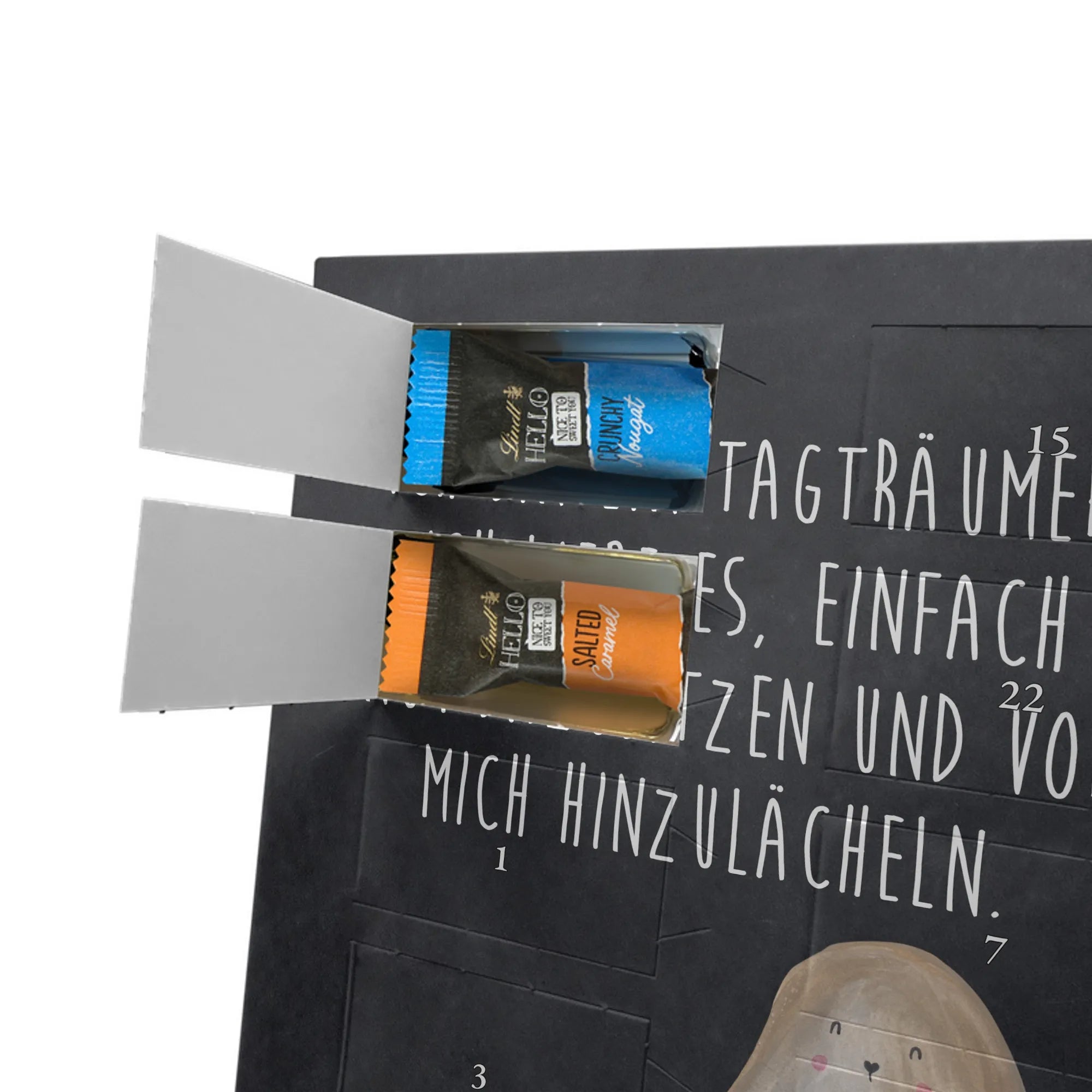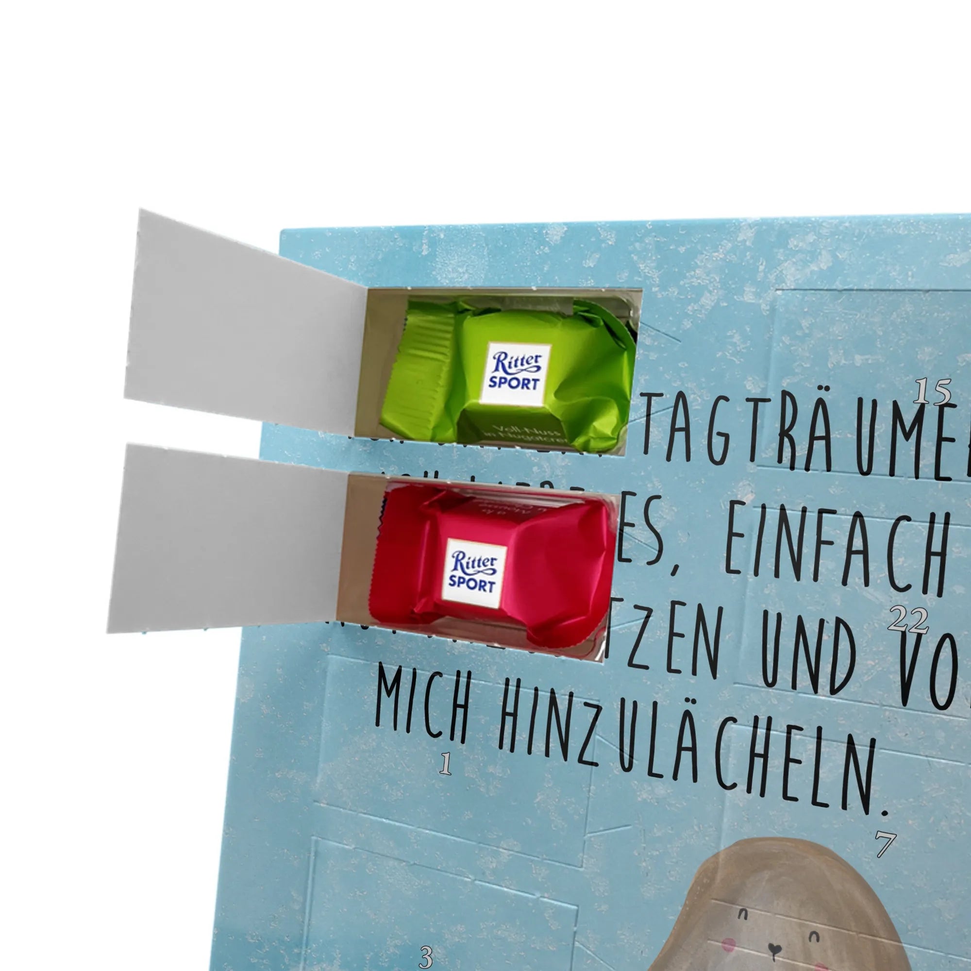Wunderschöner Personalisierter Schoko Foto Adventskalender von Mr. & Mrs. Panda – das perfekte Geschenk für deine Liebsten! Dieser Adventskalender ist liebevoll gestaltet, bedruckt mit wunderschönen Motiven & Sprüchen von Mr. & Mrs. Panda und personalisierbar mit einem Foto deiner Wahl. Achte bitte auf hohe Auflösung: Lade ein Foto in guter Qualität und ausreichender Auflösung hoch, damit das Druckergebnis klar und brillant wird. Achte auf den richtigen Bildausschnitt, damit keine wichtigen Details abgeschnitten werden. Wir empfehlen, den Kalender-Rahmen vorher anzusehen, um zu wissen, wie dein Foto platziert wird. Lade nur Bilder hoch, bei denen du die Bildrechte besitzt oder die Erlaubnis hast. Die Fotos werden weder aufbereitet noch zugeschnitten. Rücknahme bei personalisierten Foto Artikeln ist ausgeschlossen. Der Kalender besticht durch brillante Druckqualität mit seidenmatter Oberflächenveredelung und bedruckte Seitenflächen. Maße: 325 mm x 225 mm x 27 mm. Besonderheit: Kann aufgehängt oder aufgestellt werden – ganz wie du möchtest. Gefüllt ist der Kalender mit Ritter Sport Schokowürfeln in leckeren Geschmacksrichtungen: Mousse au Chocolat, Schoko Crisp, Voll-Nuss in Nougatcreme, Karamell Duo, Joghurt und Erdbeer-Joghurt. Ein zauberhaftes, persönliches Geschenk, das Vorfreude bereitet und jeden Tag im Advent versüßt!
