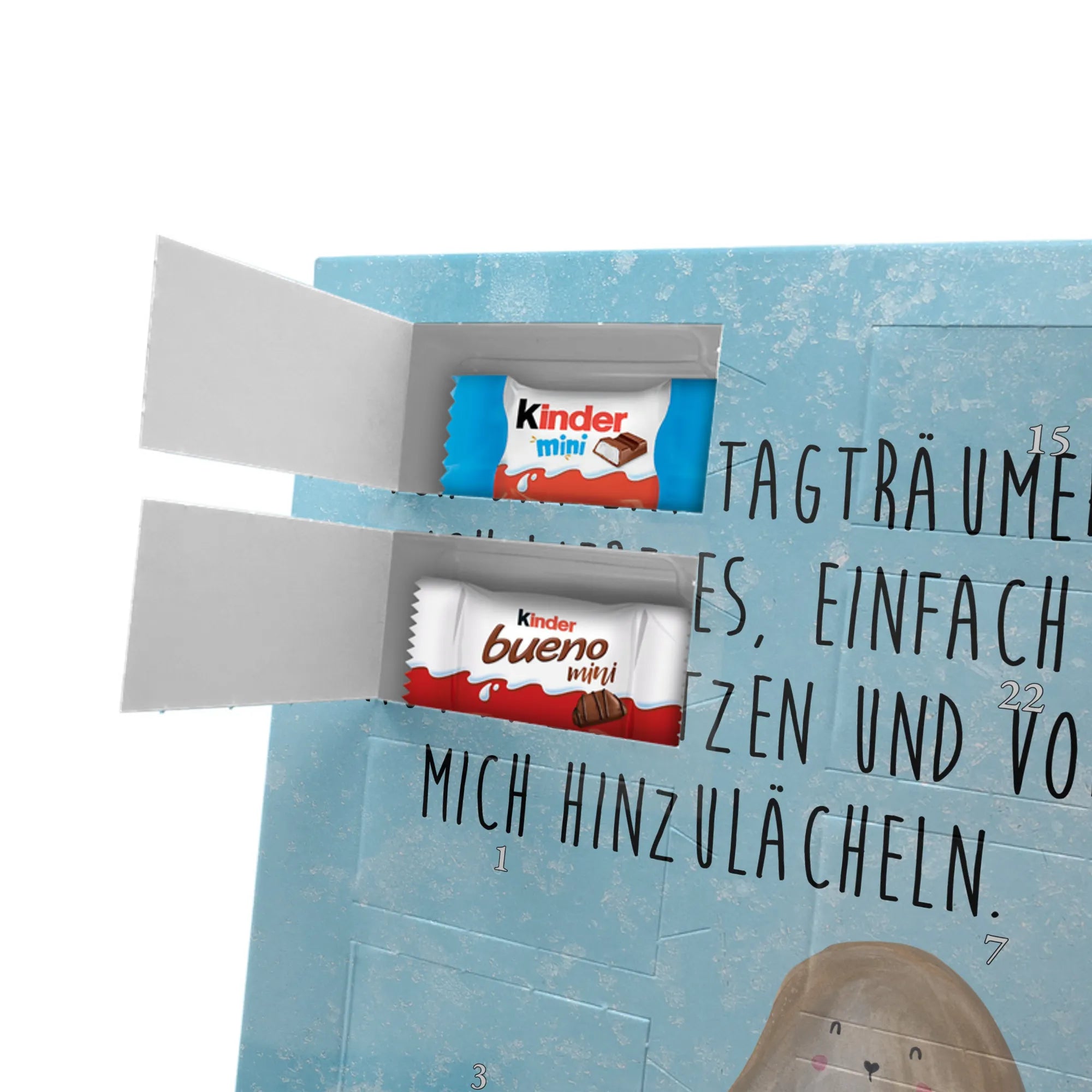 Unser personalisierten Schoko Foto Adventskalender ist ein echtes Highlight in der Adventszeit – handlich, individuell und voller süßer Überraschungen. Du personalisierst die Vorderseite mit deinem liebsten Foto und wir kombinieren es mit liebevollen Motiven und Sprüchen von Mr. & Mrs. Panda. Bitte achte auf eine ausreichende Bildauflösung und einen passenden Bildausschnitt, damit das Druckergebnis gestochen scharf ist. Lade nur Bilder hoch, deren Rechte du besitzt oder bei denen du die Erlaubnis hast, besonders wenn Personen darauf zu sehen sind. Wichtig: Fotos werden nicht retuschiert oder zugeschnitten; personalisierte Foto-Artikel sind vom Widerruf ausgeschlossen. Der Kalender besticht durch brillante Druckqualität und eine seidenmatte Oberflächenveredelung sowie bedruckte Seitenflächen. Maße: 355 mm x 245 mm x 11 mm. Du kannst ihn entweder aufstellen oder an die Wand hängen. Gefüllt ist der Adventskalender mit kinder® Schokolade, inklusive kinder® Schoko-Bons, kinder® Bueno mini und kinder® Schokolade mini. Ein liebevolles, persönliches Geschenk für Kinder, Freunde oder die bessere Hälfte – individuell, süß und mit dem typischen Mr. & Mrs. Panda Charme.
