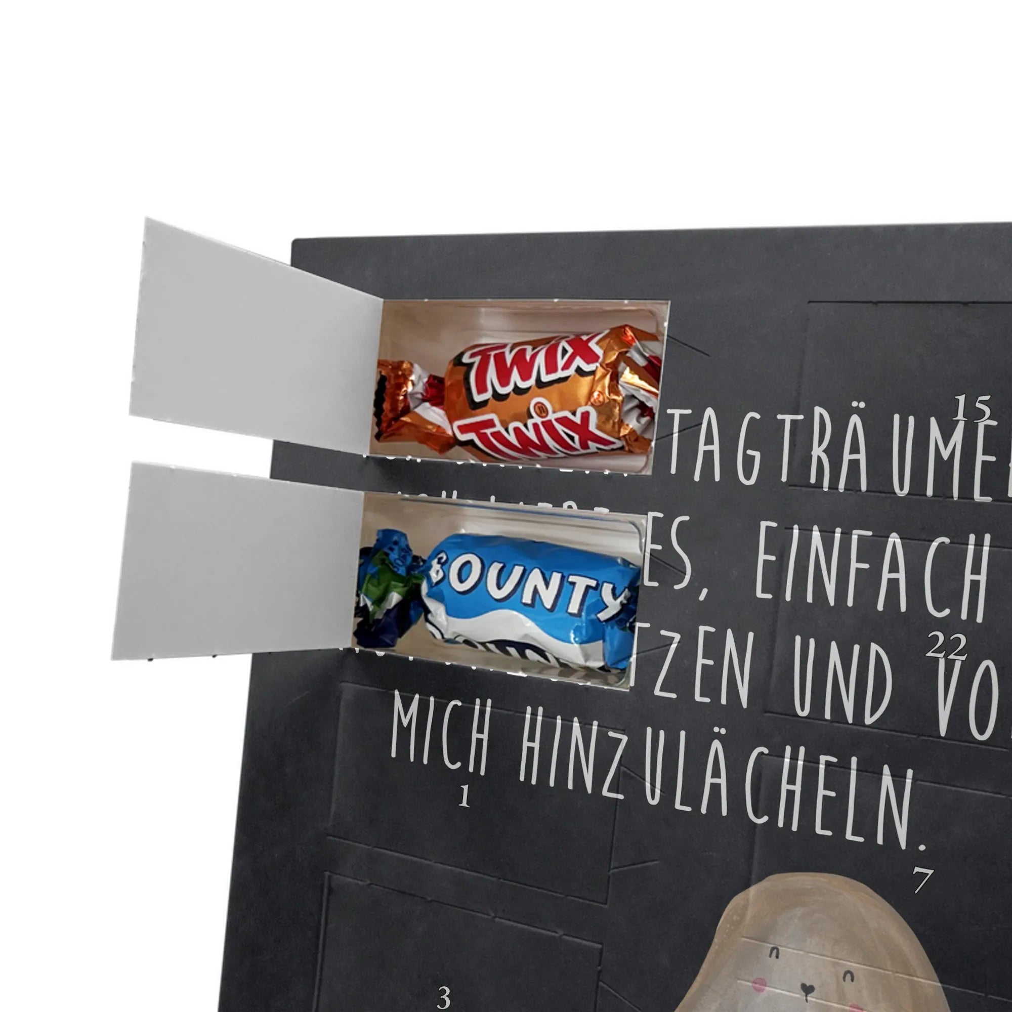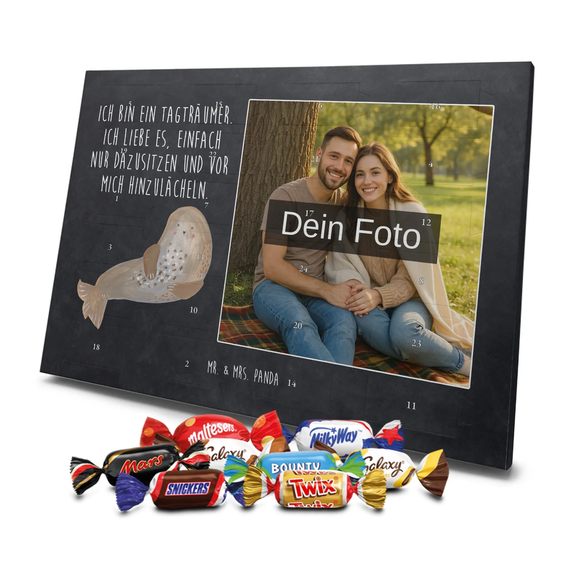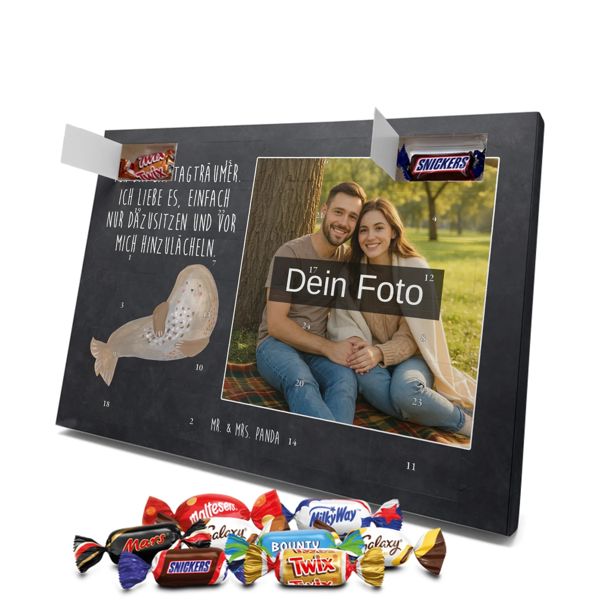 Herziger Personalisierter Foto Adventskalender mit Schokolade von Mr. & Mrs. Panda – perfekt, um schöne Erinnerungen sichtbar zu machen und jeden Dezembertag zu versüßen. Die Vorderseite ziert dein persönliches Foto, der Rest des Kalenders ist mit warmen Motiven und liebevollen Sprüchen von Mr. & Mrs. Panda gestaltet. Bitte lade ein Bild in hoher Auflösung hoch und prüfe den Bildausschnitt, damit nichts Wichtiges abgeschnitten wird. Verwende nur Fotos, bei denen du die Rechte besitzt oder die Zustimmung der abgebildeten Personen vorliegt. Unsere Drucke bestechen durch brillante Qualität und eine seidenmatte Oberflächenveredelung; auch die Seitenflächen sind bedruckt. Maße: 325 mm x 225 mm x 27 mm. Der Adventskalender lässt sich aufhängen oder aufstellen – ganz flexibel. Wichtiger Hinweis: Fotos werden nicht nachbearbeitet oder zugeschnitten; personalisierte Foto-Artikel sind vom Widerruf ausgeschlossen. Gefüllt ist der Kalender mit Celebrations Schokolade – 24 hochwertige Füllungen in 8 leckeren Sorten (Maltesers, Mars, Snickers, Twix, Milky Way, Bounty, Galaxy, Galaxy Caramel). Schenke ein persönliches Unikat, das Freude und Süße verbindet.