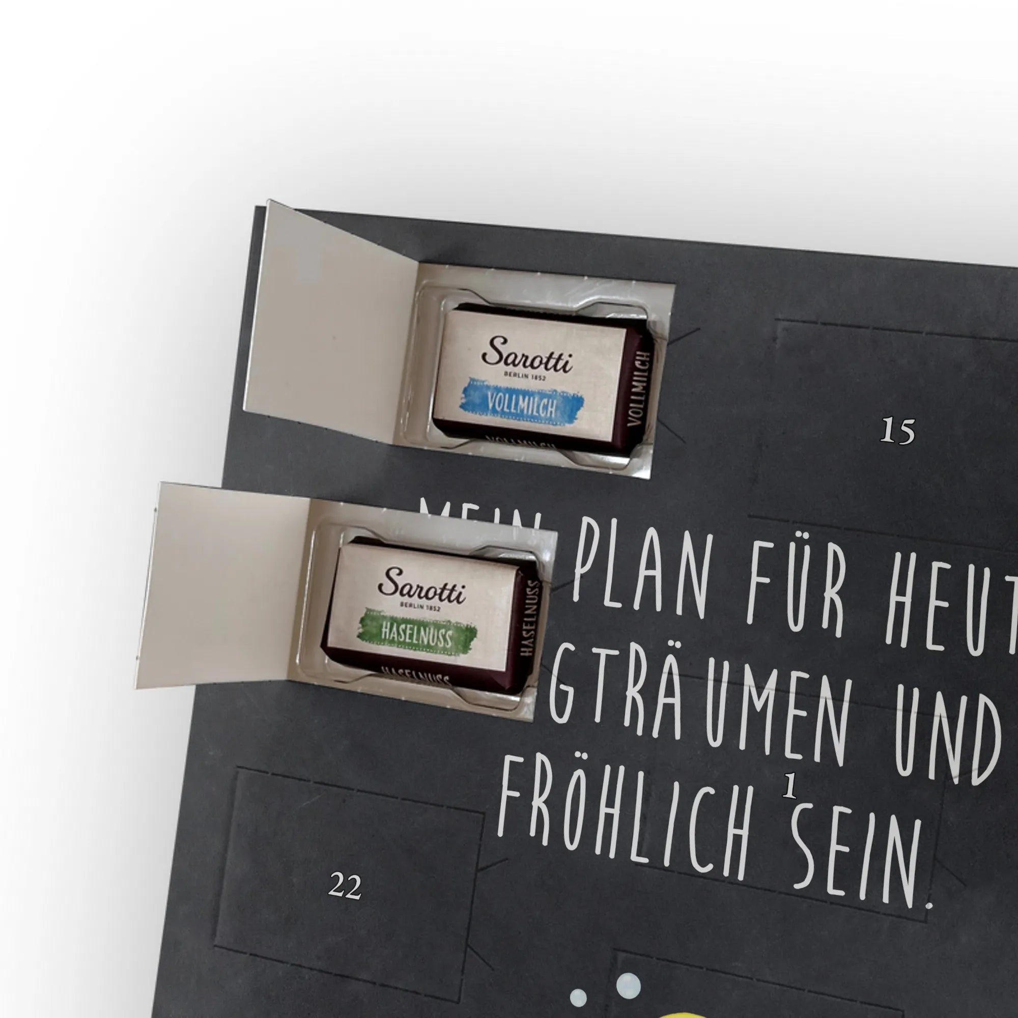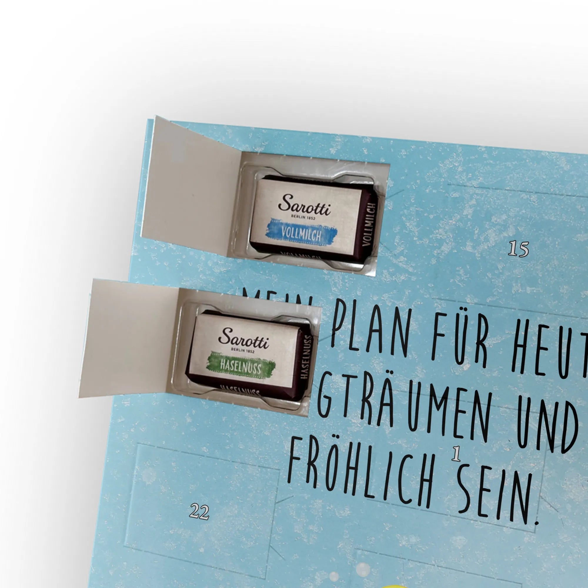 Lustiger Personalisierter Schoko Foto-Adventskalender – das Must-have für eine persönliche Adventszeit von Mr. & Mrs. Panda. Jeder Kalender wird mit unseren charmanten Illustrationen und liebevollen Sprüchen bedruckt, während dein Foto die Vorderseite einzigartig macht. Achte bitte darauf, ein Foto mit guter Qualität und ausreichend hoher Auflösung hochzuladen, damit der Druck gestochen scharf wirkt. Überprüfe den Bildausschnitt, damit wichtige Bereiche nicht verloren gehen. Denk daran, nur Bilder zu verwenden, bei denen du die nötigen Rechte besitzt. Die Verarbeitung ist hochwertig: brillante Druckqualität mit seidenmatter Oberflächenveredelung und bedruckten Seitenflächen. Maße: 325 mm x 225 mm x 27 mm. Du kannst den Kalender aufhängen oder aufstellen – sehr praktisch. Hinweis: Die hochgeladenen Fotos werden nicht nachbearbeitet oder zugeschnitten; Rücknahme bei personalisierten Foto-Artikeln ist ausgeschlossen. Gefüllt ist der Kalender mit Celebrations Schokolade – 24 Stück in 8 verschiedenen Sorten (Maltesers, Mars, Snickers, Twix, Milky Way, Bounty, Galaxy, Galaxy Caramel). Verschenke ein Stück persönlich gestaltete Vorfreude und mache jeden Dezembertag zu etwas Besonderem.