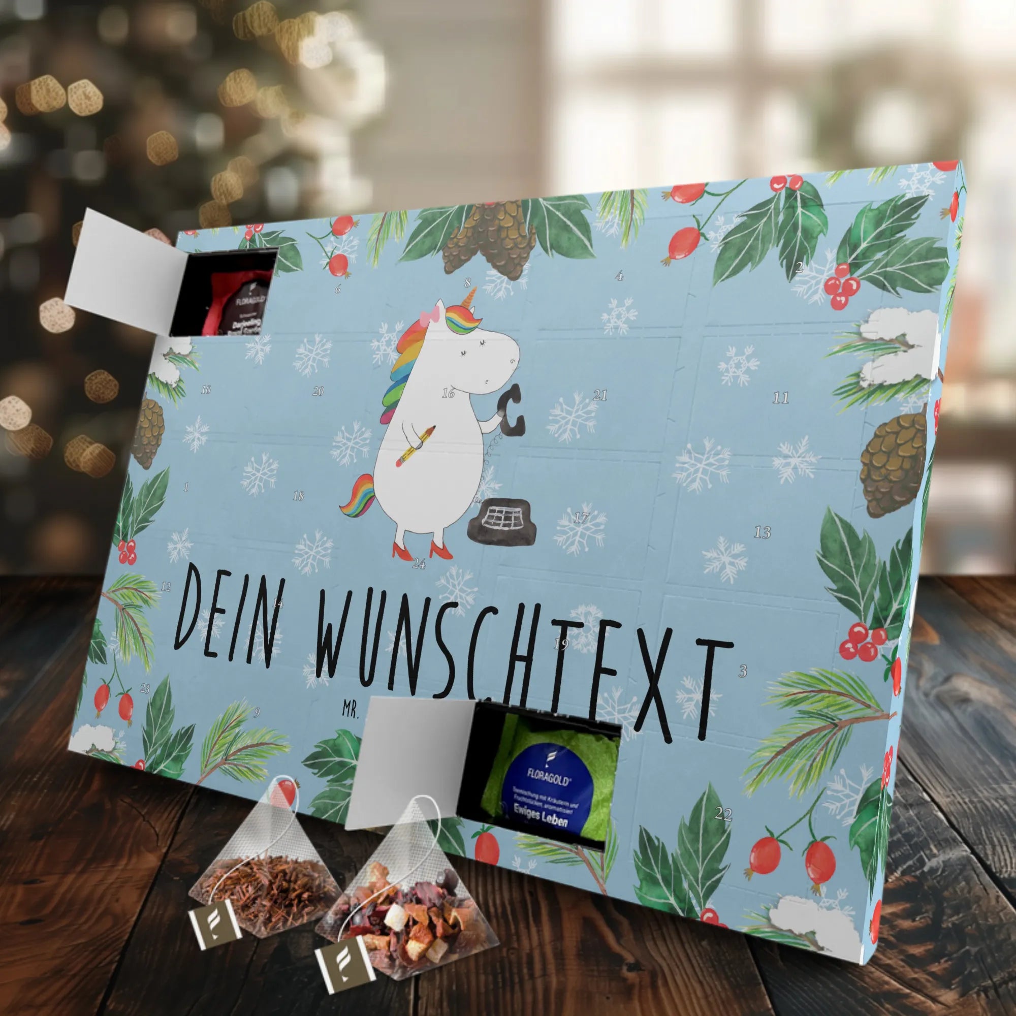 Personalisierter Tee Adventskalender Einhorn Sekretärin - Eisblau