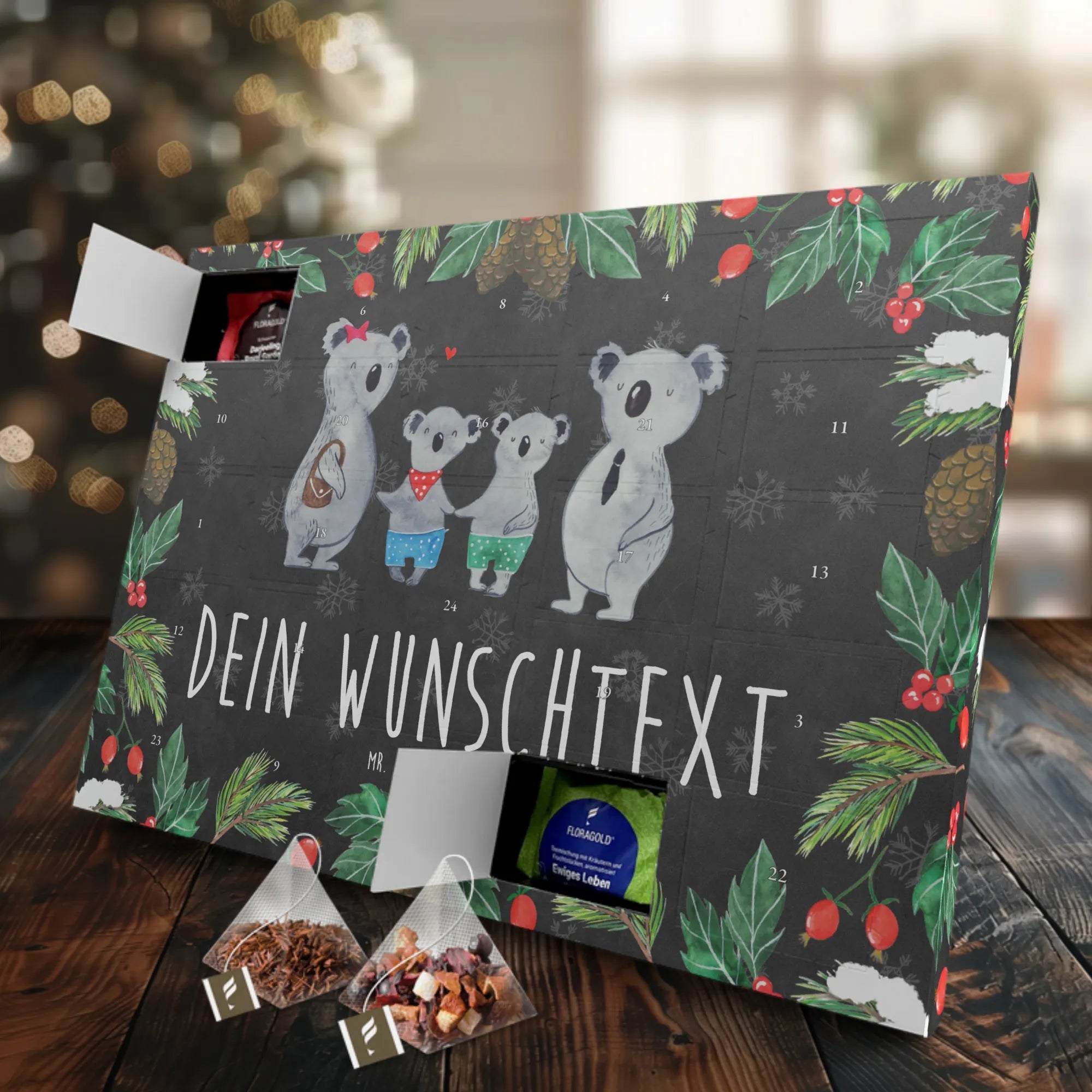 In unserer Familien Kollektion spiegelt sich die liebevolle Verbundenheit wider, die wir alle so dringend brauchen. Jeder Teebeutel für sich erzählt die kleine Geschichte unserer Koala-Familie und wie schön es ist, zusammen zu sein. Lass Dir diese besondere Gelegenheit nicht entgehen und bereite Deinen Liebsten eine Freude, die sie niemals vergessen werden. Unser personalisierter Tee Adventskalender mit dem Motiv 'Koala Familie zwei' ist mehr als nur ein Tee-Kalender – es ist ein Ausdruck von Liebe für die beste Familie der Welt!