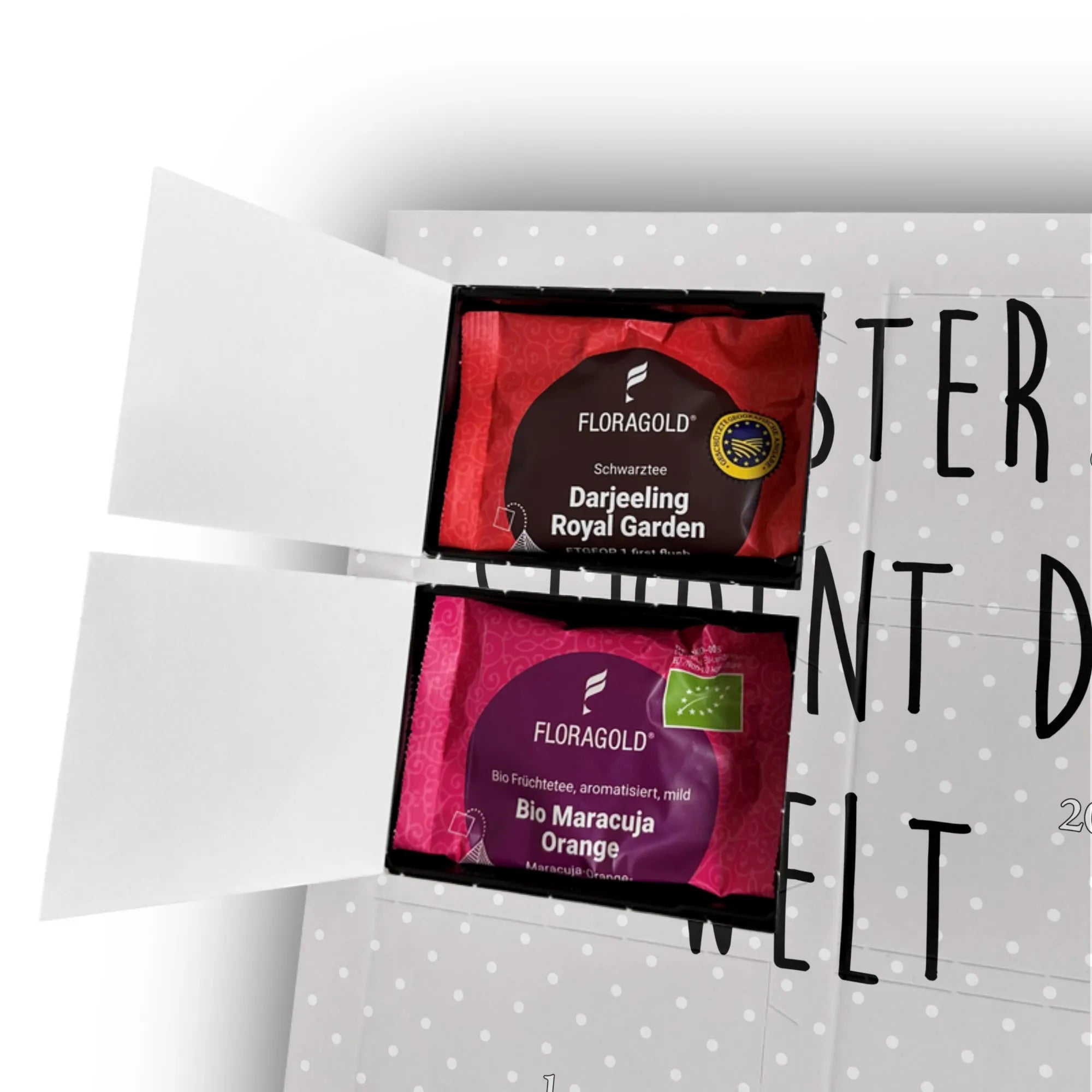 Jede der 24 Türchen verbirgt eine aufregende Tee-Sorte - von fruchtigen bis hin zu eleganten Schwarz- und Kräutertees. Die hochwertigen Pyramidenbeutel sind sorgfältig ausgewählt und bieten das perfekte Teeerlebnis.