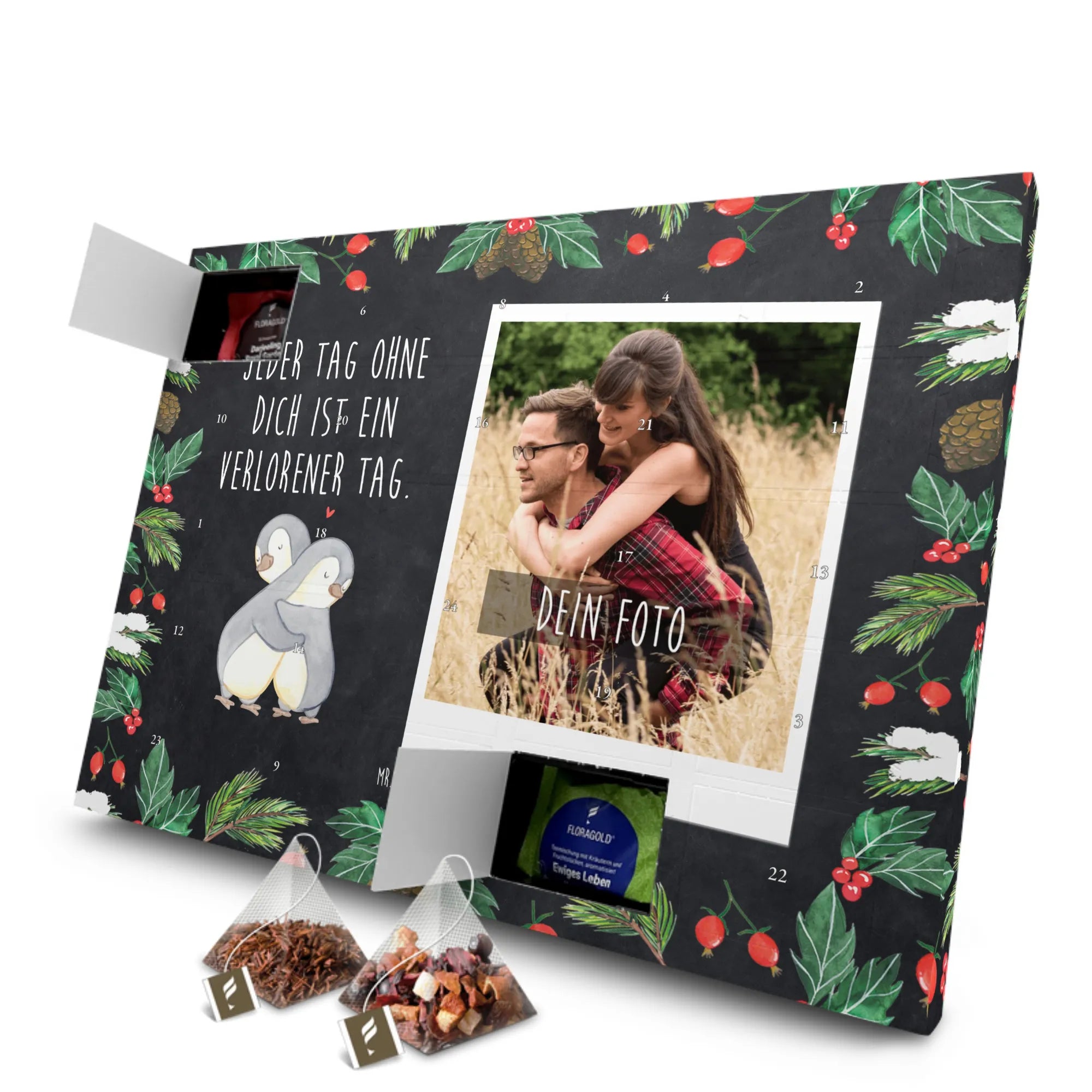 Der personalisierte Tee Foto Adventskalender "Pinguine Kuscheln" von Mr. & Mrs. Panda ist das perfekte Geschenk für alle Liebenden! Mit einem herzerwärmenden Motiv von zwei niedlichen Pinguinen, die sich innig umarmen, bringt dieser Adventskalender nicht nur Vorfreude auf die Weihnachtszeit, sondern symbolisiert auch eine tiefe Zuneigung und Verbundenheit.