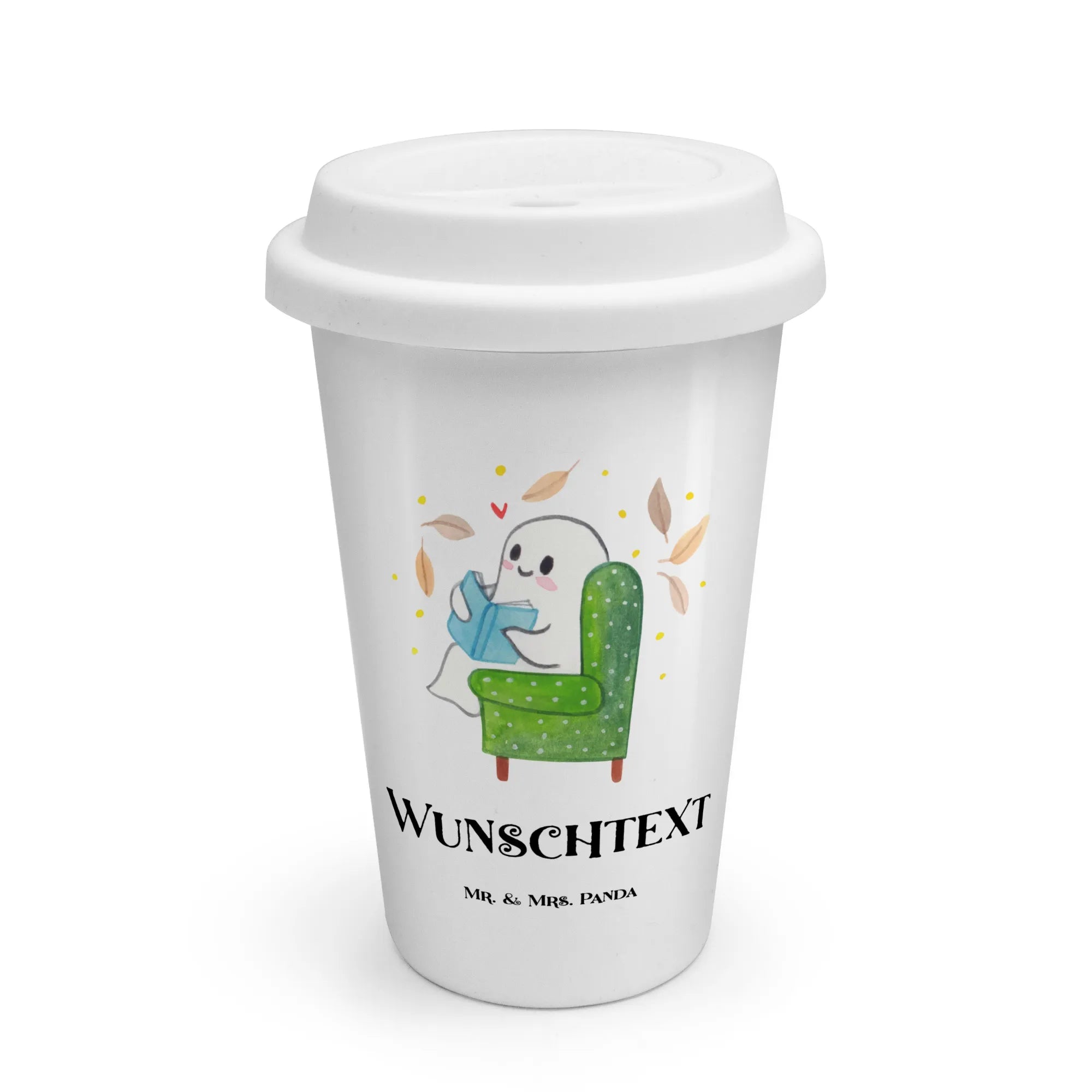 Stell dir vor: ein kuscheliger Herbstabend, du im Lieblingssessel und dein persönlicher To Go Becher mit Namen in der Hand. Unser Personalisierter To Go Becher „Gespenst Buch“ aus der Halloween Kollektion von Mr. & Mrs. Panda bringt genau dieses warme Gefühl zu dir. Das süße lesende Gespenst im grünen Sessel, das blaue Buch und das schwebende rote Herz schaffen eine liebevolle, herbstliche Atmosphäre – perfekt für Buchliebhaber und Gemütlichkeitsfans.