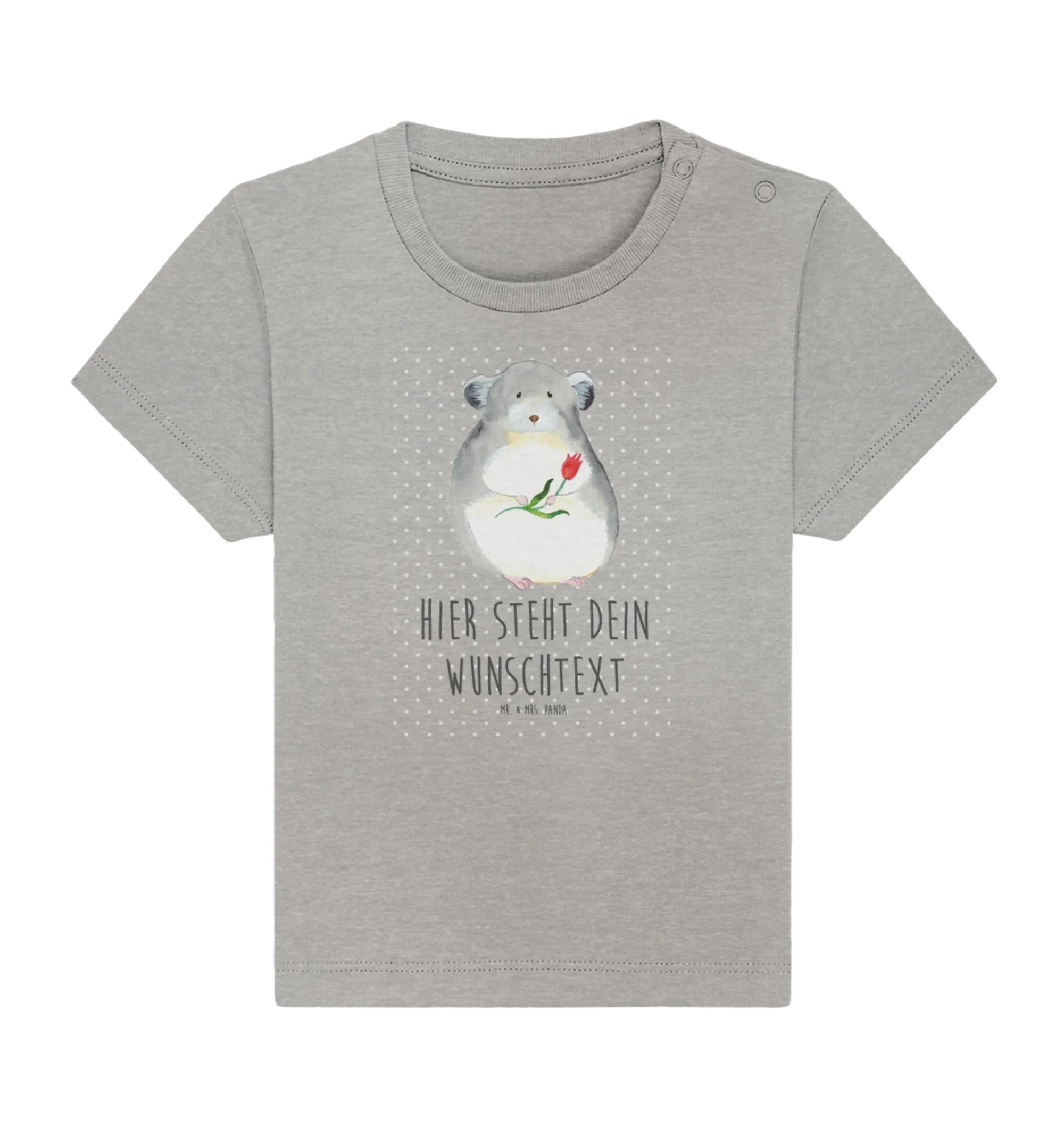 Beschenke also die kleinen Schätze in Deinem Leben mit diesem einzigartigen T-Shirt und verbreite gute Laune! Egal, ob zum Spielen, Krabbeln oder für unvergessliche Momente beim Familienausflug – dieses Shirt wird zum Lieblingsstück in der Garderobe Deines Kindes! Es ist nicht nur ein tolles Kleidungsstück, sondern auch eine wunderbare Erinnerung an glückliche Zeiten. Schenke Freude und liebevolle Erinnerungen mit dem personalisierten Baby T-Shirt "Chinchilla mit Blume" von Mr. & Mrs. Panda!