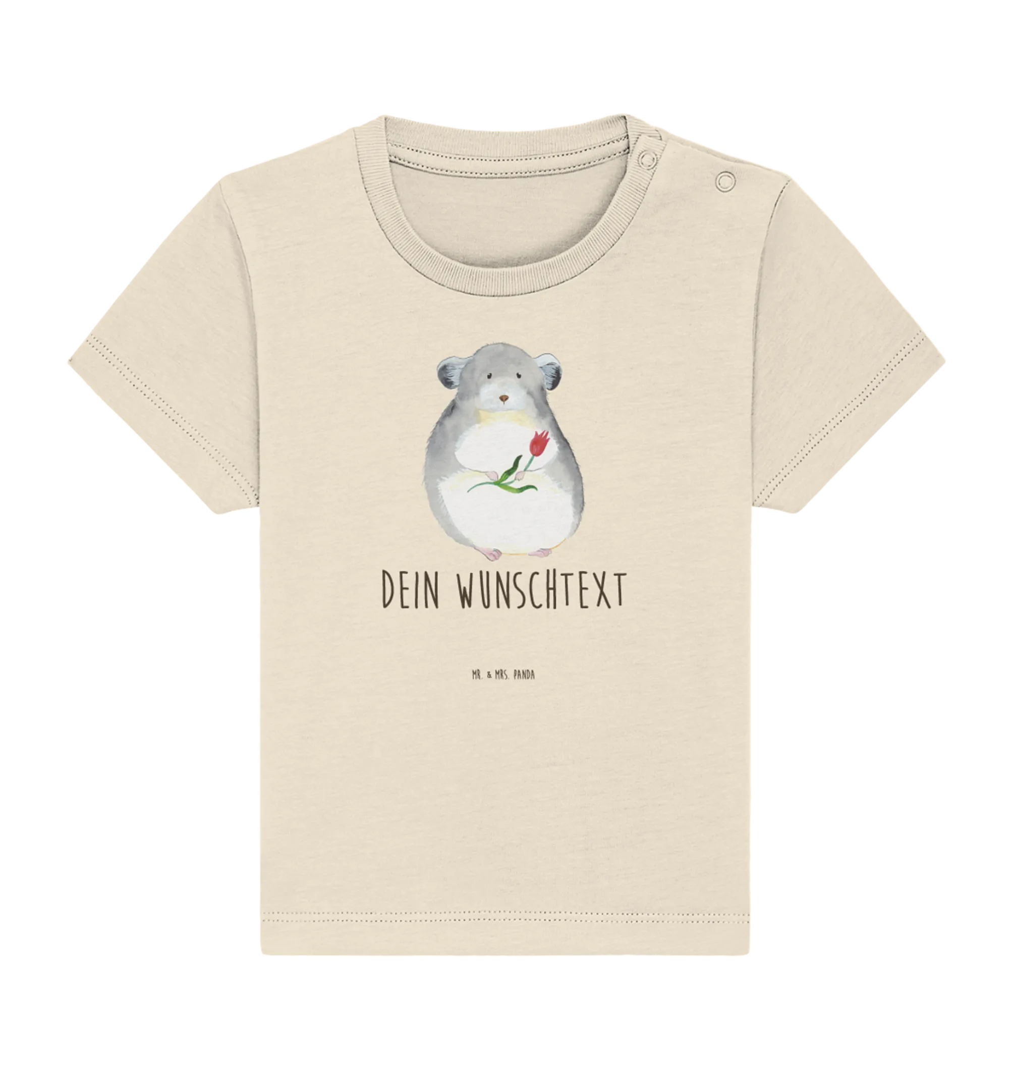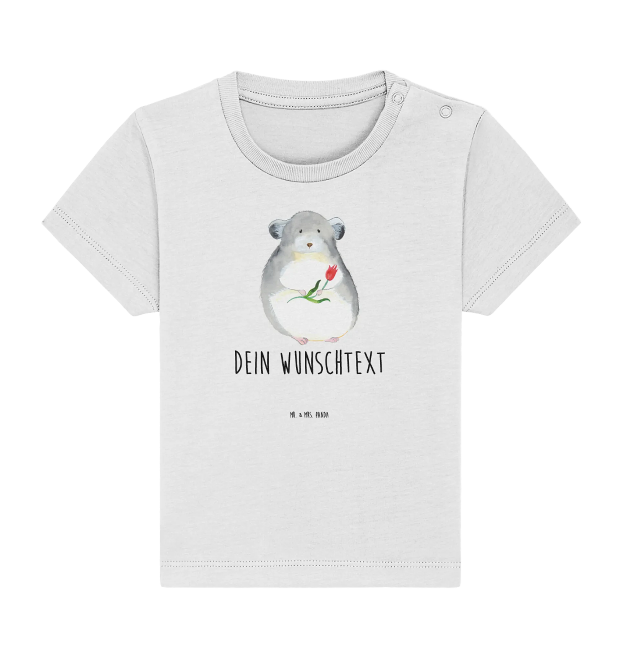 Du kannst dich dem niedlichen Chinchilla nicht entziehen, der dich mit großen Augen und einem Blumenstrauß in der Hand anschaut. Schon allein sein flauschiges Fell und seine niedliche Nase strahlen pure Herzenswärme aus. Das Design "Chinchilla mit Blume" von Mr. & Mrs. Panda bringt einen Hauch von Freude in den Kleiderschrank deines kleinen Lieblings.