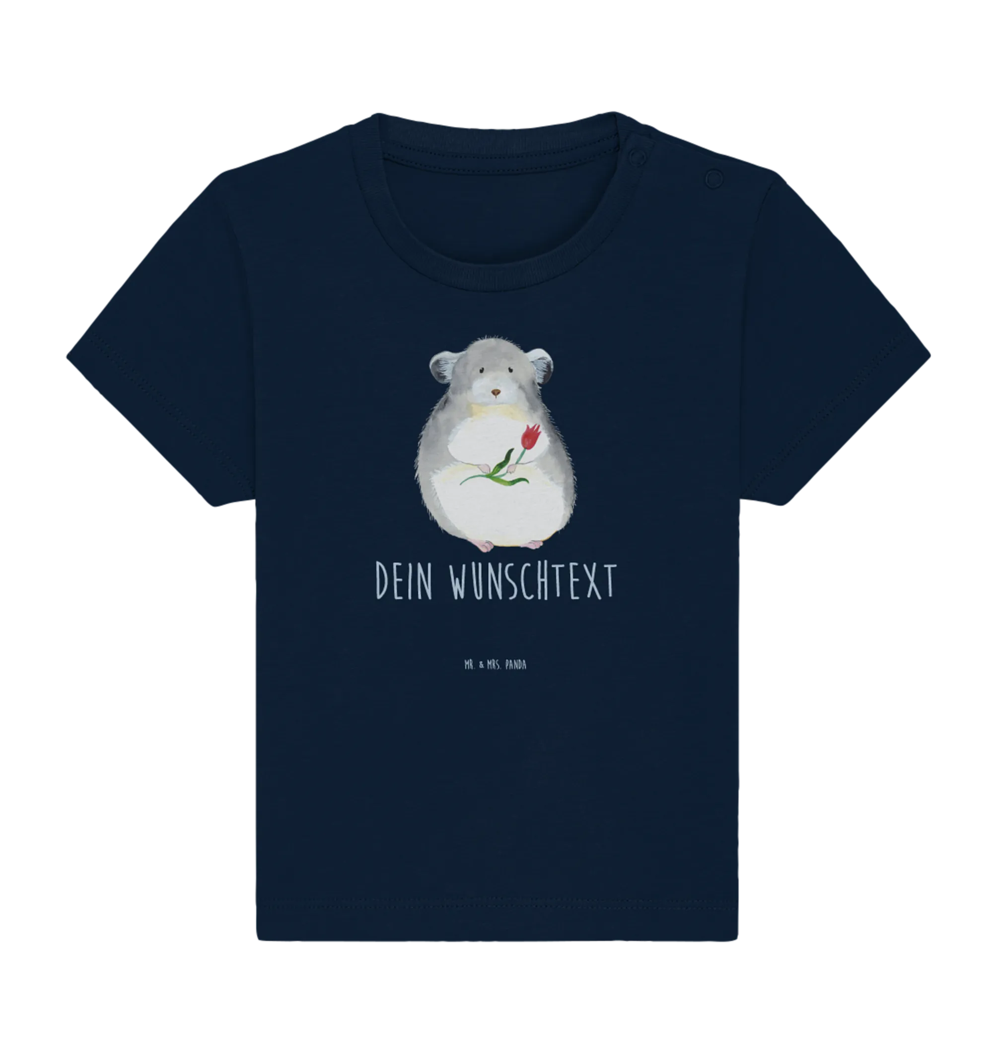 Das personalisierte Baby T-Shirt "Chinchilla mit Blume" von Mr. & Mrs. Panda ist der perfekte Begleiter für die Kleinsten. Dieses süße Shirt aus 100% Baumwolle und Öko Baumwolle im Farbton French Navy eignet sich ideal für Kinder im Alter von 12 bis 18 Monaten.