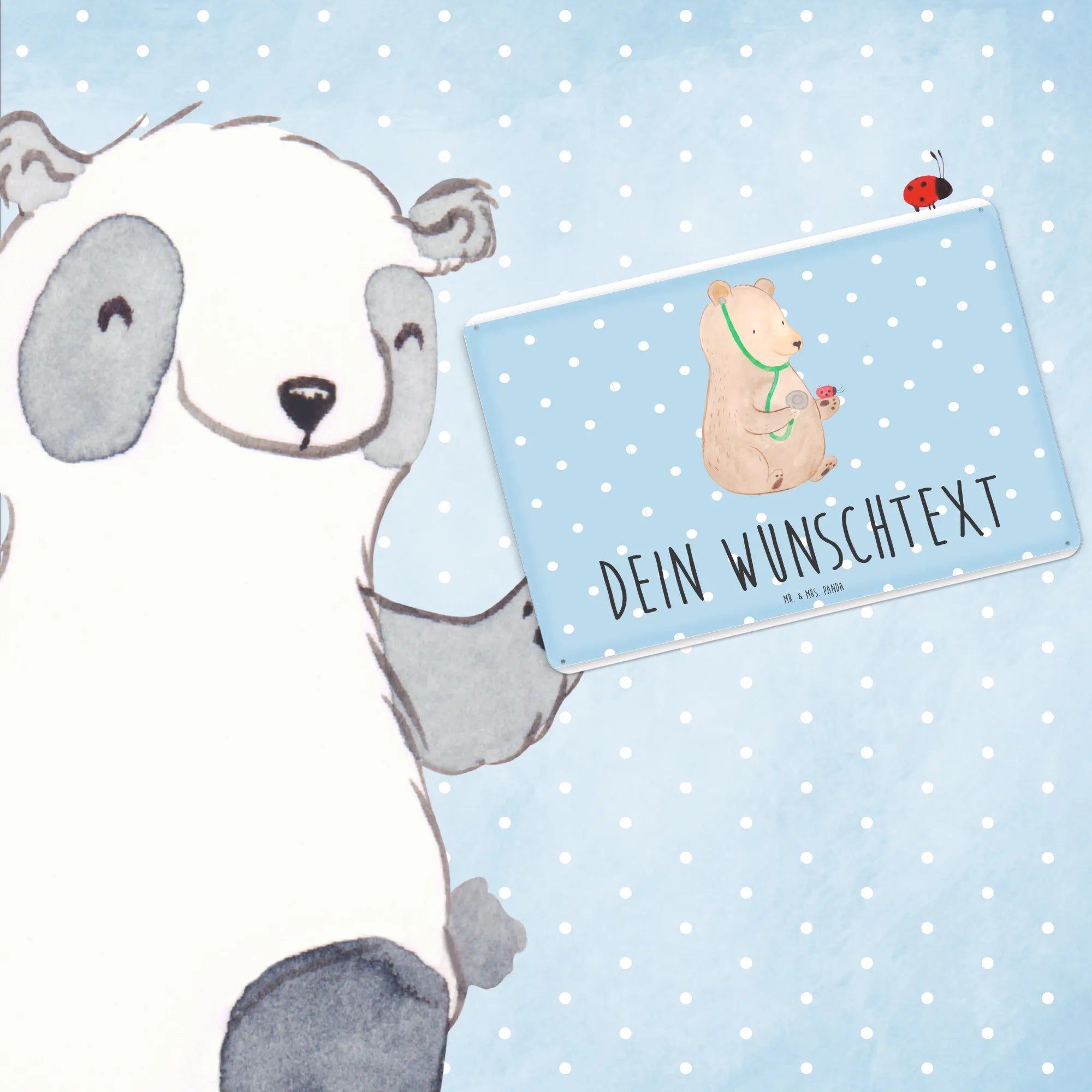 Das personalisierte Blechschild mit dem süßen Bären Arzt von Mr. & Mrs. Panda ist das perfekte Geschenk für allen medizinischen Fachleuten in deinem Leben! Stelle dir vor, wie ein ganz besonderer Arzt oder eine Ärztin bei der Arbeit von einem strahlenden Bären begleitet wird, der mit einem kleinen Marienkäfer spielt.