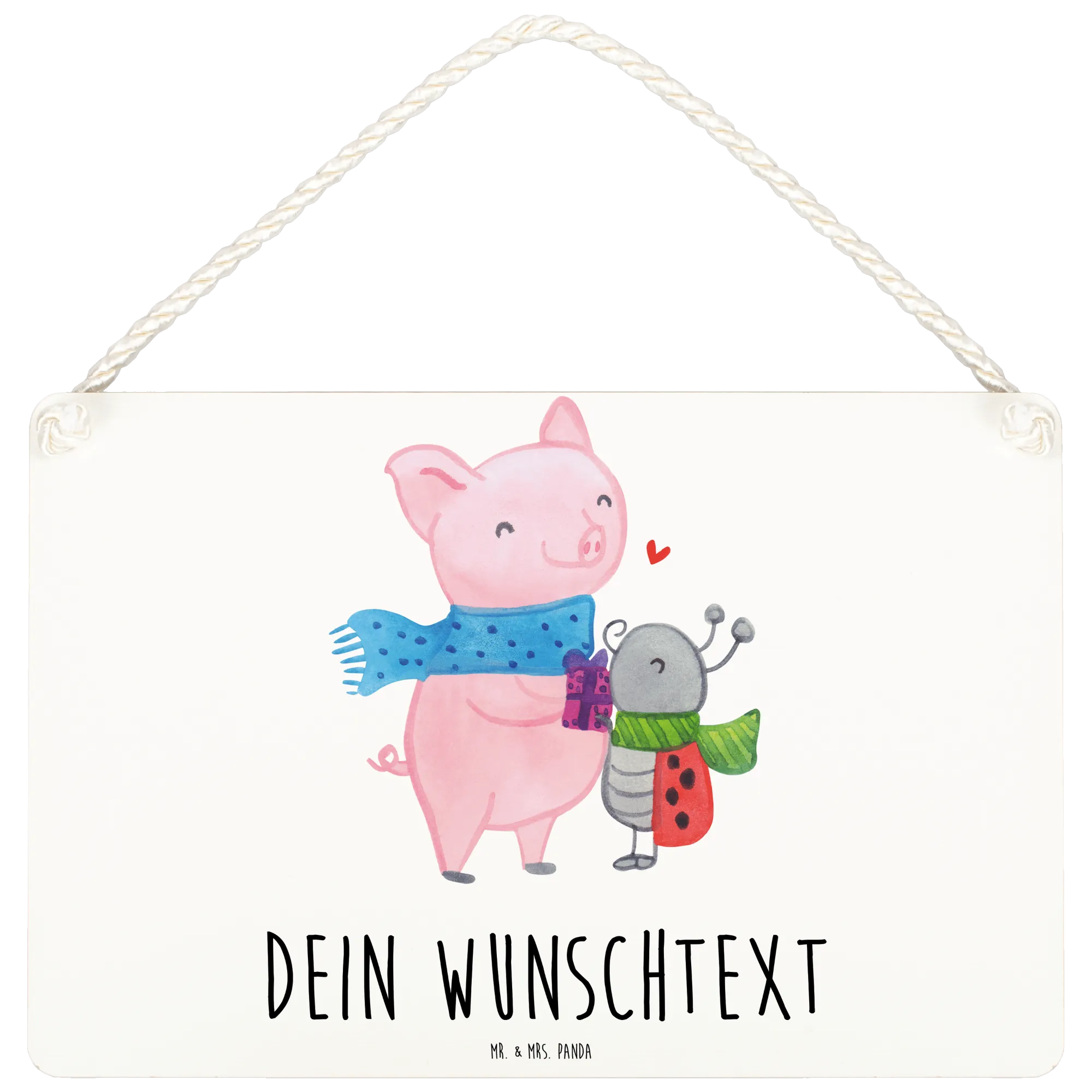 Die liebevoll handgezeichnete Illustration zeigt ein fröhliches Glühschwein mit einem luftigen blau gepunkteten Schal und Smörle, den süßesten Marienkäfer, der stolze Geschenke bringt. Dieses Schild ist nicht nur eine wundervolle Wand- oder Türdekoration, sondern bringt auch ein Lächeln auf die Gesichter der Beschenkten.