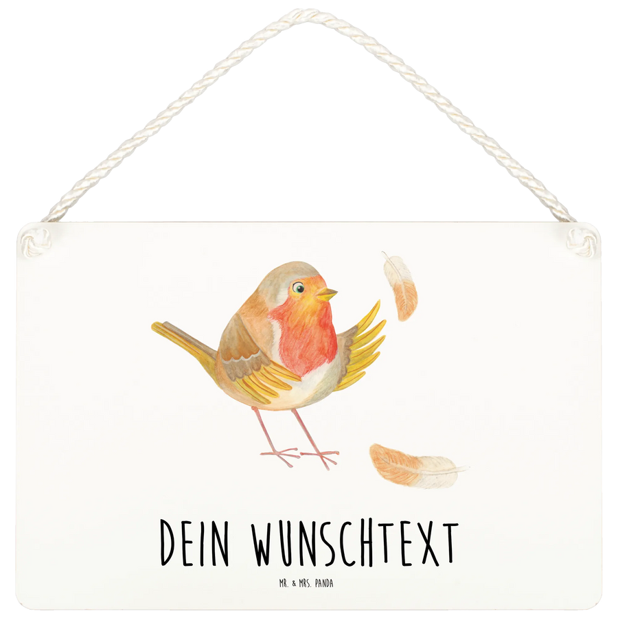 Personalisiertes Deko Schild Rotkehlchen mit Federn - DIN A6 - Weiß
