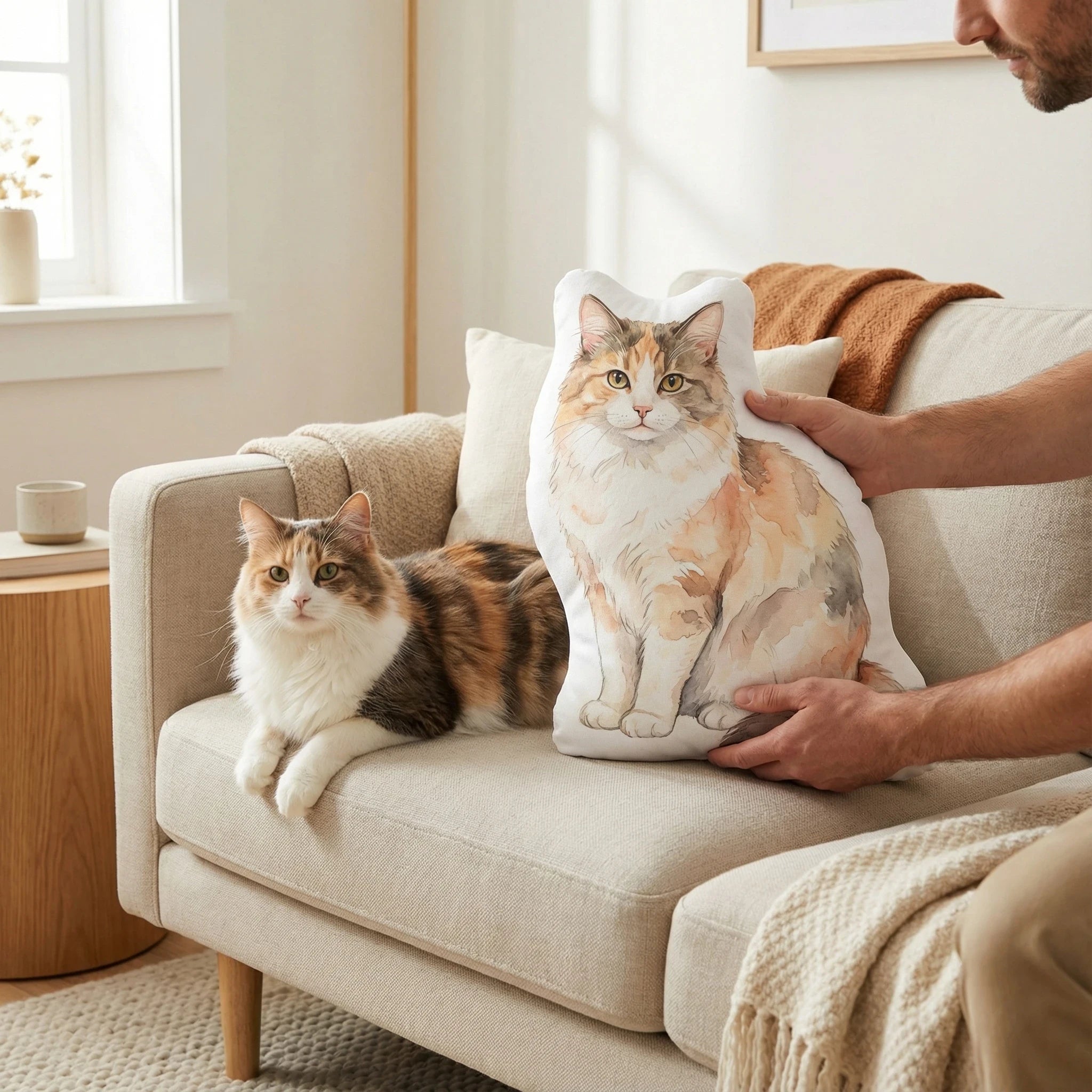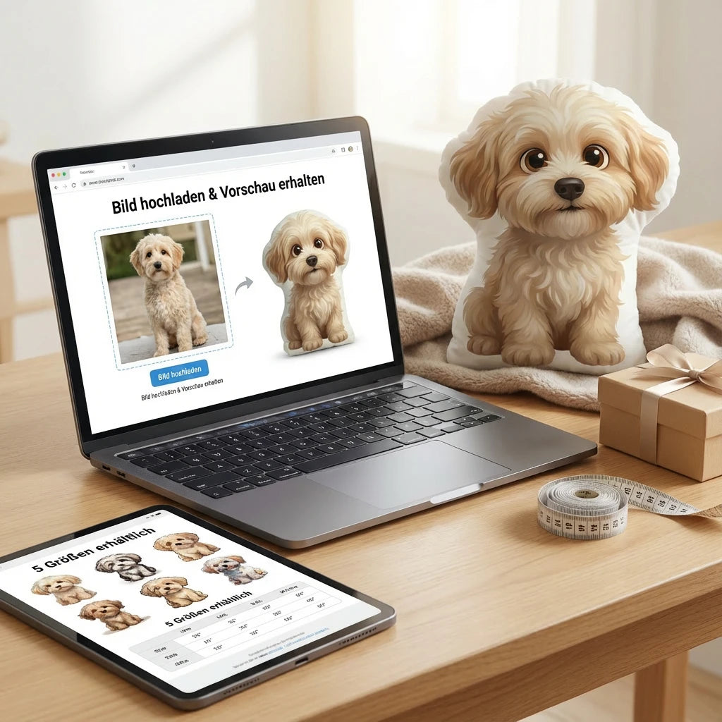 Lade einfach ein Foto deines Lieblings hoch und entdecke in der Live-Vorschau, wie daraus ein individuelles Formkissen entsteht – wähle dabei ganz nach Geschmack zwischen zauberhaftem Aquarell-Look, authentischer Bleistiftzeichnung oder einem liebevoll gestalteten Animationsfilm-Stil.