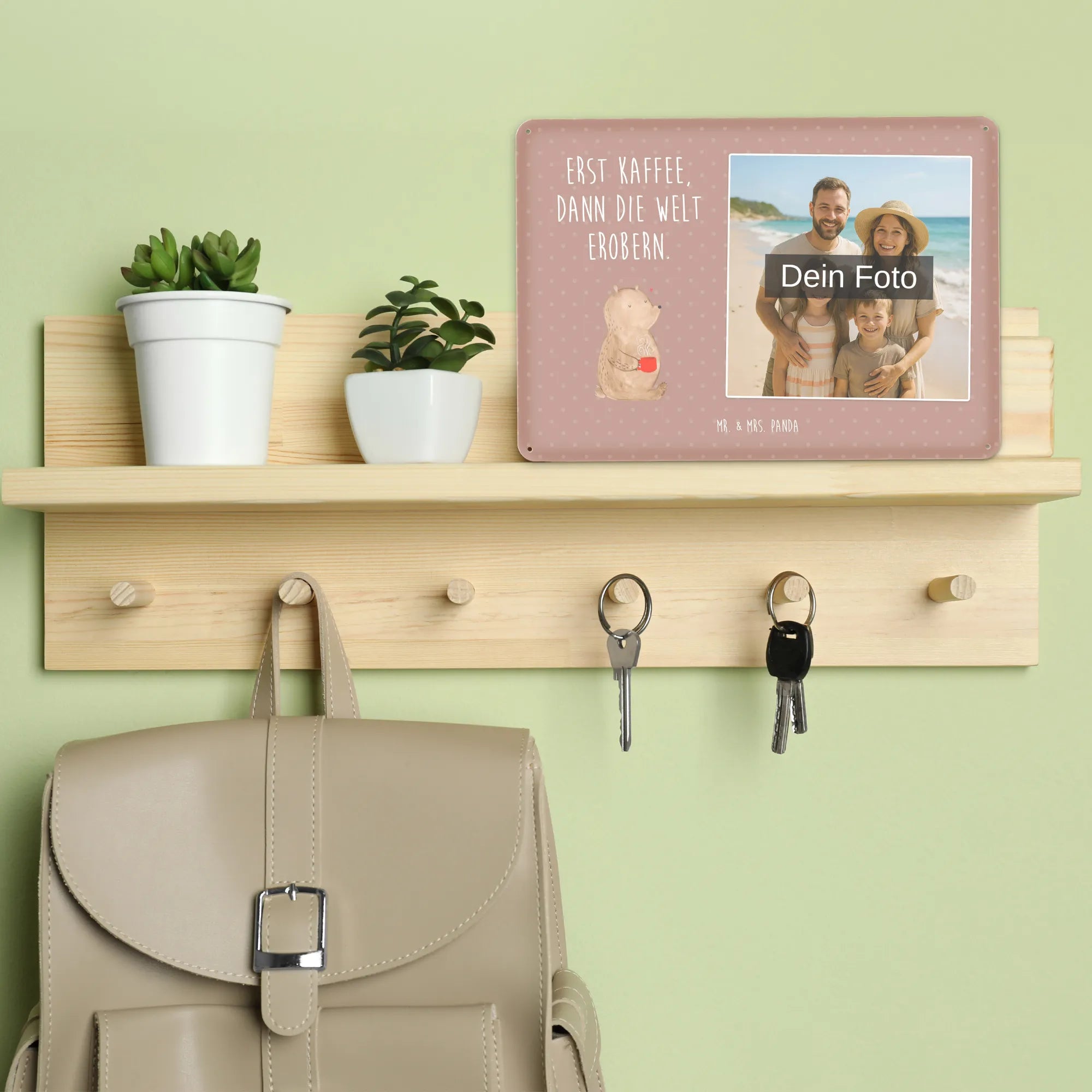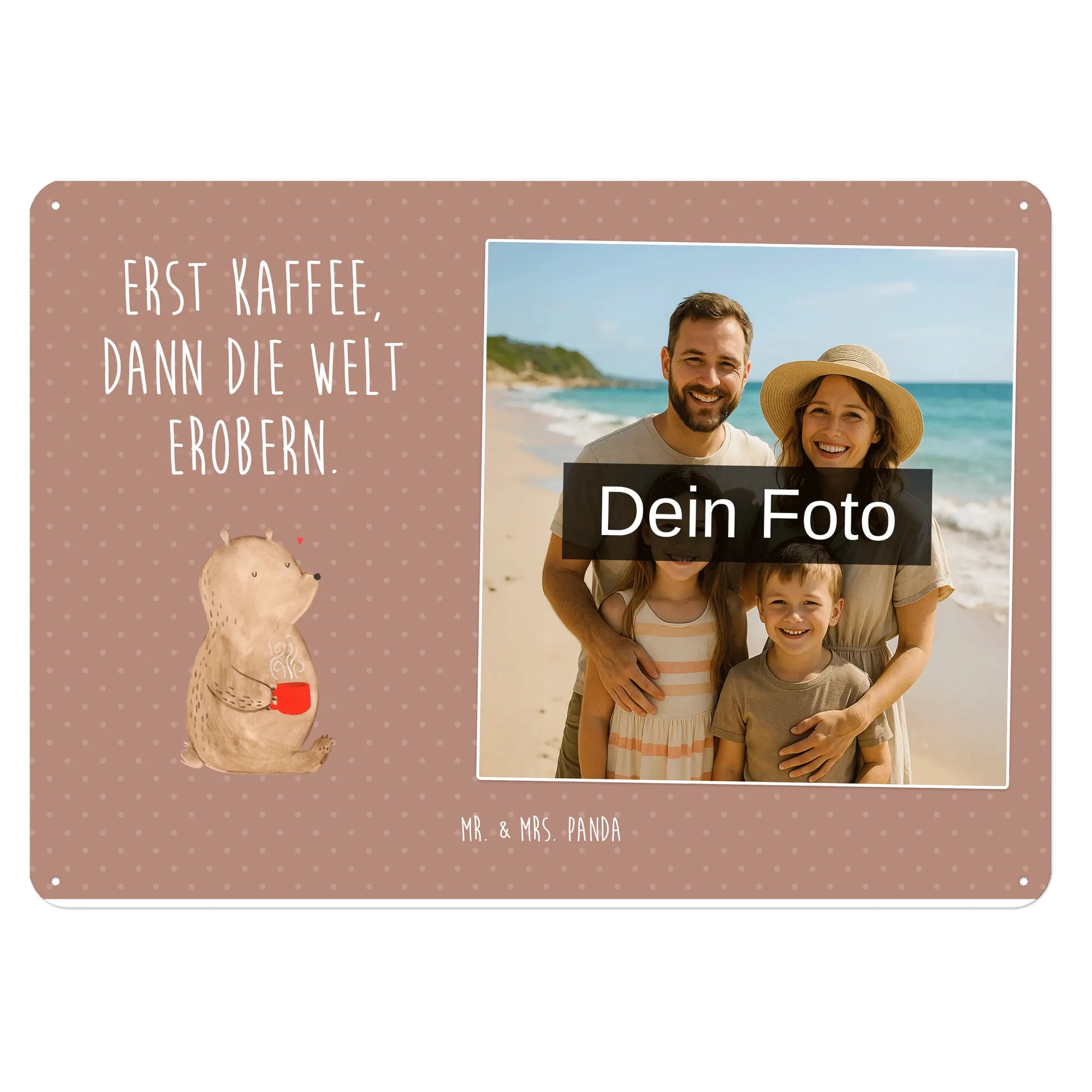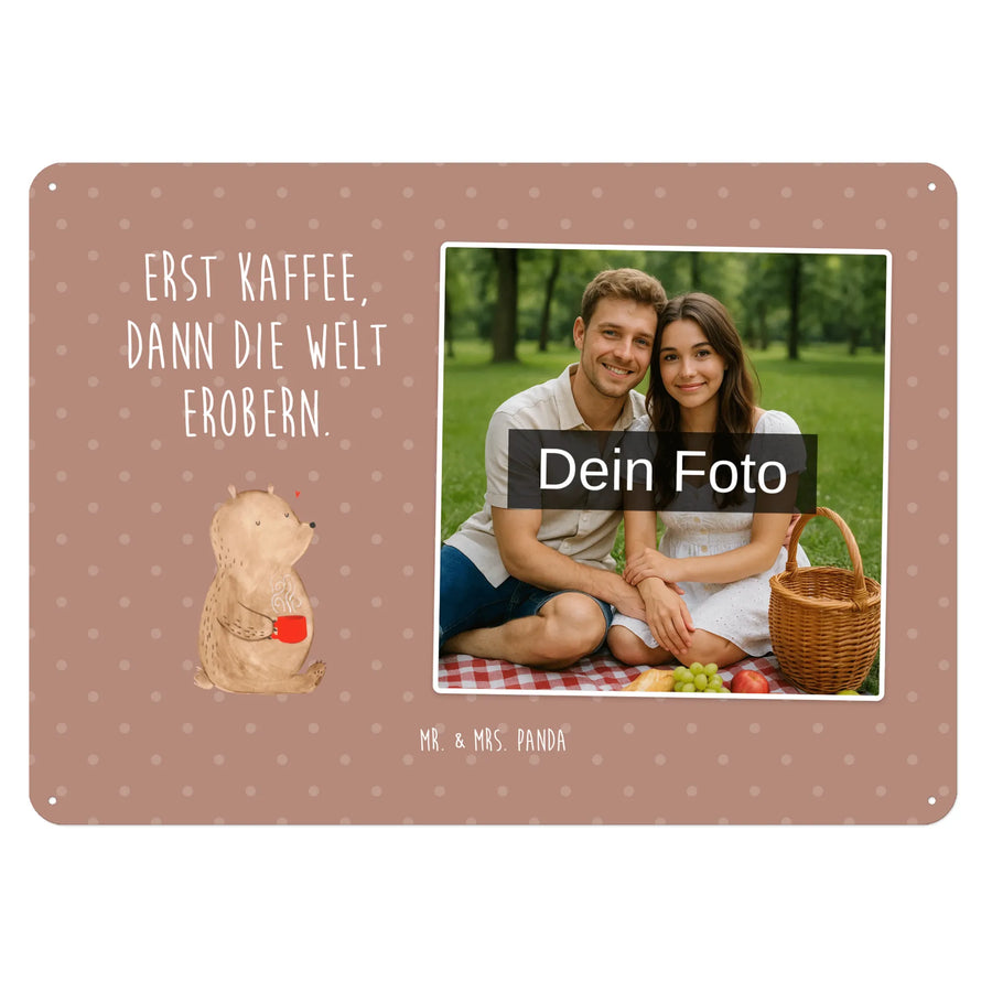 Personalisiertes Foto Blechschild Bär Kaffee - DIN A6 - Braun Pastell