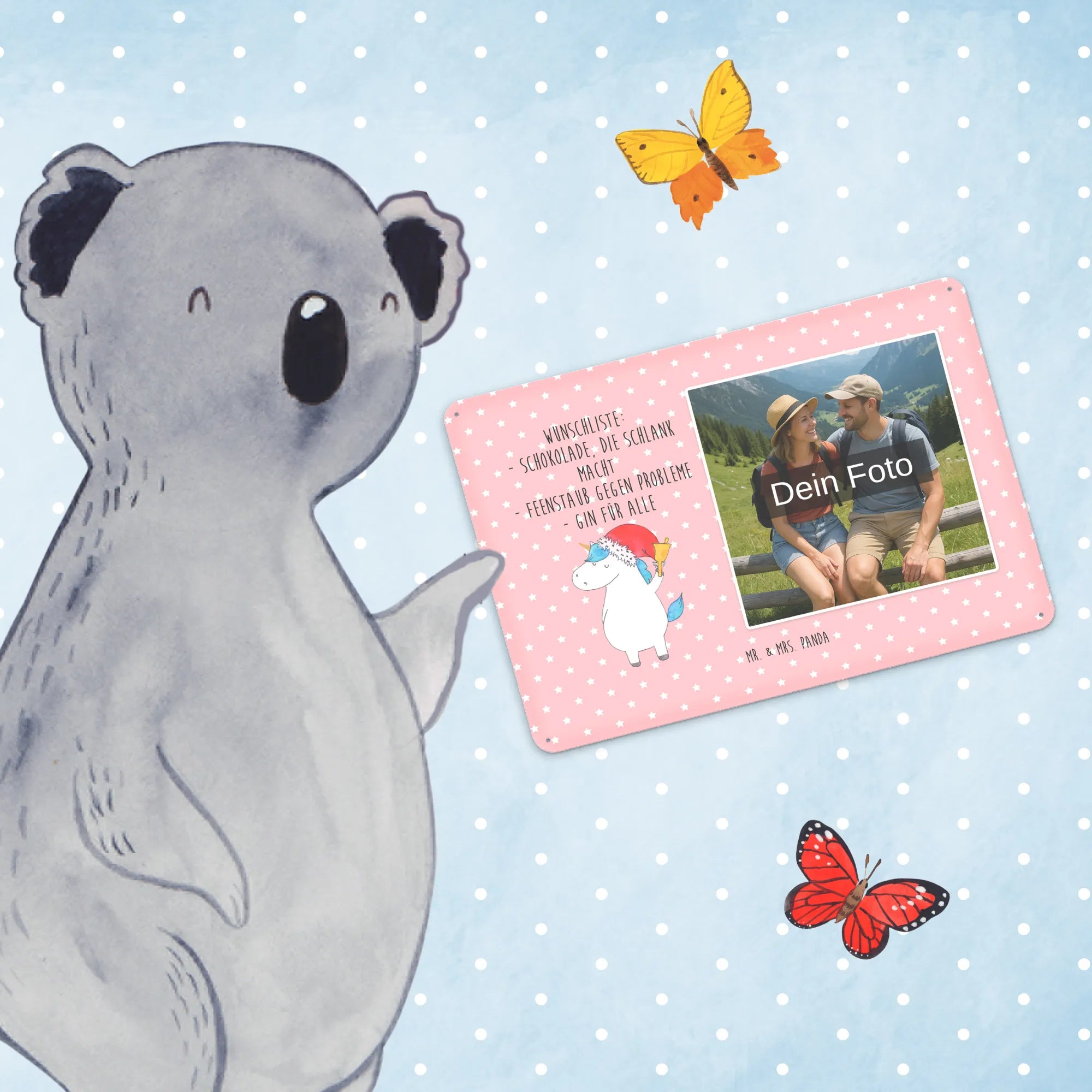 Gestalte dein persönliches Blechschild: Lade dein Foto hoch und kreiere ein einzigartiges Geschenk mit Mr. & Mrs. Panda – schnell gefertigt, liebevoll verpackt.